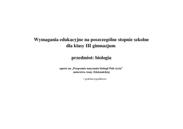 Wymagania edukacyjne na poszczególne stopnie szkolne dla klasy III gimnazjum przedmiot: biologia oparte na „Programie nauczania biologii Puls życia” autorstwa Anny Zdziennickiej 1 godzina tygodniowo I. Wymagania na poszczególne stopnie szkolne. Dział Lp. programu Ocena Dopuszczaj acy dostateczny dobry bardzo dobry Czym jest genetyka? Uczeń: • wymienia cechy gatunkowe i indywidualne podanych organizmów • wyjaśnia, że jego podobieństwo do rodziców jest wynikiem dziedziczenia cech Uczeń: • definiuje pojęcia „genetyka” oraz „zmienność organizmów” • rozpoznaje cechy dziedziczne i niedziedziczne • omawia zastosowania genetyki w różnych dziedzinach: medycynie, kryminalistyce, rolnictwie, archeologii • uzasadnia występowanie zmienności wśród ludzi Uczeń: Uczeń: • wskazuje różnice między cechami • dowodzi, że cechy organizmów gatunkowymi a indywidualnymi kształtują się dzięki materiałowi oraz podaje przykłady tych cech genetycznemu oraz są wynikiem wpływu środowiska • wyjaśnia, z czego wynika podobieństwo organizmów potomnych do rodzicielskich • wykonuje portfolio ukazujące jego w wypadku rozmnażania płciowego podobieństwo do dziadków i rodziców i bezpłciowego • wymienia źródła cech dziedzicznych i niedziedzicznych oraz podaje przykłady tych cech 2. Nośnik informacji genetycznej – DNA • wskazuje miejsca występowania DNA • wylicza elementy budujące DNA • określa rolę DNA jako nośnika informacji genetycznej • przedstawia budowę nukleotydu • wymienia nazwy zasad azotowych • wyjaśnia regułę komplementarności zasad • definiuje pojęcia: „gen” i „genom” • przedstawia budowę chromosomu • definiuje pojęcie „kariotyp” • omawia proces replikacji • porównuje budowę DNA z budową RNA • rozpoznaje na modelu lub ilustracji DNA i RNA • wykazuje konieczność związania DNA przez białka i powstania chromatyny w jądrze komórkowym • wyjaśnia, z czego wynika komplementarność zasad • określa różnice między genem a genomem • przedstawia graficznie regułę komplementarności zasad azotowych • wykonuje model DNA • uzasadnia konieczność zachodzenia procesu replikacji DNA przed podziałem komórki 3. Przekazywanie materiału genetycznego • wymienia nazwy poszczególnych podziałów komórkowych • podaje liczbę chromosomów w komórkach somatycznych i płciowych człowieka • wskazuje miejsce zachodzenia mitozy i mejozy w organizmie człowieka • definiuje pojęcia: „chromosomy homologiczne”, „komórki haploidalne”, „komórki diploidalne” • szacuje liczbę chromosomów w komórce haploidalnej, znając liczbę chromosomów w diploidalnej komórce danego organizmu • omawia znaczenie mitozy i mejozy • omawia przebieg mitozy i mejozy • omawia różnice między mitozą a mejozą • wyjaśnia znaczenie rekombinacji genetycznej • planuje i wykonuje dowolną techniką model podziału komórki 4. Odczytywanie informacji genetycznej • wyjaśnia pojęcia: „kod genetyczny”, „gen”, „kodon” • omawia znaczenie kodu genetycznego • omawia budowę kodonu i genu • wykazuje uniwersalność kodu genetycznego • omawia biosyntezę białek na podstawie ilustracji • odczytuje kolejność aminokwasów kodowanych przez dany fragment mRNA z tabeli kodu genetycznego • interpretuje schemat literowego zapisu kodonu i budowy nici kwasu nukleinowego • omawia badania Mendla • zapisuje genotypy homozygoty dominującej i recesywnej oraz heterozygoty • na schemacie krzyżówki genetycznej rozpoznaje genotyp oraz określa fenotyp rodziców i pokolenia potomnego • wykonuje krzyżówki genetyczne dotyczące dziedziczenia jednego genu • ocenia znaczenie prac Mendla dla rozwoju genetyki • interpretuje krzyżówki genetyczne, używając określeń „homozygota”, „heterozygota”, „cecha dominująca”, „cecha recesywna” • omawia prawo czystości gamet • przewiduje cechy osobników potomnych na podstawie prawa czystości gamet • tworzy krzyżówki genetyczne dotyczące dziedziczenia określonej cechy i przewiduje genotypy oraz fenotypy potomstwa I. Genetyka 1. Temat 5. Dziedziczenie cech • wskazuje kodon na modelu lub ilustracji DNA • rozpoznaje u ludzi cechy dominujące i recesywne Dział Lp. programu Ocena Dopuszczaj acy dostateczny dobry bardzo dobry Dziedziczenie płci u człowieka Uczeń: • podaje liczbę chromosomów występujących w komórce diploidalnej człowieka • rozpoznaje kariogram człowieka • wskazuje na kariogramie człowieka chromosomy płci Uczeń: • wyjaśnia zasadę dziedziczenia płci • wymienia przykłady chorób dziedzicznych sprzężonych z płcią • określa cechy chromosomów X i Y Uczeń: • wyjaśnia mechanizm ujawniania się cech recesywnych sprzężonych z płcią • wykonuje krzyżówkę genetyczną dotyczącą dziedziczenia hemofilii oraz daltonizmu Uczeń: • interpretuje krzyżówkę genetyczną dotyczącą dziedziczenia hemofilii oraz daltonizmu • ocenia znaczenie poznania budowy ludzkiego DNA 7. Mechanizm dziedziczenia cech u człowieka • wymienia cztery główne grupy krwi występujące u ludzi • określa konsekwencje wystąpienia konfliktu serologicznego • rozpoznaje grupy krwi na podstawie zapisu genotypów osób • omawia sposób dziedziczenia grup krwi • omawia sposób dziedziczenia czynnika Rh • wymienia przykłady cech zależnych od wielu genów oraz od środowiska • wyjaśnia, w jaki sposób środowisko wpływa na rozwój osobowości • ustala grupy krwi dzieci, znając grupy krwi ich rodziców • wykonuje krzyżówkę genetyczną dotyczącą dziedziczenia grup krwi • określa możliwość wystąpienia konfliktu serologicznego • ocenia wpływ środowiska na kształtowanie się cech • przewiduje wpływ prowadzenia określonego trybu życia na powstawanie chorób genetycznych 8. Mutacje • wyjaśnia pojęcie „mutacja” • wylicza czy