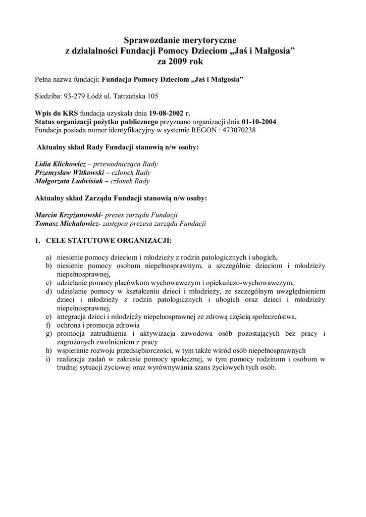 Sprawozdanie merytoryczne z działalności Fundacji Pomocy Dzieciom „Jaś i Małgosia” za 2009 rok Pełna nazwa fundacji: Fundacja Pomocy Dzieciom „Jaś i Małgosia” Siedziba: 93-279 Łódź ul. Tatrzańska 105 Wpis do KRS fundacja uzyskała dnia 19-08-2002 r. Status organizacji pożytku publicznego przyznano organizacji dnia 01-10-2004 Fundacja posiada numer identyfikacyjny w systemie REGON : 473070238 Aktualny skład Rady Fundacji stanowią n/w osoby: Lidia Klichowicz – przewodnicząca Rady Przemysław Witkowski – członek Rady Małgorzata Ludwisiak – członek Rady Aktualny skład Zarządu Fundacji stanowią n/w osoby: Marcin Krzyżanowski- prezes zarządu Fundacji Tomasz Michałowicz- zastępca prezesa zarządu Fundacji 1. CELE STATUTOWE ORGANIZACJI: a) niesienie pomocy dzieciom i młodzieży z rodzin patologicznych i ubogich, b) niesienie pomocy osobom niepełnosprawnym, a szczególnie dzieciom i młodzieży niepełnosprawnej, c) udzielanie pomocy placówkom wychowawczym i opiekuńczo-wychowawczym, d) udzielanie pomocy w kształceniu dzieci i młodzieży, ze szczególnym uwzględnieniem dzieci i młodzieży z rodzin patologicznych i ubogich oraz dzieci i młodzieży niepełnosprawnej, e) integracja dzieci i młodzieży niepełnosprawnej ze zdrową częścią społeczeństwa, f) ochrona i promocja zdrowia g) promocja zatrudnienia i aktywizacja zawodowa osób pozostających bez pracy i zagrożonych zwolnieniem z pracy h) wspieranie rozwoju przedsiębiorczości, w tym także wśród osób niepełnosprawnych i) realizacja zadań w zakresie pomocy społecznej, w tym pomocy rodzinom i osobom w trudnej sytuacji życiowej oraz wyrównywania szans życiowych tych osób. 2. ZAKRES PROWADZONEJ DZIAŁALNOŚCI STATUTOWEJ: Imprezy okolicznościowe i turnusy rehabilitacyjne, działalność statutowa: Szkoła Życia - Radni łódzkiej Rady Miejskiej zasiedli w ławkach z uczniami naszej szkoły i poprowadzili z nimi zajęcia. Wszystko po to, żeby nie zapomnieć na czym polega prawdziwe życie. W ławkach zasiedli: Patrycja Wójcik i Rafał Reszpondek (PO), Ewa Majchrzak (Lewica) oraz Mariusz Bogacz (PiS). Była telewizja, fotoreporterzy i dziennikarze. Dzieciaki były zachwycone! Albertiana 2009 - Wzięliśmy udział w Albertianie. Zajęliśmy 4 miejsce. Przedstawienie w Teatrze im. S. Jaracza - Nasi niepełnosprawni aktorzy wystąpili w prawdziwym teatrze. Na deskach Teatru im. S. Jaracza zaprezentowali trzy etiudy pod wspólnym tytułem "Nie oceniamy". Etiudy przygotowali Józek Hamkało i Kasia Kreft. Przedstawienie w gimnazjum - Otrzymaliśmy zaproszenie z Gimnazjum nr 37 dla naszego teatru. Wystąpiliśmy z przedstawieniem "Zwolnieni z życia". Występ w Warszawie - Wystąpiliśmy w Warszawie z naszym przedstawieniem. Muzycy z Peru - Odwiedzili nas muzycy grający oryginalna muzykę z Peru. Ku ogromnej radości naszych podopiecznych wystąpił dla nich pan Mirko Fernandez ze swoim zespołem Kurakas. Piramida Dobrej Woli - Jak co roku wzięliśmy udział w Piramidzie Dobrej Woli. Zaprezentowaliśmy nasze przedstawienie. IV Wojewódzka Olimpiada Osób Niepełnosprawnych Intelektualnie - Wzięliśmy udział w olimpiadzie w Łasku. Wszyscy wspaniale się bawili. Zdobyliśmy też 3 medale: złoty, srebrny i brązowy. IV Zlot na Spadkowej - Wzięliśmy udział w imprezie "Olimpiady, Olimpiady". Piknik z Jasiem i Małgosią – Zorganizowaliśmy piknik, na którym dobrze bawili się wszyscy nasi podopieczni, ich rodzice oraz okoliczni mieszkańcy. Były konkursy sportowe, malowanie twarzy, pieczona kiełbasa i kaszanka, i wiele innych atrakcji Do tańca przygrywał zespół peruwiańskich muzyków Kurakas z panem Mirko Fernandezem na czele. Strażacy prezentowali wóz i sprzęt, motocykliści - swoje jednoślady, a podopieczni fundacyjnych warsztatów terapii zajęciowej - swoje dzieła. "Jaś i Małgosia" w Ameryce - Fundacja Jaś i Małgosia nawiązała współpracę z amerykańską fundacją Best Buddies założoną przez Anthony’ego Kennedy. Best Buddies to fundacja, która pomaga osobom niepełnosprawnym umysłowo nawiązać przyjaźnie z ludźmi zdrowymi. Organizację założył Anthony Kennedy Shriver zainspirowany sytuacją swojej niepełnosprawnej, samotnej cioci. Rodzina Kennedy’ch od dawna była zaangażowana w pomoc osobom niepełnosprawnym umysłowo. Siostra Johna F. Kennedy’ego, prezydenta Stanów Zjednoczonych, zainicjowała organizację Olimpiad Specjalnych. W czerwcu 2008 r. Anthony Kennedy Shriver przyjechał do Polski. Spotkał się z prezydentową Marią Kaczyńską i wyraził chęć otwarcia filii swojej organizacji w Polsce. Poszukiwania partnera trwały rok, po czym strona amerykańska zaproponowała współpracę Fundacji Jaś i Małgosia z Łodzi. Zostaliśmy zaproszeni do Stanów. Wzięliśmy udział w konwencji na 20-lecie Best Buddies, zorganizowanej w Bloomington w stanie Indiana. I turnus - Jastrzębia Góra - W tym roku na pierwszy turnus pojechaliśmy do Jastrzębiej Góry. Całe dnie leżeliśmy na plaży, wieczorami chodziliśmy na spacery i na tańce. Byliśmy też na wycieczce na Helu. Oczywiście nie mogło też zabraknąć pieczenia kiełbasek na ognisku. Park integracji - Rozpoczęła się budowa Parku Jasia i Małgosi - pierwszego w Polsce parku integracji. Wstęp na teren parku będzie bezpłatny. II turnus - Ustronie Morskie – wyjechaliśmy na II turnus do Ustronia morskiego. Zielona Szkoła w Juracie - Byliśmy na Zielonej Szkole w Juracie. Wybraliśmy się na wycieczkę do Jastarni i do Juraty. Zwiedzaliśmy zabytkową kaszubską chatę, spacerowaliśmy po molo. Zorganizowaliśmy ognisko integracyjne. zwiedzaliśmy Oceanarium w Gdyni , obejrzeliśmy „Dar Młodzieży” i ORP „Błyskawica”). Wybraliśmy się do Fokarium na Helu. Chodziliśmy nad morze i obserwowaliśmy faunę i florę Półwyspu Helskiego. Uczestniczyliśmy w zajęciach „Edukacja przez ruch”. Podziękowaliśmy za 1% - Otrzymaliśmy rekordowy 1 proc. 50 tysięc