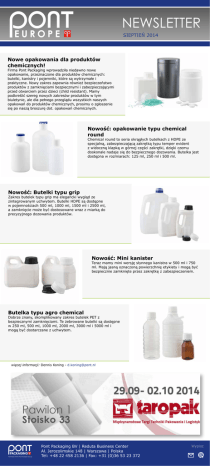 NEWSLETTER SIEPTIEŃ 2014 Nowe opakowania dla produktów chemicznych! Firma Pont Packaging wprowadziła niedawno nowe opakowanie, przeznaczone dla produktów chemicznych: butelki, kanistry i pojemniki, które są wytrzymałe i praktyczne. Nowy zakres zapewnia również bezpieczeństwo produktów z zamknięciami bezpiecznymi i zabezpieczającymi przed otwarciem przez dzieci (child resistant). Mamy podkreślić szereg nowych zakresów produktów w tym biuletynie, ale dla pełnego przeglądu wszystkich naszych opakowań do produktów chemicznych, prosimy o zgłoszenie się po naszą broszurę dot. opakowań chemicznych. Nowość: opakowanie typu chemical round Chemical round to seria okrągłych butelkach z HDPE ze specjalną, zabezpieczającą zakrętką typu temper evident z widoczną klapką w górnej części zakrętki, dzięki czemu doskonale nadaje się do bezpiecznego dozowania. Butelka jest dostępna w rozmiarach: 125 ml, 250 ml i 500 ml. Nowość: Butelki typu grip Zakres butelek typu grip ma elegancki wygląd ze zintegrowanym uchwytem. Butelki HDPE są dostępne w pojemnościach 500 ml, 1000 ml, 1500 ml i 2500 ml, a zamknięcie może być dostosowane wraz z miarką do precyzyjnego dozowania produktów. Nowość: Mini kanister Teraz mamy mini wersję słynnego kanistra w 500 ml i 750 ml. Mają jasną oznaczoną powierzchnię etykiety i mogą być bezpiecznie zamknięte przez zakrętkę z zabezpieczeniem. Butelka typu agro chemical Dobrze znany, skomplikowany zakres butelek PET z bezpiecznymi zamknięciami. Te żebrowane butelki są dostępne w 250 ml, 500 ml, 1000 ml, 2000 ml, 3000 ml i 5000 ml i mogą być dostarczane z uchwytem. więcej informacji: Dennis Koning - [email protected] member of the Pont Europe Group Pont Packaging BV | Reduta Business Center Al. Jerozolimskie 148 | Warszawa | Polska Tel: +48 22 458 2136 | Fax: +31 (0)36 53 23 372 Wypisz