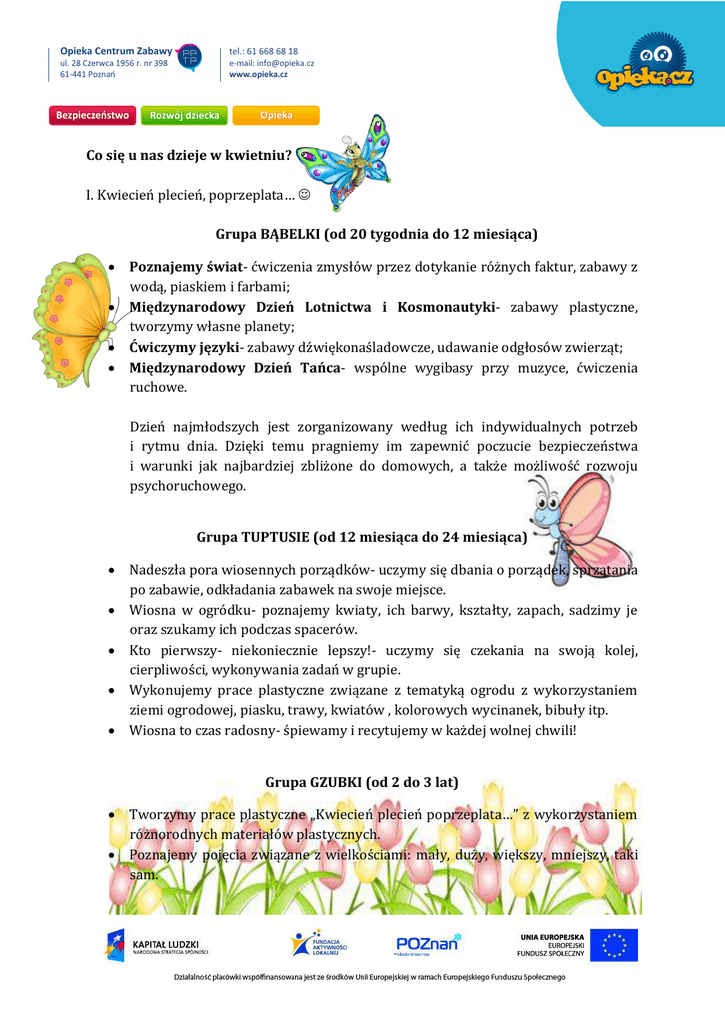 Opieka Centrum Zabawy tel.: 61 668 68 18 ul. 28 Czerwca 1956 r. nr 398 61-441 Poznań e-mail: [email protected] www.opieka.cz Co się u nas dzieje w kwietniu? I. Kwiecień plecień, poprzeplata… Grupa BĄBELKI (od 20 tygodnia do 12 miesiąca) Poznajemy świat- ćwiczenia zmysłów przez dotykanie różnych faktur, zabawy z wodą, piaskiem i farbami; Międzynarodowy Dzień Lotnictwa i Kosmonautyki- zabawy plastyczne, tworzymy własne planety; Ćwiczymy języki- zabawy dźwiękonaśladowcze, udawanie odgłosów zwierząt; Międzynarodowy Dzień Tańca- wspólne wygibasy przy muzyce, ćwiczenia ruchowe. Dzień najmłodszych jest zorganizowany według ich indywidualnych potrzeb i rytmu dnia. Dzięki temu pragniemy im zapewnić poczucie bezpieczeństwa i warunki jak najbardziej zbliżone do domowych, a także możliwość rozwoju psychoruchowego. Grupa TUPTUSIE (od 12 miesiąca do 24 miesiąca) Nadeszła pora wiosennych porządków- uczymy się dbania o porządek, sprzątania po zabawie, odkładania zabawek na swoje miejsce. Wiosna w ogródku- poznajemy kwiaty, ich barwy, kształty, zapach, sadzimy je oraz szukamy ich podczas spacerów. Kto pierwszy- niekoniecznie lepszy!- uczymy się czekania na swoją kolej, cierpliwości, wykonywania zadań w grupie. Wykonujemy prace plastyczne związane z tematyką ogrodu z wykorzystaniem ziemi ogrodowej, piasku, trawy, kwiatów , kolorowych wycinanek, bibuły itp. Wiosna to czas radosny- śpiewamy i recytujemy w każdej wolnej chwili! Grupa GZUBKI (od 2 do 3 lat) Tworzymy prace plastyczne „Kwiecień plecień poprzeplata…” z wykorzystaniem różnorodnych materiałów plastycznych. Poznajemy pojęcia związane z wielkościami: mały, duży, większy, mniejszy, taki sam. Opieka Centrum Zabawy tel.: 61 668 68 18 ul. 28 Czerwca 1956 r. nr 398 61-441 Poznań e-mail: [email protected] www.opieka.cz Zabawy pantomimiczne (co wyraża moja mina-określanie i odtwarzanie nastrojów twarzy dzieci przedstawionych na obrazkach). Przypomnienie zasad dotyczących bezpieczeństwa na drodze. Nauka wierszyka "Czerwone –stój, Zielone-idź”. Zabawy w ogrodników - wspólne sianie wybranej roślinki i jej obserwacja. Nauka wierszyka "BIEDRONKA” oraz zapoznanie z owadem. II. Ruch to zdrowie: Spacerujemy i łapiemy pierwsze promyki słońca. Budujemy pierwsze babki z piasku na placu zabaw. Uczymy się chodzić w parach podczas spacerów, ucząc się zasad bezpieczeństwa. Zabawy orientacyjno–porządkowe. Ćwiczenia rozwojowe z elementami czworakowania, równowagi, skoczne, bieżne. III. Czynności samoobsługowe: Higiena to podstawa!- udoskonalamy czynności higieniczne związane z myciem rąk, zębów, buzi. Uczymy się samodzielnego spożywania posiłków oraz prawidłowego trzymania i posługiwania się sztućcami. Kształtowanie umiejętności samodzielnego ubierania i rozbierania się. IV. Kalendarz świąt w kwietniu: 1 kwiecień - Dzień Ptaków, Dzień Ryby 2 kwiecień - Międzynarodowy Dzień Książki dla Dzieci 5 kwiecień – Dzień Leśnika, Dzień Drzewiarza 7 kwiecień – Światowy Dzień Zdrowia 12 kwiecień – Dzień Czekolady, Międzynarodowy Dzień Kosmonautyki i Lotnictwa 15 kwiecień- Światowy Dzień Sztuki 18 kwiecień – Dzień Płyty Winylowej 22 kwiecień – Międzynarodowy Dzień Matki Ziemi 23 kwiecień –Światowy Dzień Książki 28 kwiecień – Dzień Ziemi 29 kwiecień – Międzynarodowy Dzień Tańca 30 kwiecień – Światowy Dzień Sprzeciwu wobec Bicia Dzieci, Międzynarodowy Dzień Jazzu Opieka Centrum Zabawy tel.: 61 668 68 18 ul. 28 Czerwca 1956 r. nr 398 61-441 Poznań e-mail: [email protected] www.opieka.cz PIOSENKI I WIERSZYKI, KTÓRYCH SIĘ UCZYMY WIOSNA W OGRÓDKU Grabie i łopaty zimą spały w szopie Wiadomo , że wtedy grządek nikt nie kopie. Nagle przyszła wiosna na dwór je wygnała, Kiedy pracowały, ona planowała. Ref: Tu i tam zieleń dam. Szaro-bure zniknie. Ani się obejrzysz jak wszystko rozkwitnie. W zielonym ogrodzie będą rosły drzewa, Kwiaty będą kwitnąć, ptaki będą śpiewać. Słońce grzać zaczęło z coraz większą mocą. Grabie i łopaty męczą się i pocą. Taczki i konewki także się zwijają Wszyscy pani wiośnie dzielnie pomagają. Ref: Tu i tam zieleń dam. Szaro-bure zniknie. Ani się obejrzysz jak wszystko rozkwitnie. W zielonym ogrodzie będą rosły drzewa, Kwiaty będą kwitnąć, ptaki będą śpiewać. (x2) CZERWONE-STÓJ , ZIELONE-IDŹ! Przyjacielu mały mój. Gdy czerwone światło stój! Gdy zielone błyśnie idź! By bezpiecznie mogło być! BIEDRONKA MAŁA robaczki spotkała, z tym się przywitała, tego pogłaskała, temu pomachała, tego zabrać chciała. A z tym się pożegnała.........i do nieba poleciała