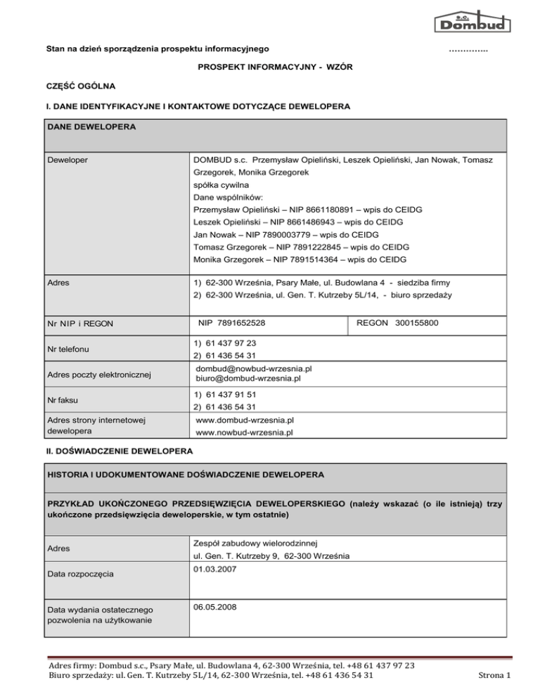 Stan na dzień sporządzenia prospektu informacyjnego ………….. PROSPEKT INFORMACYJNY - WZÓR CZĘŚĆ OGÓLNA I. DANE IDENTYFIKACYJNE I KONTAKTOWE DOTYCZĄCE DEWELOPERA DANE DEWELOPERA Deweloper DOMBUD s.c. Przemysław Opieliński, Leszek Opieliński, Jan Nowak, Tomasz Grzegorek, Monika Grzegorek spółka cywilna Dane wspólników: Przemysław Opieliński – NIP 8661180891 – wpis do CEIDG Leszek Opieliński – NIP 8661486943 – wpis do CEIDG Jan Nowak – NIP 7890003779 – wpis do CEIDG Tomasz Grzegorek – NIP 7891222845 – wpis do CEIDG Monika Grzegorek – NIP 7891514364 – wpis do CEIDG Adres 1) 62-300 Września, Psary Małe, ul. Budowlana 4 - siedziba firmy 2) 62-300 Września, ul. Gen. T. Kutrzeby 5L/14, - biuro sprzedaży Nr NIP i REGON Nr telefonu Adres poczty elektronicznej Nr faksu Adres strony internetowej dewelopera NIP 7891652528 REGON 300155800 1) 61 437 97 23 2) 61 436 54 31 [email protected] [email protected] 1) 61 437 91 51 2) 61 436 54 31 www.dombud-wrzesnia.pl www.nowbud-wrzesnia.pl II. DOŚWIADCZENIE DEWELOPERA HISTORIA I UDOKUMENTOWANE DOŚWIADCZENIE DEWELOPERA PRZYKŁAD UKOŃCZONEGO PRZEDSIĘWZIĘCIA DEWELOPERSKIEGO (należy wskazać (o ile istnieją) trzy ukończone przedsięwzięcia deweloperskie, w tym ostatnie) Adres Zespół zabudowy wielorodzinnej ul. Gen. T. Kutrzeby 9, 62-300 Września Data rozpoczęcia 01.03.2007 Data wydania ostatecznego pozwolenia na użytkowanie 06.05.2008 Adres firmy: Dombud s.c., Psary Małe, ul. Budowlana 4, 62-300 Września, tel. +48 61 437 97 23 Biuro sprzedaży: ul. Gen. T. Kutrzeby 5L/14, 62-300 Września, tel. +48 61 436 54 31 Strona 1 PRZYKŁAD INNEGO UKOŃCZONEGO PRZEDSIĘWZIĘCIA DEWELOPERSKIEGO Adres Zespół zabudowy wielorodzinnej ul. Gen. T. Kutrzeby 11, 62-300 Września Data rozpoczęcia 22.11.2007 Data wydania ostatecznego pozwolenia na użytkowanie 16.01.2009 OSTATNIE UKOŃCZONE PRZEDSIĘWZIĘCIE DEWELOPERSKIE Adres Zespół zabudowy wielorodzinnej ul. Gen. T. Kutrzeby 13, 62-300 Września Data rozpoczęcia 24.09.2008 Data wydania ostatecznego pozwolenia na użytkowanie 13 B - 21.06.2010 Czy przeciwko deweloperowi prowadzono (lub prowadzi się) postępowania egzekucyjne na kwotę powyżej 100 000 zł 13 A - 26.10.2010 Nie III. INFORMACJE DOTYCZĄCE NIERUCHOMOŚCI I PRZEDSIĘWZIĘCIA DEWELOPERSKIEGO INFORMACJE DOTYCZĄCE GRUNTU Adres i nr działki ewidencyjnej 1 62-300 Września, ul. Gen. T. Kutrzeby, dz. nr 488/4 Nr księgi wieczystej Sąd Rejonowy w Środzie Wlkp. IX Zamiejscowy Wydział Ksiąg Wieczystych z siedzibą we Wrześni prowadzi księgę wieczystą PO1F/00042188/1 Istniejące obciążenia hipoteczne nieruchomości lub wnioski o wpis w dziale czwartym księgi wieczystej Nie istnieją W przypadku braku księgi wieczystej informacja o powierzchni Nie dotyczy działki i stanie prawnym nieruchomości 2 1 2 Jeżeli działka nie posiada adresu, należy opisowo określić jej położenie. W szczególności imię i nazwisko albo nazwa (firma) właściciela lub użytkownika wieczystego oraz istniejące obciążenia na nieruchomości. Adres firmy: Dombud s.c., Psary Małe, ul. Budowlana 4, 62-300 Września, tel. +48 61 437 97 23 Biuro sprzedaży: ul. Gen. T. Kutrzeby 5L/14, 62-300 Września, tel. +48 61 436 54 31 Strona 2 Plan zagospodarowania przestrze- przeznaczenie w planie nnego dla sąsiadujących działek 3 Brak planu – warunki zabudowy dopuszczalna wysokość zabudowy Brak planu – warunki zabudowy dopuszczalny procent zabudowy Brak planu – warunki zabudowy działki Informacje zawarte w publicznie dostępnych dokumentach dotyczących przewidzianych inwestycji w promieniu 1 km od przedmiotowej nieruchomości, w szczególności o budowie lub rozbudowie dróg, budowie linii szynowych oraz przewidzianych korytarzach powietrznych, a także znanych innych inwestycjach komunalnych, w szczególności oczyszczalniach ścieków, spalarniach śmieci, wysypiskach, cmentarzach Z informacji uzyskanych w Urzędzie Miasta i Gminy we Wrześni wynika, że w promieniu 1 (jednego) km od nieruchomości, na której prowadzone jest opisane wyżej przedsięwzięcie deweloperskie, planowana jest: - budowa kanalizacji sanitarnej w ulicy części Psar Polskich, Czerniejewskiej we Wrześni oraz w - budowa sieci wodociągowej w Sokołowie, - budowa kanalizacji sanitarnej w ul. Miodowej w Przyborkach, - budowa rekreacyjnej górki saneczkowej przy ul. Czerniejewskiej we Wrześni, - budowa oświetlenia ulicznego w ul. 68 Pułku Piechoty oraz ul. Culica we Wrześni. Ponadto Gmina Września posiada projekt budowy ulicy Monte Cassino we Wrześni, jednak realizacja tego zadania, ze względu na znaczny koszt inwestycji, jest uzależniona od pozyskania przez gminę środków zewnętrznych. INFORMACJE DOTYCZĄCE BUDYNKU Czy jest pozwolenie na budowę tak* nie* Czy pozwolenie na budowę jest ostateczne tak* nie* Czy pozwolenie na budowę jest zaskarżone tak* nie* Nr pozwolenia na budowę oraz nazwa organu, który je wydał Decyzja nr 111/2014 z dnia 04.03.2014r. wydana przez Starostę Wrzesińskiego, dotycząca przedsięwzięcia deweloperskiego, obejmującego budowę na działce nr 488/4 piętnastu budynków mieszkalnych wielorodzinnych z wbudowanymi garażami, miejscami na poziomie terenu oraz infrastrukturą towarzyszącą ( B1, B2, B3, B4, B5, B6, B7, B8, B9, B10, B11, B12, B13, B14, B15) Częścią przedsięwzięcia jest zadanie inwestycyjne polegające na budowie budynku B1 – objęte niniejszym prospektem . Planowany termin rozpoczęcia i zakończenia prac budowlanych Zadanie inwestycyjne obejmujące budynek B1 05.05.2014 – rozpoczęcie budowy 31.10.2015 – zakończenie budowy Planowany termin zakończenia całego przedsięwzięcia: II kw. 2025. 3 W przypadku braku planu zagospodarowania przestrzennego umieszcza się jedynie informację „Brak planu”. * Niepotrzebne skreślić (kliknąć dwukrotnie na tekst). Adres firmy: Dombud s.c., Psary Małe, ul. Budowlana 4, 62-300 Września, tel. +48 61 437 97 23 Biuro sprzedaży