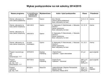 Wykaz podręczników na rok szkolny 2014/2015 Nazwa programu Nr identyfikacyjny w wykazie/ data dopuszczenia Wydawnictwo Autor i tytuł podręcznika Klasa Przedmiot Chemia. odkrywamy na nowo zakres podstawowy 468/2012 Operon Artur Sikorski Chemia zakres podstawowy Seria: odkrywamy na nowo 1A, B, C, D, E chemia Chemia. odkrywamy na nowo zakres rozszerzony 435/1/2012 Operon S. Hejwowska, R. Marcinkowski, J. Staluszka Chemia 1. Zakres rozszerzony. Seria: odkrywamy na nowo 2 C, D i E chemia Chemia. odkrywamy na nowo zakres rozszerzony 435/2/2013 Operon S. Hejwowska, R. Marcinkowski, J. Staluszka Chemia 2. Zakres rozszerzony. Seria: odkrywamy na nowo Chemia. odkrywamy na nowo zakres rozszerzony na razie niedostępny Operon S. Hejwowska, R. Marcinkowski, J. Staluszka Chemia 3. Zakres rozszerzony. Seria: odkrywamy na nowo 3 C, D, E chemia Program nauczania jęz. ang. kurs kontynuacyjny - IV.1 487/6/2012 Express Publishing Virginia Evans “Upstream” - Upper-intermediate 2A gr.I język angielski Program nauczania jęz. ang - kurs kontynuacyjny - IV.1 487/7/2012 Express Publishing Virginia Evans “Upstream” - Advanced 2B/C gr IV 2A gr II 2D/E gr IV język angielski Program nauczania jęz. ang - kurs 681/2014 Nowa Era Izabela Michalak, Zbigniew Pokrzewiński Stephen Davies “Destination: Matura 2015” 3A gr I, II 3B/C gr IV 3D/E gr III język angielski Wykaz podręczników na rok szkolny 2014/2015 kontynuacyjny - IV.1 Program nauczania jęz. ang. kurs kontynuacyjny - IV.1 335/4/2012 Express Publishing Prime time Upper-intermediate Program nauczania jęz. ang. kurs kontynuacyjny - IV.1 424/2012 Program nauczania języka polskiego do kształcenia podstawowego i rozszerzonego 545/3/2013 Stentor “Świat do przeczytania”.K.Biedrzycki, E.Jaskółowa, E.Nowak Kultura.Język.Dialogi 2a,2d,2e język polski Program nauczania języka polskiego do kształcenia podstawowego i rozszerzonego 545/4/2014 Stentor “Świat do przeczytania” K.Biedrzycki, E.Jaskółowa,E.Nowak Kultura.Język.Dialogi 3b,3c język polski Program nauczania języka niemieckiego w liceum ogólnokształcacym, liceum profilowanym i technikum 459/2/2012 Nowa Era Welttour 2, Sylwia Mróz-Dwornikowska, Katarzyna Szachowska 2abc język niemiecki (niem4) 3ac gr1, 2abc (niem 1, 2, 3), 2de 3de,3b 3ac gr2 Virginia Evans, Jenny Dooley 2b/c gr II 2d/e gr II język angielski 2b/c gr I 2d/e gr I Express Publishing Matura Repetytorium. Poziom rozszerzony 3b/c gr I 3d/e gr I język angielski 3b/c gr II 3d/e gr II 459/3/2013 Welttour 3, Sylwia Mróz-Dwornikowska, Katarzyna Szachowska 459/4/2014 Welttour 4, Sylwia Mróz-Dwornikowska, Katarzyna Szachowska Wykaz podręczników na rok szkolny 2014/2015 program nauczania języka polskiego, zakres podstawowy 545/3/2013 Stentor “Świat do przeczytania”.K.Biedrzycki, E.Jaskółowa, E.Nowak II b język polski program nauczania języka polskiego, zakres podstawowy 545/4/2014 Stentor “Świat do przeczytania”.K.Biedrzycki, E.Jaskółowa, E.Nowak IIIa, IIIe język polski program nauczania języka polskiego, zakres podstawowy. 545/4/2014 Stentor “Świat do przeczytania” K.Biedrzycki, E.Jaskółowa, E.Nowak IIId język polski program nauczaniajęzyka polskiego, zakres podstawowy 545/3/2013 Stentor “Świat do przeczytania” K.Biedrzycki, E.Jaskółowa, E.Nowak IIc język polski ----------------------- ---------------------------------------------------------------------- I - III wychowanie fizyczne Oficyna Edukacyjna Krzysztof Pazdro Sp. z o.o. Matematyka. Podręcznik do liceów i techników. Zakres rozszerzony. Klasa I Autorzy: M. Kurczab, E. Kurczab, E. Świda Klasy I Matematyka Matematyka. Podręcznik do liceów i techników. zakres rozszerzony. Klasa II. Autorzy: M. Kurczab, E. Kurczab, E. Świda Klasy II Matematyka. Podręcznik do liceów i techników. Zakres rozszerzony. Klasa III. Klasy III (za wyjątkiem program nauczania z wychowania fizycznego.UMIEĆWIEDZIEĆ-CHCIEĆ. Tytuł serii: Matematyka. Licea i technika. 563/1/2012 (data dopuszczenia: 28.05.2012) 563/2/2013 (25.07.2013) IIIC,IIIE - program autorski 563/3/2014 (29.05.2014) Wykaz podręczników na rok szkolny 2014/2015 412/3/2012 program nauczania biologi - zakres podstawowy 450/2012 Oficyna Edukacyjna Krzysztof Pazdro Sp. z o.o. Autorzy: M. Kurczab, E. Kurczab, E. Świda IIID) Matematyka. Podręcznik do liceów i techników. Zakres podstawowy. Klasa III. Autorzy: M. Kurczab, E. Kurczab, E. Świda IIID Wydawnictwo Nowa Era Matematyka Id,Ie Biologia Biologia na czasie. Podręcznik dla szkół ponadgimnazjalnych.Zakres podstawowy Autorzy: Bonar E.,Krzeszowiec-Jeleń W., Czachorowski S. Ic,Ia program nauczania biologi - zakres rozszerzony 564/1/2012 Wydawnictwo Nowa Era Program nauczania języka francuskiego dla liceum ogólnokszt., liceum profilowanego i w druku 382/2/2013 IIe Biologia IIIe Biologia Biologia na czasie 2. Podręcznik dla liceum ogólnokształcąego i technikum. Zakres rozszerzony Autorzy: Dubert F., Kozik R., Krawczyk S., Kula A. Wydawnictwo Nowa Era 564/2/2013 Program nauczania biologi zakres rozszerzony Biologia na czasie 1.. Podręcznik dla liceum ogólnokształcącego i technikum. Zakres rozszerzony. Autorzy: Guzik M., Jastrzębska E., Kozik R., Biologia Wydawnictwo Nowa Era Biologia na czasie 3. Podręcznik dla liceum ogólnokształcącego i technikum. Zakres rozszerzony. Wydawnictwo Szkolne PWN Francofolie express 2 Supryn-Klepcarz Magdalena, Boutégege Regine IIabc1, IIde1 Język francuski Wykaz podręczników na rok szkolny 2014/2015 technikum. Kurs kontynuacyjny. Program nauczania języka francuskiego dla liceum ogólnokszt., liceum profilowanego i technikum. Kurs podstawowy. 382/1/2011 Wydawnictwo Szkolne PWN Francofolie express 1 Supryn-Klepcarz Magdalena, Boutégege Regine IIde2 Język francuski Program nauczania języka francuskiego dla liceum ogólnokszt., liceum profilowanego i technikum. Kurs podstawowy. 382/2/2013 Wydawnictwo Szkolne PWN Francofolie express 2 Supryn-Klepcarz Magdalena, Boutégege R