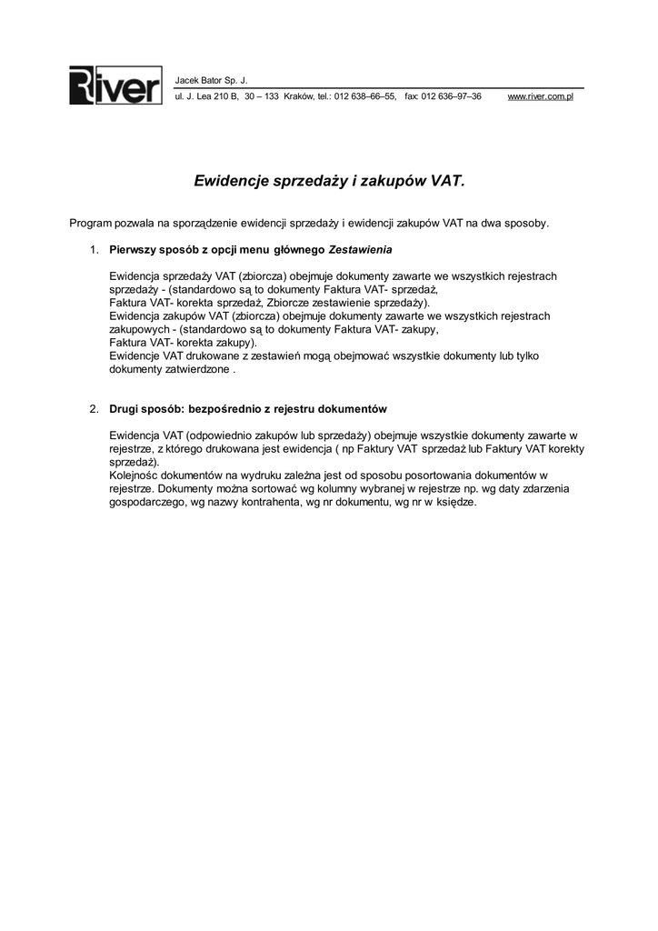 Jacek Bator Sp. J. ul. J. Lea 210 B, 30 – 133 Kraków, tel.: 012 638–66–55, fax: 012 636–97–36 www.river.com.pl Ewidencje sprzedaży i zakupów VAT. Program pozwala na sporządzenie ewidencji sprzedaży i ewidencji zakupów VAT na dwa sposoby. 1. Pierwszy sposób z opcji menu głównego Zestawienia Ewidencja sprzedaży VAT (zbiorcza) obejmuje dokumenty zawarte we wszystkich rejestrach sprzedaży - (standardowo są to dokumenty Faktura VAT- sprzedaż, Faktura VAT- korekta sprzedaż, Zbiorcze zestawienie sprzedaży). Ewidencja zakupów VAT (zbiorcza) obejmuje dokumenty zawarte we wszystkich rejestrach zakupowych - (standardowo są to dokumenty Faktura VAT- zakupy, Faktura VAT- korekta zakupy). Ewidencje VAT drukowane z zestawień mogą obejmować wszystkie dokumenty lub tylko dokumenty zatwierdzone . 2. Drugi sposób: bezpośrednio z rejestru dokumentów Ewidencja VAT (odpowiednio zakupów lub sprzedaży) obejmuje wszystkie dokumenty zawarte w rejestrze, z którego drukowana jest ewidencja ( np Faktury VAT sprzedaż lub Faktury VAT korekty sprzedaż). Kolejnośc dokumentów na wydruku zależna jest od sposobu posortowania dokumentów w rejestrze. Dokumenty można sortować wg kolumny wybranej w rejestrze np. wg daty zdarzenia gospodarczego, wg nazwy kontrahenta, wg nr dokumentu, wg nr w księdze.