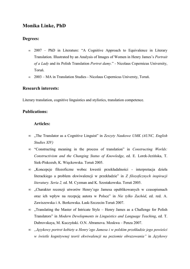 Monika Linke, PhD Degrees: • 2007 – PhD in Literature: “A Cognitive Approach to Equivalence in Literary Translation. Illustrated by an Analysis of Images of Women in Henry James’s Portrait of a Lady and its Polish Translation Portret damy.” - Nicolaus Copernicus University, Toruń. • 2003 – MA in Translation Studies - Nicolaus Copernicus Universty, Toruń. Research interests: Literary translation, cognitive linguistics and stylistics, translation competence. Publications: Articles: • „The Translator as a Cognitive Linguist” in Zeszyty Naukowe UMK (AUNC, English Studies XIV) • “Constructing meaning in the process of translation” in Constructing Worlds: Constructivism and the Changing Status of Knowledge, ed. E. Lorek-Jezińska, T. Siek-Piskozub, K. Więckowska. Toruń 2005. • „Koncepcje filozoficzne wobec kwestii przekładalności - interpretacja dzieła literackiego a problem ekwiwalencji w przekładzie” in Z filozoficznych inspiracji literatury. Seria 2, ed. M. Cyzman and K. Szostakowska. Toruń 2005. • „Charakter recenzji utworów Henry’ego Jamesa opublikowanych w czasopismach oraz ich wpływ na recepcję autora w Polsce” in Nie tylko Zachód, ed. red. A. Zawiszewska i A. Borkowska. Łask-Szczecin-Toruń 2007. • „Translating the Master of Intricate Style – Henry James as a Challenge for Polish Translators” in Modern Developments in Linguistics and Language Teaching, ed. T. Dubrovskaya, M. Kuczyński. O.N. Abramova. Moskwa – Penza 2007. • „Językowy portret kobiety u Henry’ego Jamesa i w polskim przekładzie jego powieści w świetle kognitywnej teorii ekwiwalencji na poziomie obrazowania” in Językowy obraz świata w oryginale i w przekładzie, ed. K. Hejwowski, Wydawnictwo Uniwersytetu Warszawskiego, Warszawa 2007. • „Kognitywna teoria ekwiwalencji a współczesne deskryptywne podejścia do przekładu literackiego” in Język trzeciego tysiąclecia IV, ed. M. Piotrowska, Krakowskie Towarzystwo Popularyzowania Wiedzy o Komunikacji Językowej "Tertium". Kraków 2007. Translations: • in Filmowe gry z twórczością Henry'ego Jamesa. Transpozycje, komentarze, analogie, ed. M. Buchholtz. Toruń: 2005, the translations of the following articles: Chistopher Garbowski. “The Modernity of Henry James and Agnieszka Holland’s Washington Square”, Dennis Tredy. “Shadows of Shadows: Techniques of Ambiguity in Three Film Adaptations of “The Turn of the Screw”: Jack Clayton’s The Innocents (1961), Dan Curtis’s The Turn of the Screw (1974), and Antonio Aloy’s Presence of Mind” (1999) and (with dr D. Guttfeld) Donatella Izzo. „Setting a Free Woman Free: The Portarait(s) of a Lady” • poems: „W Jukonie” by Ralph Gustafson, „Jazda” by John Newlove, poem VI from „Ziemia po której stąpasz” by Dionne Brandt in Fraza (4/2003-1/2004) Papers at conferences: • Constructing Worlds: Constructivism and the Changing Status of Knowledge. Katedra Filologii Angielskiej UMK (2-5 Feb 2005) • Second Dublin City University Postgraduate Conference in Translation Studies. Dublin City University (1-2 Apr 2005) • Z filozoficznych inspiracji literatury. II edycja. UMK (15-16 Jun 2005) • Imago mundi: Językowy obraz świata w oryginale i w przekładzie. Instytut Lingwistyki Stosowanej Uniwersytetu Warszawskiego (26-28 Nov 2005) • Język trzeciego tysiąclecia IV. Krakowskie Towarzystwo Popularyzowania Wiedzy o Komunikacji Językowej Tertium (9-12 Mar 2006) • Recepcja literatur obcych na łamach XX-wiecznych czasopism literackich i społecznokulturalnych. Zakład Historii Literatury Polskiej XX wieku Uniwersytetu Szczecińskiego and Zakład Literatur Słowiańskich UMK (17-19 Oct 2006) • Medius currens II -Tłumacz jako pośrednik między językami i kulturami a teoria, dydaktyka i praktyka przekładu. Katedra Filologii Germańskiej, Katedra Filologii Angielskiej, Katedra Filologii Romańskiej and Zakład Italianistyki UMK (20-21 Apr 2007) Courses taught: Translation studies seminar and proseminar, practical grammar, and American literature