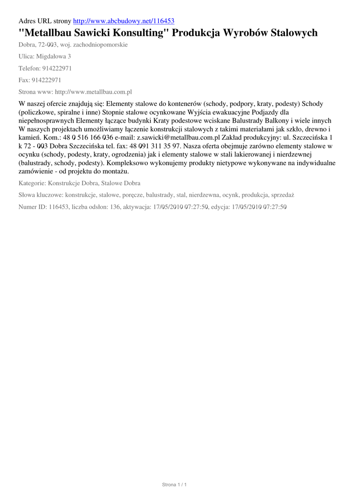 Adres URL strony http://www.abcbudowy.net/116453 "Metallbau Sawicki Konsulting" Produkcja Wyrobów Stalowych Dobra, 72-003, woj. zachodniopomorskie Ulica: Migdałowa 3 Telefon: 914222971 Fax: 914222971 Strona www: http://www.metallbau.com.pl W naszej ofercie znajdują się: Elementy stalowe do kontenerów (schody, podpory, kraty, podesty) Schody (policzkowe, spiralne i inne) Stopnie stalowe ocynkowane Wyjścia ewakuacyjne Podjazdy dla niepełnosprawnych Elementy łączące budynki Kraty podestowe wciskane Balustrady Balkony i wiele innych W naszych projektach umożliwiamy łączenie konstrukcji stalowych z takimi materiałami jak szkło, drewno i kamień. Kom.: 48 0 516 166 036 e-mail: [email protected] Zakład produkcyjny: ul. Szczecińska 1 k 72 - 003 Dobra Szczecińska tel. fax: 48 091 311 35 97. Nasza oferta obejmuje zarówno elementy stalowe w ocynku (schody, podesty, kraty, ogrodzenia) jak i elementy stalowe w stali lakierowanej i nierdzewnej (balustrady, schody, podesty). Kompleksowo wykonujemy produkty nietypowe wykonywane na indywidualne zamówienie - od projektu do montażu. Kategorie: Konstrukcje Dobra, Stalowe Dobra Słowa kluczowe: konstrukcje, stalowe, poręcze, balustrady, stal, nierdzewna, ocynk, produkcja, sprzedaż Numer ID: 116453, liczba odsłon: 136, aktywacja: 17/05/2010 07:27:50, edycja: 17/05/2010 07:27:50 Strona 1 / 1