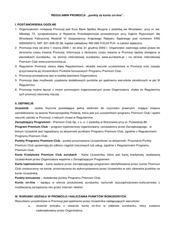 REGULAMIN PROMOCJI „punkty za konto on-line”. I. POSTANOWIENIA OGÓLNE 1. Organizatorem niniejszej Promocji jest Euro Bank Spółka Akcyjna z siedzibą we Wrocławiu przy ul. św. Mikołaja 72, zarejestrowana w Rejestrze Przedsiębiorców prowadzonym przy Sądzie Rejonowym dla Wrocławia Fabrycznej Wydział VI Gospodarczy Krajowego Rejestru Sądowego pod numerem KRS 0000025313, NIP: 521-008-25-38, kapitał zakładowy 460 096 018,54 PLN w całości wpłacony. 2. Promocja trwa od dnia 1 marca 2009 r. do dnia 31 grudnia 2009 r. Organizator zastrzega sobie prawo do skrócenia czasu trwania Promocji. Informacja o skróceniu czasu trwania w Promocji będzie dostępna w placówkach eurobanku, na stronie internetowej eurobanku www.eurobank.pl i na stronie internetowej Premium Club www.premiumclub.pl. 3. Regulamin Promocji zwany dalej Regulaminem, określa warunki uczestnictwa w Promocji oraz zasady przyznawania jej Uczestnikom Punktów bonusowych Programu Premium Club. 4. Promocja prowadzona jest w każdej placówce Organizatora. 5. Promocja daje możliwość uzyskania dodatkowych punktów po spełnieniu warunków określonych w pkt III Regulaminu. 6. Promocję można łączyć z innym promocjami organizowanymi przez Organizatora, chyba że Regulaminy tych promocji stanowią inaczej. II. DEFINICJE Uczestnik - osoba fizyczna posiadająca pełną zdolność do czynności prawnych, mająca miejsce zameldowania na terenie Rzeczpospolitej Polskiej, która jest już uczestnikiem programu Premium Club i spełni warunki udziału w Promocji, o których mowa w Regulaminie. Zarządzający Programem - Premium Club Sp. z o. o. z siedzibą w Warszawie przy ul. Puławskiej 86. Program Premium Club – program lojalnościowy organizowany i prowadzony przez Zarządzającego, w którym Uczestnik jest nagradzany za aktywność punktami Programu Premium Club, zgodnie z Regulaminem Programu Premium Club. Punkty Programu Premium Club - punkty przyznawane Uczestnikowi za aktywność. Przyznane Punkty Premium Club uprawniają do odbioru nagród rzeczowych lub usług, zgodnie z Regulaminem Programu Premium Club. Karta Kredytowa Premium Club eurobank - Karta Uczestnika, która jest kartą kredytową, wydawaną Uczestnikowi przez Organizatora wspólnie z Zarządzającym Programem. Karta lojalnościowa – karta wydana przez Zarządzającego programem identyfikowana przez numer Premium Club umieszczony na karcie, przeznaczona do wykorzystywania przez Uczestnika w celu zbierania punktów na konto Uczestnika. Punkty bonusowe – dodatkowe punkty Programu Premium Club. Konto on-line – będący w ofercie produktowej eurobanku rachunek oszczędnościowo-rozliczeniowy z możliwością zarządzania nim przez Internet i telefon III. WARUNKI UDZIAŁU W PROMOCJI I NALICZANIA PUNKTÓW BONUSOWYCH Warunkiem uczestnictwa w Promocji jest spełnienie przez Uczestnika następujących warunków: a. złożenie wniosku o otwarcie konta on-line w oddziale eurobanku, który zostanie zaakceptowany przez Organizatora, b. podpisanie umowy o prowadzenie konta on-line oraz dopełnienie wszystkich z tym związanych formalności, c. poinformowanie Doradcy Klienta w oddziale eurobanku o numerze swojej karty lojalnościowej Premium Club, d. brak zaległości w spłacie minimalnej w przypadku Uczestników, którzy są posiadaczami karty kredytowej Premium Club eurobank, e. podpisanie zgody na przekazanie informacji o założonym koncie on-line do Zarządzającego Programem celem naliczenia punktów bonusowych, f. w Promocji bierze udział tylko pierwsze konto on-line założone przez Uczestnika w okresie trwania Promocji niezależnie od tego czy jest to konto indywidualne czy wspólne. IV. PUNKTY BONUSOWE 1. Każdemu Uczestnikowi, który spełni warunki Promocji zostanie przyznanych 500 punktów bonusowych Premium Club. 2. Punkty bonusowe Premium Club będą naliczone Uczestnikowi po podpisaniu umowy o konto on-line, nie później jednak niż do 21 dni roboczych po dacie podpisania umowy. V. POSTĘPOWANIE REKLAMACYJNE 1. Reklamacje dotyczące przebiegu Promocji można składać: w placówkach bankowych Organizatora, w serwisie eurobank on-line, telefonicznie w Centrum Obsługi Klienta eurobanku oraz pisemnie na adres banku: Euro Bank S.A., ul. Św. Mikołaja 72, 50-126 Wrocław. 2. Reklamacje mogą być składane nie później niż 60 dni od daty zakończenia trwania Promocji. 3. Reklamacje będą rozpatrywane przez Organizatora w terminie 14 dni roboczych od daty przyjęcia reklamacji. Termin ten może ulec wydłużeniu w przypadku konieczności kontaktu z firmą zewnętrzną. 4. Organizator poinformuje składającego reklamację o zajętym stanowisku telefonicznie lub listem zwykłym lub w formie wiadomości w serwisie eurobank on-line. VI. POSTANOWIENIE KOŃCOWE 1. Regulamin Promocji dostępny jest w placówkach bankowych Organizatora, na stronie internetowej eurobanku www.eurobank.pl i na stronie internetowej Premium Club www.premiumclub.pl.