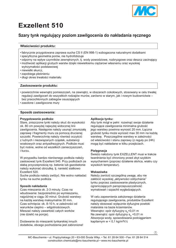 Exzellent 510 Szary tynk regulujący poziom zawilgocenia do nakładania ręcznego Właściwości produktu: •fabrycznie przygotowana zaprawa sucha CS II (EN 998-1) wzbogacona naturalnymi dodatkami •specyficzna geometria porów, nie hydrofobizuje •odporny na wpływ czynników zewnętrznych, tj. wody powodziowe, rozbryzgowe oraz deszcz zacinający •możliwość aplikacji grubych warstw dzięki niewielkiemu ciężarowi własnemu oraz wysokiej wytrzymałości podstawowej •niewielki skurcz, •zapobiega pleśnieniu •długi okres trwałości materiału Zastosowanie produktu: •powierzchnie wewnątrz pomieszczeń, na zewnątrz, w obszarach cokołowych, stosowany w celu trwałej regulacji zawilgoceń do wszystkich rodzajów murów, zarówno w starym, jak i nowym budownictwie – bez pracochłonnych zabiegów osuszających •zasolone i zawilgocone mury Sposób zastosowania: Przygotowanie podłoża: Stare, zniszczone tynki należy skuć do wysokości ok. 80 cm powyżej najwyżej widocznej linii zawilgocenia. Następnie należy usunąć zmurszałą zaprawę i fragmenty muru za pomocą drucianej szczotki. Powierzchnię należy również oczyścić z luźnych i niezwiązanych cząstek, substancji woskowych oraz antyadhezyjnych. Podłoże musi być nośne, wolne od wszelkich zanieczyszczeń, i kurzu. W przypadku bardzo nierównego podłoża należy zastosować tynk Exzellent 540. Przy podłożach ze słabą przyczepnością np. betonie lub gazobetonie należy wykonać obrzutkę, tj. nanieść siatkowo Exzellent 520. Suche podłoża należy zwilżyć. Nie wolno nakładać tynku na suche podłoża. Sposób nakładania Czas mieszania ok. 2-3 minuty. Czas na wbudowanie: bezpośrednio po wymieszaniu, najpóźniej w ciągu 30 minut. Grubość warstwy: na każdą warstwę maksymalnie 30 mm. Czas schnięcia: ok. 8-10 h, w zależności od warunków cieplno – wilgotnościowych. Mieszać należy zawartość całych worków (nie dzielić na porcje). Dodawanie do mieszanki tynkarskiej innych dodatków, obcego pochodzenia jest zabronione! Aplikacja tynku: Aby tynk mógł w pełni rozwinąć swoje działanie regulujące zawilgocenia minimalna grubość jego warstwy powinna wynosić 20 mm. Łączna grubość tynku może wynosić max 30 mm na każdą warstwę. Poszczególne warstwy w zależności od właściwości i stanu zaprawy (z reguły po 24h) mogą być nakładane w kilku przejściach. Pielęgnacja Świeżo nałożony tynk EXZELLENT musi w trakcie twardnienia być chroniony przed zbyt szybkim wysychaniem (poprzez działanie słońca, wiatru czy wysokich temperatur). Wskazówka Należy zwrócić szczególną uwagę, aby nie zakłócić wysokiej „aktywności oddychania” tynku poprzez zastosowanie plastycznych, ograniczających paroprzepuszczalność wymalowań i szpachli wygładzających. W celu zapewnienia założonego działania regulującego zawilgocenia, produktów Exzellent należy stosować wyłącznie dyfuzyjne powłoki malarskie na bazie krzemianów. Wewnątrz: opór dyfuzyjny sD<0,01 m Na zewnątrz: opór dyfuzyjny sD <0,01 m Absorpcja wody, spowodowana podciąganiem kapilarnym w < 0,1 kg/m²h½ 1 MC-Bauchemie • ul. Prądzyńskiego 20 • 63-000 Środa Wlkp. • Tel. 61 28 64 500 • Fax: 61 28 64 514 [email protected] • www.mc-bauchemie.pl Dane Techniczne Exzellent 510: Parametr Jednostka miary Wartość Uwagi Uziarnienie mm 0-2,2 Gęstość kg/l ok. 1,4 proporcje mieszania kg:l ok. 4,5 na opakowanie Wydajność m² ok. 1 na opakowanie 25 kg przy grubości warstwy 20 mm Wytrzymałość na rozciąganie przy zginaniu MPa ≥ 1 po 28 dniach Zawartość porów powietrza w świeżej zaprawie % ≥ 18 Temperatura podczas zastosowania °C ≥ + 5 - +30 temp. podłoża i powietrza Przewodnictwo cieplne ƛ W/m*K 0,47 wartość tabelaryczna Opór dyfuzyjny pary wodnej Sd < 0,05 m przy 2 cm tynku Właściwości produktu Exzellent 510: Certyfikat CE zgodny z EN 998-1 Sposób dostawy worek 25 kg 1 paleta (40 worków po 25 kg) Składowanie Przechowywać w oryginalnie zamkniętych opakowaniach przez 12 miesięcy w suchych pomieszczeniach. Chronić przed przemarzaniem i zawilgoceniem. Usuwanie odpadów W trosce o środowisko naturalne opakowania należy dokładnie opróżniać. Inne produkty z tej serii: Exzellent 500 tynk do nakładania maszynowego - szary Exzellent 520 obrzutka tynkowa Exzellent 540 tynk wyrównawczy Exzellent 600 tynk do nakładania maszynowego – biały Exzellent 610 tynk do nakładania ręcznego – biały Exzellent 700 tynk do nakładania maszynowego - barwny* Exzellent 750 tynk wygładzający biały + barwny * dostępny w 4 standardowych kolorach, inne kolory na specjalne zamówienie Uwaga! Wszelkie informacje zawarte w niniejszej karcie oparte są na naszym doświadczeniu i najlepszej wiedzy, jednakże nie mogą być traktowane jako prawnie wiążące. Należy bezwzględnie każdorazowo stosować się do prawodawstwa miejscowego, w zakresie przeznaczenia oraz zastosowania w obiektach budowlanych. Przy spełnieniu powyższych wymogów odpowiadamy za poprawność przekazanych informacji w ramach naszych Ogólnych Warunków Sprzedaży, Dostaw i Płatności. Wszelkie doradztwo ze strony naszych Współpracowników, odbiegające od treści naszych kart technicznych, jest wiążące jedynie w przypadku pisemnego ich potwierdzenia. W każdym przypadku należy stosować się do ogólnie obowiązujących zasad sztuki budowlanej. Wydanie 05/15. Niniejszy druk został zaktualizowany pod względem technicznym. Tym samym unieważnia się dotychczasowe wydania i nie wolno ich stosować. W przypadku wydania nowej karty, zaktualizowanej pod względem technicznym, niniejsze wydanie traci ważność. MC-Bauchemie • ul. Prądzyńskiego 20 • 63-000 Środa Wlkp. • Tel. 61 28 64 500 • Fax: 61 28 64 514 [email protected] • www.mc-bauchemie.pl 2
