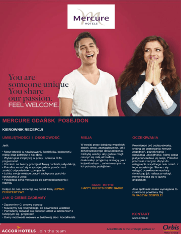 MERCURE GDAŃSK POSEJDON KIEROWNIK RECEPCJI UMIEJĘTNOŚCI I OSOBOWOŚĆ MISJA OCZEKIWANIA Jeśli: W swojej pracy dołożysz wszelkich starań, chęci, zaangażowania, jak i dotychczasowego doświadczenia, zdobytej wiedzy, aby goście mogli cieszyć się miłą atmosferą, doskonałą i przyjazną obsługą, jak i indywidualnym , zorientowanym na ich potrzeby podejściem. Powinieneś być osobą otwartą, chętną do poznawania nowych zagadnień, pozyskiwania i rozwijania umiejętności, której praca jest jednocześnie jej pasją. Potrafisz pracować z innymi, dążyć do osiągnięcia wspólnego celu i mieć z tego satysfakcję. Starasz się osiągać oczekiwane rezultaty świadcząc jak najlepsze usługi. Komunikujesz się w języku angielskim. • Masz łatwość w nawiązywaniu kontaktów, budowaniu relacji oraz potrafisz o nie dbać • Wykazujesz inicjatywę w pracy i sprawia Ci to przyjemność • Uśmiech na twarzy gości jest Twoją osobistą satysfakcją • Potrafisz wczuć się w sytucję gościa, pomóc mu i znaleźć odpowiednie rozwiązanie • Lubisz swoje miejsce pracy i zachęcasz gości do korzystania z usług • Posiadasz silną motywację do samodoskonalenia i rozwoju Dołącz do nas, otwierają się przed Tobą LEPSZE PERSPEKTYWY. JAK O CIEBIE ZADBAMY • Zapewnimy Ci umowę o pracę • Nauczymy Cię wszystkiego, co powinieneś wiedzieć • Pomożemy rozwijać się poprzez udział w szkoleniach i toczących się projektach • Damy możliwość rozwoju w światowej sieci AccorHotels NASZE MOTTO: HAPPY GUESTS COME BACK! Jeśli spełniasz nasze wymagania to z radością powitamy Cię W NASZYM ZESPOLE! KONTAKT www.orbis.pl AccorHotels is the strategic partner of