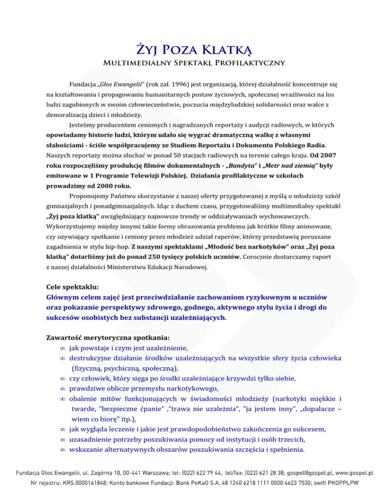 Żyj Poza Klatką Multimedialny Spektakl Profilaktyczny Fundacja „Głos Ewangelii” (rok zał. 1996) jest organizacją, której działalność koncentruje się na kształtowaniu i propagowaniu humanitarnych postaw życiowych, społecznej wrażliwości na los ludzi zagubionych w swoim człowieczeństwie, poczucia międzyludzkiej solidarności oraz walce z demoralizacją dzieci i młodzieży. Jesteśmy producentem cenionych i nagradzanych reportaży i audycji radiowych, w których opowiadamy historie ludzi, którym udało się wygrać dramatyczną walkę z własnymi słabościami - ściśle współpracujemy ze Studiem Reportażu i Dokumentu Polskiego Radia. Naszych reportaży można słuchać w ponad 50 stacjach radiowych na terenie całego kraju. Od 2007 roku rozpoczęliśmy produkcję filmów dokumentalnych - „Bandyta” i „Metr nad ziemią” były emitowane w 1 Programie Telewizji Polskiej. Działania profilaktyczne w szkołach prowadzimy od 2000 roku. Proponujemy Państwu skorzystanie z naszej oferty przygotowanej z myślą o młodzieży szkół gimnazjalnych i ponadgimnazjalnych. Idąc z duchem czasu, przygotowaliśmy multimedialny spektakl „Żyj poza klatką” uwzględniający najnowsze trendy w oddziaływaniach wychowawczych. Wykorzystujemy między innymi takie formy obrazowania problemu jak krótkie filmy animowane, czy ożywiający spotkanie i ceniony przez młodzież udział raperów, którzy przedstawią poruszane zagadnienia w stylu hip-hop. Z naszymi spektaklami „Młodość bez narkotyków” oraz „Żyj poza klatką” dotarliśmy już do ponad 250 tysięcy polskich uczniów. Corocznie dostarczamy raport z naszej działalności Ministerstwu Edukacji Narodowej. Cele spektaklu: Głównym celem zajęć jest przeciwdziałanie zachowaniom ryzykownym u uczniów oraz pokazanie perspektywy zdrowego, godnego, aktywnego stylu życia i drogi do sukcesów osobistych bez substancji uzależniających. Zawartość merytoryczna spotkania: • jak powstaje i czym jest uzależnienie, • destrukcyjne działanie środków uzależniających na wszystkie sfery życia człowieka (fizyczną, psychiczną, społeczną), • czy człowiek, który sięga po środki uzależniające krzywdzi tylko siebie, • prawdziwe oblicze przemysłu narkotykowego, • obalenie mitów funkcjonujących w świadomości młodzieży (narkotyki miękkie i twarde, ”bezpieczne ćpanie” ,”trawa nie uzależnia”, ”ja jestem inny”, „dopalacze – wiem co biorę” itp.), • jak wygląda leczenie i jakie jest prawdopodobieństwo zakończenia go sukcesem, • uzasadnienie potrzeby poszukiwania pomocy od instytucji i osób trzecich, • wskazanie alternatywnych obszarów poszukiwania szczęścia i spełnienia. Zawartość merytoryczna spektaklu dostosowana jest do wieku uczestników oraz przebiegu zajęć (pytań zadawanych przez młodzież i twierdzeń dotyczących środków uzależniających). Prowadzący: doświadczeni instruktorzy terapii uzależnień oraz muzycy – raperzy. Czas trwania spektaklu: dwie godziny lekcyjne (90 min.) z przerwą lub bez przerwy – w zależności od potrzeb zamawiającego. Liczba uczestników: do 120 osób Miejsce spektaklu: w zależności od liczby uczestników: sale lekcyjne, sale gimnastyczne, sale widowiskowe lub inne wskazane przez zamawiającego. Spektakl najlepiej prezentuje się w salach o dobrej akustyce i takich, w których możliwe jest chociaż częściowe zaciemnienie. Informacje techniczne: wymagany sprzęt to pełne nagłośnienie, projektor multimedialny wpięty do nagłośnienia, odtwarzacz CD lub możliwość podłączenia dźwięku z laptopa. W razie braku wymaganego sprzętu możemy za dodatkową opłatą dowieźć własny. Cennik: • pojedyncza prezentacja (90 min) – 756 zł brutto, • dwie prezentacje – 1296 zł brutto, • trzy prezentacje – 1620 zł brutto, • w razie wykorzystania naszego sprzętu (projektor, nagłośnienie) dodatkowa opłata – 100 zł brutto. Kontakt: mgr Mariusz Michalak, tel. 723 497 612, e-mail: [email protected] Dziękujemy za zapoznanie się z naszą ofertą Z wyrazami szacunku Fundacja „Głos Ewangelii”
