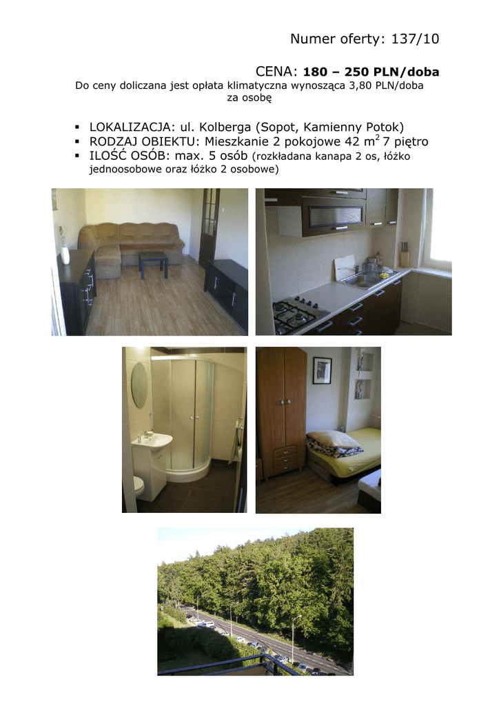 Numer oferty: 137/10 CENA: 180 – 250 PLN/doba Do ceny doliczana jest opłata klimatyczna wynosząca 3,80 PLN/doba za osobę LOKALIZACJA: ul. Kolberga (Sopot, Kamienny Potok) RODZAJ OBIEKTU: Mieszkanie 2 pokojowe 42 m2 7 piętro ILOŚĆ OSÓB: max. 5 osób (rozkładana kanapa 2 os, łóŜko jednoosobowe oraz łóŜko 2 osobowe) Numer oferty: 137/10 LOKALIZACJA: ul. Kolberga Lp. PRZEDMIOT OCENY UWAGI 1. Nowe/stare budownictwo Blok wyremontowany 2. Nowe/stare meble Nowe meble 3. Parking na posesji/GaraŜ Parking przed posesją 4. Balkon / taras / ogródek Balkon 5. Telewizor (Kablówka, TV Sat), Radio TV kablowa 6. Dostęp do telefonu Nie 7. Dostęp do internetu Nie 8. Kuchnia W pełni wyposaŜona kuchnia w: lodówkę, kuchenkę gazową, sztućce, zastawę i garnki 9. Łazienka Łazienka z kabiną prysznicową oraz WC 10. Pościel, ręczniki Tak 11. Dostęp do szafy / półek Tak 12. Pobyt ze zwierzątkiem Do uzgodnienia 14. Niepełnosprawni (winda, podjazd) Obiekt nieprzystosowany 15. Plac zabaw dla dzieci Koło bloku 16. 17. Lokalizacja • Centrum – Dworzec PKP • PlaŜa, park • Dzielnica • Komunikacja miejska Osoby palące MoŜna palić na balkonie 18. Piwnica/schowek Tak 19. Faktura VAT lub Rachunek Dowód wpłaty 20. Inne Mieszkanie w otoczeniu lasów w spokojnej dzielnicy, 3 przystanki autobusowe do centrum, 15 – 20 minut pieszo do plaŜy. Autobusy: 181, 187