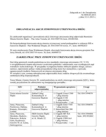 Załącznik nr 1 do Zarządzenia Nr 0050.85.2013 z dnia 15.11.2013 r. ORGANIZACJA AKCJI ZIMOWEGO UTRZYMANIA DRÓG Za całokształt organizacji i prowadzenia akcji zimowego utrzymania dróg odpowiada Burmistrz Miasta Gorzów Śląski - Pan Artur Tomala, tel. 034/3505710, kom. 692482364. Do bezpośredniego kierowania akcją zimową wyznaczony został podinspektor w referacie PIŚ w Gorzowie Śląskim - Pan Waldemar Drajok, tel. 034/3505710 wewn. 57, kom. 603982633 W razie nieobecności Pana Waldemara Drajok, obowiązki kierowania akcją zimową przejmie Pan Jerzy Struzik, tel. 034/3505710 wewn. 36, kom. 604960731 ZAKRES PRAC PRZY ZIMOWYM UTRZYMANIU DRÓG Sieć dróg gminnych została podzielona na trzy standardy zimowego utrzymania ( IV, V,VI) z uwzględnieniem stopnia aktywności zwalczania gołoledzi i odśnieŜania, oraz wynikających stąd warunków ruchu kołowego. W przypadku wystąpienia bardzo obfitych opadów śniegu, zawiei i zamieci, zapewnienie pełnej i stałej przejezdności dróg moŜe być niemoŜliwe, z powodu ograniczonych środków finansowych na zimowe utrzymanie dróg. W związku z tym, zostaną zabezpieczone odpowiednie ilości znaków drogowych do ewentualnego zamknięcia dróg nieprzejezdnych. Teren Miasta i Gminy Gorzów Śl. został podzielony na strefy zimowego utrzymania (SZU), które zostały przydzielone do odśnieŜania wg następującego porządku : SZU 1 Podmiot odpowiedzialny 2 Teren miasta Gorzów Śląski Zakład Usług Komunalnych w Gorzowie Śląskim Jamy, Piaseczna, Pawłowice, Dębina, Karpaty, Dziesiątki, Leśniki Jamy, Piaseczna, Skrońsko, Budzów, Pakoszów, Kobyla Góra, Kozłowice, Gorzów Śl. ul. Leśna, Jastrzygowice Zakład Usług Komunalnych w Gorzowie Śląskim SKR Gorzów Śląski Gorzów Śląski, ul. K. Miarki 22 WyposaŜenie sprzętowe 3 1. Ciągnik Ursus C360 + pług śnieŜny 2. Ciągnik C330 + pług śnieŜny 3. Posypywarka – 1 szt 1. Ciągnik Zetor 7745 + pług śnieŜny 2. Samochód Star 200 + pług śnieŜny 1. Ciągnik MF 4x4 + pług śnieŜny 2. Ciągnik U904 4x4 + pług śnieŜny 3. Posypywarka – 1 szt Uwagi 4 Tel. 034 3594070 Tel. 034 3594070 Tel. 034-3594484 kom. 692 032462 1 1 Uszyce, Nowe Uszyce Uszyce - Dzietrzkow. Uszyce - Osiedle Przymiarki, Goła, Goła Osiedle, Goła Karłowice, Zdziechowice - Wieś Zdziechowice – Goła Goła – Karłowice Nowa Wieś, Nowa Wieś – Praszka, KrzyŜanowice, N.Wieś-KrzyŜanowice 2 ORION-TRANS Krzysztof Kurzela 3 4 1. Ciągnik Same 4x4 Tel. 604 584135 + pług śnieŜny 2. Ciągnik Zetor 7745 4x4 + pług śnieŜny 3. Posypywarka – 2 szt 4. Pług wirnikowy – 2 szt W sytuacji kryzysowej zatrudniony będzie sprzęt dodatkowy. Standardy zimowego utrzymania dróg gminnych Zgodnie z Załącznikiem nr 1 do zarządzenia nr 46 Ministra Transportu i Gospodarki Morskiej z dnia 25 października 1994 r. Lp Standard Opis stanu utrzymania drogi dla danego standardu 1 4 Jezdnia odśnieŜona na całej szerokości Dopuszczalne odstępstwa od standardu Po ustaniu zjawisk Po ustaniu opadów śniegu Od stwierdzenia wystąpienia zjawisk - luźny - 8 godz. W miejscach - zajeŜdŜony – występuje wyznaczonych Jezdnia posypana na odcinkach decydujących o moŜliwości ruchu - języki śnieŜne - występują - zaspy - do 8 godz. Dopuszczalne przerwy w komunikacji – do 8 godz. 2 3 5 6 Jezdnia odśnieŜona w miejscach zasp, odśnieŜony co najmniej jeden pas ruchu z wykonaniem mijanek Jezdnia posypana na odcinkach decydujących o moŜliwości ruchu Jezdnia zaśnieŜona. Prowadzi się interwencyjne odśnieŜanie w zaleŜności od potrzeb. Jezdnie posypane w miejscach wyznaczonych przez DyŜurnego - luźny - 16 godz. - zajeŜdŜony – występuje - nabój śnieŜny - występuje - zaspy – występują do 24 godz. Dopuszczalne przerwy w komunikacji – do 8 godz. - luźny - występuje - zajeŜdŜony – występuje - nabój śnieŜny - występuje - zaspy - występują do 48 godz. - gołoledź - 8 godz. - pośniegowa-10 godz - lodowica - 8 godz W miejscach wyznaczonych - gołoledź - 8 godz - pośniegowa-10 godz W miejscach wyznaczonych - wszystkie rodzaje śliskości po odśnieŜeniu - 2 godz 2 Wykaz dróg gminnych w IV standardzie zimowego utrzymania: Miasto Gorzów Śl. - Rynek - ul. Kluczborska i ul. Kościelna - ul. Byczyńska i ul. Kolorowa - ul. Powstańców Śląskich i ul. Mickiewicza - ul. Słowackiego i ul. Słoneczna - ul. K.Miarki, ul. Piłsudskiego, ul. Piaskowa Wykaz dróg gminnych w V standardzie zimowego utrzymania: - pozostałe ulice w obrębie miasta oraz n/w drogi gminne : - droga nr 100812 – Nowa Wieś – Tęczynów - droga nr 100819 – Folwark – Pawłowice - droga nr 100817 – Pawłowice - Dębina - droga nr 100818 – wieś Pawłowice - droga nr 00051 – Karpaty – Pawłowice - droga nr 100815 – Budzów - droga nr 100816 – wieś Dębina - droga nr 100825 – Kozłowice – ul. Krzywa - droga nr 100826 – Jamy – Pasieczna - droga nr 000049 – wieś Jamy - droga nr 100823 – wieś Skrońsko - droga nr 000045 – wieś Kozłowice - droga nr 100824 – Kozłowice Osiedle Dęby – Czerwone Osiedle - droga nr 100827 – Pasieczna – kierunek Boroszów - droga nr 100818 – wieś Zdziechowice - droga nr 100107 – Goła – Zdziechowice - droga nr 100801 – Uszyce – Nędza - droga nr 100804 - Uszyce – Nowy Gródek - droga nr 100805 – Uszyce Osiedle - droga nr 100803 – Uszyce Nowe – Karnów - droga nr 000055 - Przymiarki - droga wewnętrzna – KrzyŜanowice - Osiedle Wykaz dróg gminnych w VI standardzie zimowego utrzymania: - droga nr 100820 – Jastrzygowice Morgi - droga nr 100821 – Jastrzygowice Duców - droga nr 100814 – Pakoszów – Lipowa - droga nr 100813 – Kobyla Góra - Nikodem - droga wewnętrzna – Nowa Wieś – KrzyŜanowice i Nowa Wieś - Praszka - drogi wewnętrzne - Zdziechowice - droga nr 100837 – Gorzów Śl. - Leśniki - droga nr 100802 – Uszyce – Uszyce Nowe - droga wewnętrzna – Jamy - Kozłowice -----------------------