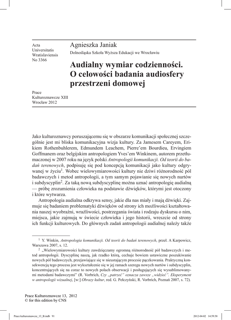 Acta Universitatis Wratislaviensis No 3366 Agnieszka Janiak Dolnośląska Szkoła Wyższa Edukacji we Wrocławiu Audialny wymiar codzienności. O celowości badania audiosfery przestrzeni domowej Prace Kulturoznawcze XIII Wrocław 2012 Jako kulturoznawcy poruszającemu się w obszarze komunikacji społecznej szczególnie jest mi bliska komunikacyjna wizja kultury. Za Jamesem Careyem, Erikiem Rothenbuhlerem, Edmundem Leachem, Pierre’em Bourdieu, Ervingiem Goffmanem oraz belgijskim antropologiem Yves’em Winkinem, autorem przetłumaczonej w 2007 roku na język polski Antropologii komunikacji. Od teorii do badań terenowych, podpisuję się pod koncepcją komunikacji jako kultury odgrywanej w życiu1. Wobec wielowymiarowości kultury nie dziwi różnorodność pól badawczych i metod antropologii, a tym samym pojawianie się nowych nurtów i subdyscyplin2. Za taką nową subdyscyplinę można uznać antropologię audialną — próbę zrozumienia człowieka na podstawie dźwięków, którymi jest otoczony i które wytwarza. Antropologia audialna odkrywa sensy, jakie dla nas miały i mają dźwięki. Zajmuje się badaniem problematyki dźwięków od strony ich możliwości kształtowania naszej wyobraźni, wrażliwości, postrzegania świata i rodzaju dyskursu o nim, miejsca, jakie zajmują w świecie człowieka i jego historii, wreszcie od strony ich funkcji kulturowych. Do głównych zadań antropologii audialnej należy także 1 Y. Winkin, Antropologia komunikacji. Od teorii do badań terenowych, przeł. A Karpowicz, Warszawa 2007, s. 12. 2 „Wielowymiarowości kultury zawdzięczamy ogromną różnorodność pól badawczych i metod antropologii. Dyscyplinę naszą, jak rzadko którą, cechuje bowiem ustawiczne poszukiwanie nowych pól badawczych, przejawiające się w nieustającym procesie pączkowania. Praktyczną konsekwencją tego procesu jest wykształcenie się w jej ramach szeregu nowych nurtów i subdyscyplin, koncentrujących się na coraz to nowych polach obserwacji i posługujących się wysublimowanymi metodami badawczymi” (R. Vorbrich, Czy „patrzeć” oznacza zawsze „widzieć”. Eksperyment w antropologii wizualnej, [w:] Obrazy kultur, red. G. Pełczyński, R. Vorbrich, Poznań 2007, s. 72). Prace Kulturoznawcze 13, 2012 © for this edition by CNS Prace kulturoznawcze_13_B.indb 91 2012-04-02 14:59:58 92 Agnieszka Janiak zbadanie możliwości audialnych i audiowizualnych technik zapisu danych jako narzędzi badawczych3. O ile antropologia wizualna ma już swoją historię, a nawet zwroty w niej4, i coraz bliższa jest wypracowania metodologii, o tyle antropologia audialna, badająca człowieka zanurzonego w audiosferze i wytwarzającego audiosferę, nie doczekała się jeszcze spójnych i usystematyzowanych ustaleń. Artykuł ten stanowi przedstawienie projektu badań, które nie zostały jeszcze przeprowadzone. Dotyczą one audialnego wymiaru codzienności, są badaniami audiosfery domowej i stanowią część projektu naukowego „Współczesna domowa komunikacja wewnątrzrodzinna” realizowanego w ramach Pracowni Antropologii Audiowizualnej przy Dolnośląskiej Szkole Wyższej. W dalszych rozważaniach posługuję się terminem „audiosfera” w odróżnieniu od fono-, melo- i sonosfery5 w rozumieniu zaproponowanym i chyba już ugruntowanym za sprawą Macieja Gołąba6, Tomasza Misiaka7, Roberta Losiaka8 i Marii Gołaszewskiej9, którzy traktują audiosferę jak „kategorię ujmującą w sposób najbardziej ogólny, najszerszy problem środowiska fonicznego człowieka — 3 Ustalenia samodzielnej subdyscypliny, za jaką proponuję uznać antropologię audialną, można wpisać w obszar wiedzy antropologii audiowizualnej, ta zaś stanowi subdyscyplinę antropologii komunikowania. Antropologia audiowizualna nie jest antropologią audiowizualości, lecz stanowi sumę wiedzy antropologii wizualnej i audialnej. 4 Lata 70., 80. — obraz jako wspomaganie i ilustracja tekstu (pozytywistyczne i realistyczne koncepcje wiedzy); koniec lat 80. — kryzys antropologii, negacja prawdy i obiektywizmu; przełom lat 80. i 90. — większa akceptacja wizualności w antropologii. Ponieważ uznano, że etnograficzny film czy fotografia nie są wcale bardziej subiektywne ani obiektywne (względność, zwrot postmodernistyczny) od tekstów pisanych, zaczęto więc formy te powszechnie akceptować; od lat 90. rosnący nacisk na interdyscyplinarność — wielozmysłowe podejście do antropologii, obrazy ważne w relacji z innymi zmysłowymi, materialnymi i dyskursywnymi elementami badawczymi; por. S. Pink, Etnografia wizualna. Obrazy, media i przedstawienie w badaniach, przeł. M Skiba, Kraków 2009. 5 Za Marią Gołaszewską: „audiosfera jest pojęciem nadrzędnym w stosunku do pozostałych i ujmującym w najbardziej ogólny sposób problem środowiska dźwiękowego rozpatrywanego przez pryzmat zdolności percepcyjnych człowieka” (eadem, Estetyka pięciu zmysłów, Warszawa-Kraków 1997, s. 78–81). Propozycją wysuniętą przez Macieja Gołąba jest skategoryzowanie melosfery jako sfery obejmującej zjawiska muzyczne, sonosfery składającej się ze zjawisk brzmieniowych oraz fonosfery zawierającej zjawiska szmerowe, zob. M. Gołąb, Próba definicji fonosystemu przedstawienia teatralnego. Na przykładzie TIS MW2 Bogusława Schaeffera, „Pamiętnik Teatralny” 2003, nr 3–4. 6 M. Gołąb, op. cit. 7 T. Misiak, Od przestrzeni akustycznej do akustycznej cyberprzestrzeni. Słyszenie w refleksji filozoficznej a muzyka elektroniczna, wykład wygłoszony podczas konferencji naukowej „Muzyka jako medium komunikacyjne” w Poznaniu w listopadzie 2007 r.; dostępny w formie elektronicznej: http://kaleka.net/files/od_przestrzeni_akustycznej_do_akustycznej_cyberprzestrzeni.doc. 8 R. Losiak, Muzyka w przestrzeni publicznej miasta. Z badań nad pejzażem dźwiękowym Wrocławia, [w:] Dźwięk w krajobrazie jako przedmiot badań interdyscyplinarnych. Prace komisji krajobrazu kultu