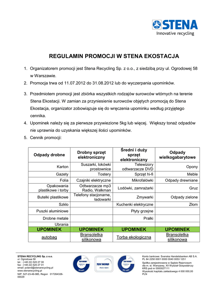 REGULAMIN PROMOCJI W STENA EKOSTACJA 1. Organizatorem promocji jest Stena Recycling Sp. z o.o., z siedzibą przy ul. Ogrodowej 58 w Warszawie. 2. Promocja trwa od 11.07.2012 do 31.08.2012 lub do wyczerpania upominków. 3. Przedmiotem promocji jest zbiórka wszystkich rodzajów surowców wtórnych na terenie Stena Ekostacji. W zamian za przyniesienie surowców objętych promocją do Stena Ekostacja, organizator zobowiązuje się do wręczenia upominku według przyjętego cennika. 4. Upominek należy się za pierwsze przywiezione 5kg lub więcej. Większy tonaż odpadów nie uprawnia do uzyskania większej ilości upominków. 5. Cennik promocji: Odpady drobne Drobny sprzęt elektroniczny Średni i duży sprzęt elektroniczny Odpady wielkogabarytowe Suszarki, lokówki prostownice Tostery Telewizory odtwarzacze DVD Sprzęt hi-fi Czajniki elektryczne Odtwarzacze mp3 Radio, Walkman Telefony stacjonarne, ładowarki Mikrofalówki Odpady drewniane Lodówki, zamrażarki Gruz Zmywarki Odpady zielone Szkło Kuchenki elektryczne Złom Puszki aluminiowe Płyty grzejne Drobne metale Pralki Karton Gazety Folia Opakowania plastikowe i torby Butelki plastikowe Opony Meble Ubrania UPOMINEK UPOMINEK UPOMINEK UPOMINEK autobag Bransoletka silikonowa Torba ekologiczna Bransoletka silikonowa STENA RECYCLING Sp. z o.o. ul. Ogrodowa 58 tel.: (+48 22) 520 27 00 fax: (+48 22) 520 27 01 email: [email protected] www.stenarecycling.pl NIP: 527-23-46-985, Regon 01726432600029 Konto bankowe: Svenska Handelsbanken AB S.A. PL 84 2250 0001 0000 0040 0053 1251 Spółka zarejestrowana w Sądzie Rejonowym dla m. st. Warszawy, XII Wydział Gospodarczy KRS pod nr 0000027111 Wysokość kapitału zakładowego 4 000 000,00 PLN 6. Promocja dotyczy wszystkich rodzajów odpadów poza odpadami niebezpiecznymi. 7. Sprzęt elektroniczny przywieziony do Stena Ekostacji musi być kompletny, to znaczy posiadać obudowę oraz mechanizmy i wyposażenie wewnętrzne. 8. Organizator promocji może odmówić wydania upominku, jeśli stwierdzi jakąkolwiek nieprawidłowość w przyniesionym materiale (niejasne pochodzenie, niekompletny elektrosprzęt). 9. Promocja przeznaczona jest dla osób indywidualnych (fizycznych). Promocją nie są objęte firmy (osoby prawne). Stena Recycling Sp. z o.o. STENA RECYCLING Sp. z o.o. ul. Ogrodowa 58 tel.: (+48 22) 520 27 00 fax: (+48 22) 520 27 01 email: [email protected] www.stenarecycling.pl NIP: 527-23-46-985, Regon 01726432600029 Konto bankowe: Svenska Handelsbanken AB S.A. PL 84 2250 0001 0000 0040 0053 1251 Spółka zarejestrowana w Sądzie Rejonowym dla m. st. Warszawy, XII Wydział Gospodarczy KRS pod nr 0000027111 Wysokość kapitału zakładowego 4 000 000,00 PLN
