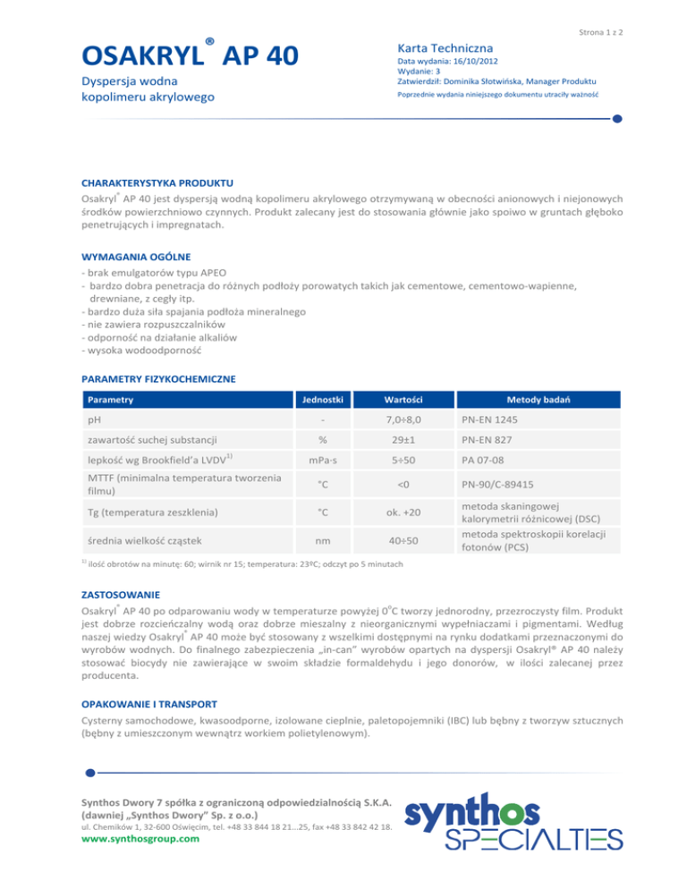 Strona 1 z 2 OSAKRYL® AP 40 Karta Techniczna Data wydania: 16/10/2012 Wydanie: 3 Zatwierdził: Dominika Słotwińska, Manager Produktu Dyspersja wodna kopolimeru akrylowego Poprzednie wydania niniejszego dokumentu utraciły ważność CHARAKTERYSTYKA PRODUKTU ® Osakryl AP 40 jest dyspersją wodną kopolimeru akrylowego otrzymywaną w obecności anionowych i niejonowych środków powierzchniowo czynnych. Produkt zalecany jest do stosowania głównie jako spoiwo w gruntach głęboko penetrujących i impregnatach. WYMAGANIA OGÓLNE - brak emulgatorów typu APEO - bardzo dobra penetracja do różnych podłoży porowatych takich jak cementowe, cementowo-wapienne, drewniane, z cegły itp. - bardzo duża siła spajania podłoża mineralnego - nie zawiera rozpuszczalników - odporność na działanie alkaliów - wysoka wodoodporność PARAMETRY FIZYKOCHEMICZNE Parametry Jednostki Wartości - 7,0÷8,0 PN-EN 1245 % 29±1 PN-EN 827 mPa∙s 5÷50 PA 07-08 MTTF (minimalna temperatura tworzenia filmu) °C <0 Tg (temperatura zeszklenia) °C ok. +20 średnia wielkość cząstek nm 40÷50 pH zawartość suchej substancji lepkość wg Brookfield’a LVDV 1) 1) Metody badań PN-90/C-89415 metoda skaningowej kalorymetrii różnicowej (DSC) metoda spektroskopii korelacji fotonów (PCS) ilość obrotów na minutę: 60; wirnik nr 15; temperatura: 23ºC; odczyt po 5 minutach ZASTOSOWANIE ® o Osakryl AP 40 po odparowaniu wody w temperaturze powyżej 0 C tworzy jednorodny, przezroczysty film. Produkt jest dobrze rozcieńczalny wodą oraz dobrze mieszalny z nieorganicznymi wypełniaczami i pigmentami. Według ® naszej wiedzy Osakryl AP 40 może być stosowany z wszelkimi dostępnymi na rynku dodatkami przeznaczonymi do wyrobów wodnych. Do finalnego zabezpieczenia „in-can” wyrobów opartych na dyspersji Osakryl® AP 40 należy stosować biocydy nie zawierające w swoim składzie formaldehydu i jego donorów, w ilości zalecanej przez producenta. OPAKOWANIE I TRANSPORT Cysterny samochodowe, kwasoodporne, izolowane cieplnie, paletopojemniki (IBC) lub bębny z tworzyw sztucznych (bębny z umieszczonym wewnątrz workiem polietylenowym). Synthos Dwory 7 spółka z ograniczoną odpowiedzialnością S.K.A. (dawniej „Synthos Dwory” Sp. z o.o.) ul. Chemików 1, 32-600 Oświęcim, tel. +48 33 844 18 21...25, fax +48 33 842 42 18. www.synthosgroup.com Strona 2 z 2 Opakowanie i transport nie podlegają przepisom dotyczącym przewozu towarów niebezpiecznych (ADR, RID). Możliwe jest stosowanie innego opakowania po uprzednim uzgodnieniu między producentem a klientem. Opakowanie nie może mieć negatywnego wpływu na jakość produktu. PRZECHOWYWANIE Przechowywać w temperaturze od 5 do 35°C. Bębny lub paletopojemniki powinny być ustawiane w jednej warstwie. Produkt przechowywany w tych warunkach zachowuje swoje właściwości w ciągu 6 miesięcy od daty produkcji. Niniejszy dokument ma charakter informacyjny. Informacje w nim podane opierają się na aktualnym stanie naszej wiedzy i doświadczeniu. Nie stanowią one gwarancji właściwości produktu ani specyfikacji jakościowej i nie mogą być podstawą do reklamacji. Przedstawione informacje nie mogą mieć zastosowania dla mieszanin produktu z innymi substancjami. Produkt powinien być transportowany, magazynowany i stosowany zgodnie z obowiązującymi przepisami oraz dobrymi praktykami higieny pracy. Wykorzystanie podanych informacji, jak i stosowanie produktu, nie są kontrolowane przez producenta, a zatem określenie warunków bezpieczeństwa stosowania jest obowiązkiem użytkownika. Synthos Dwory 7 spółka z ograniczoną odpowiedzialnością S.K.A. (dawniej „Synthos Dwory” Sp. z o.o.) ul. Chemików 1, 32-600 Oświęcim, tel. +48 33 844 18 21...25, fax +48 33 842 42 18. www.synthosgroup.com