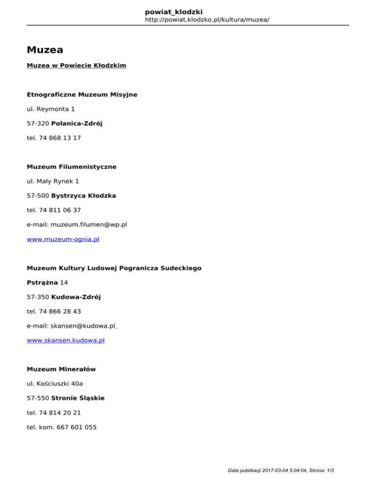 powiat_klodzki http://powiat.klodzko.pl/kultura/muzea/ Muzea Muzea w Powiecie Kłodzkim Etnograficzne Muzeum Misyjne ul. Reymonta 1 57-320 Polanica-Zdrój tel. 74 868 13 17 Muzeum Filumenistyczne ul. Mały Rynek 1 57-500 Bystrzyca Kłodzka tel. 74 811 06 37 e-mail: [email protected] www.muzeum-ognia.pl Muzeum Kultury Ludowej Pogranicza Sudeckiego Pstrążna 14 57-350 Kudowa-Zdrój tel. 74 866 28 43 e-mail: [email protected] www.skansen.kudowa.pl Muzeum Minerałów ul. Kościuszki 40a 57-550 Stronie Śląskie tel. 74 814 20 21 tel. kom. 667 601 055 Data publikacji 2017-03-04 5:04:04, Strona: 1/3 powiat_klodzki http://powiat.klodzko.pl/kultura/muzea/ Muzeum Papiernictwa ul. Kłodzka 42, 57-340 Duszniki-Zdrój tel. 74 862 74 00 e-mail [email protected] www.muzpap.pl Muzeum prof. Josefa Wittiga ul. Słupiecka 42 57-400 Nowa Ruda tel. 74 873 37 05 Muzeum Ziemi Kłodzkiej ul. Łukasiewicza 4 57-300 Kłodzko tel. 74 867 35 70 e-mail: [email protected] www.muzeum.klodzko.pl Muzeum Zabawek w Kudowie-Zdroju ul. Zdrojowa 46b 57-350 Kudowa-Zdrój tel. 74 866 49 70 e-mail: [email protected] www.muzeum-zabawek.pl Muzeum Ziemi Geologiczne - Kletno Kletno 27 57-550 Stronie Śląskie Data publikacji 2017-03-04 5:04:05, Strona: 2/3 powiat_klodzki http://powiat.klodzko.pl/kultura/muzea/ tel. 74 814 08 28 tel. kom. 607 07 40 52 e-mail: [email protected] www.muzeum-kletno.pl Muzeum Żaby ul. Słoneczna 31 57-350 Kudowa-Zdrój tel. 865 49 27 e-mail: [email protected] http://ekocentrum.pngs.com.pl/ Podziemna Trasa Turystyczna „Kopalnia Węgla Kamiennego w Nowej Rudzie” ul. Objazdowa 4 57-400 Nowa Ruda tel. 74 872 79 11 e-mail: [email protected] www.kopalnia-muzeum.pl Data publikacji 2017-03-04 5:04:05, Strona: 3/3
