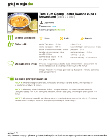 Tom Yum Goong - ostro-kwaśna zupa z krewetkami (ต้มยำกุ้ง) Dagooshya Polecane na: zupa Kuchnia (region): bałkańska Warto wiedzieć: 15 min. średni 3 porcje Składniki: pasta Tom Yum - 1 łyżka mleko kokosowe - 400 ml bulion drobiowy lub woda - 200 ml świeży sok pomidorowy lub z puszki - 200 ml dymka (biała część) - 1 szt. sos rybny - 2 łyżka Dodatkowe info: Pyszna, rozgrzewająca tajska zupa z krewetkami i pieczarkami na mleku kokosowym z sokiem pomidorowym w 15 minut! imbir - 2 cm krewetki Tiger, oczyszczone - 8 szt. pieczarki - 2 szt. olej arachidowy - 1 łyżka cytryna - 1/2 szt. cukier trzcinowy - 1/2 łyżeczka Uwagi: Krewetki nie mogą gotować się dłużej niż 4 minuty, ponieważ zrobią się gumowe. Sposób przygotowania: KROK 1: W rondlu rozgrzewamy olej. Wrzucamy drobno posiekaną dymkę, imbir pokrojony w plasterki i smażymy 2 minuty. KROK 2: Wlewamy mleko kokosowe, bulion i sok pomidorowy, doprowadzamy do wrzenia. Dodajemy pastę Tom Yum, pokrojone pieczarki, cukier i sos rybny. Dusimy pod przykryciem 7-8 minut. KROK 3: Wrzucamy krewetki, wyciskamy sok z cytryny i gotujemy jeszcze 3-4 minuty. Podajemy z makaronem ryżowym, sojowym, lub ryżem jaśminowym. Smacznego! strona 1 / 1 http://www.czarnyryz.pl.www.gotujwstylueko.pl/przepisy/tom-yum-goong-ostro-kwasna-zupa-z-krewetkam Powered by TCPDF (www.tcpdf.org)