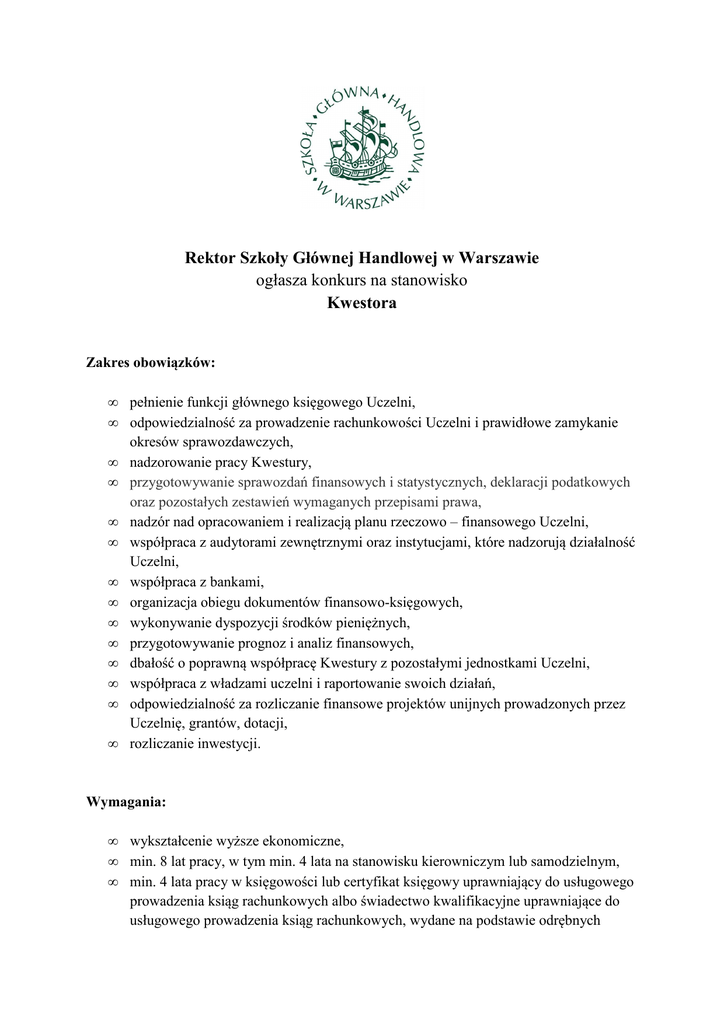 Rektor Szkoły Głównej Handlowej w Warszawie ogłasza