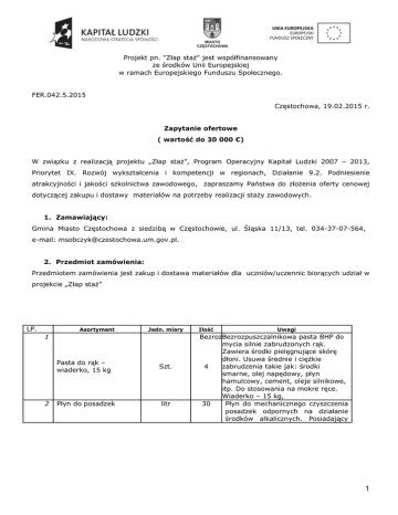 Projekt pn. "Złap staż" jest współfinansowany ze środków Unii Europejskiej w ramach Europejskiego Funduszu Społecznego. FER.042.5.2015 Częstochowa, 19.02.2015 r. Zapytanie ofertowe ( wartość do 30 000 €) W związku z realizacją projektu „Złap staż”, Program Operacyjny Kapitał Ludzki 2007 – 2013, Priorytet IX. Rozwój wykształcenia i kompetencji w regionach, Działanie 9.2. Podniesienie atrakcyjności i jakości szkolnictwa zawodowego, zapraszamy Państwa do złożenia oferty cenowej dotyczącej zakupu i dostawy materiałów na potrzeby realizacji staży zawodowych. 1. Zamawiający: Gmina Miasto Częstochowa z siedzibą w Częstochowie, ul. Śląska 11/13, tel. 034-37-07-564, e-mail: [email protected]. 2. Przedmiot zamówienia: Przedmiotem zamówienia jest zakup i dostawa materiałów dla uczniów/uczennic biorących udział w projekcie „Złap staż” LP. Asortyment Jedn. miary 1 Pasta do rąk – wiaderko, 15 kg 2 Płyn do posadzek Szt. litr Ilość Uwagi BezrozBezrozpuszczalnikowa pasta BHP do mycia silnie zabrudzonych rąk. Zawiera środki pielęgnujące skórę dłoni. Usuwa średnie i ciężkie 4 zabrudzenia takie jak: środki smarne, olej napędowy, płyn hamulcowy, cement, oleje silnikowe, itp. Do stosowania na mokre ręce. Wiaderko – 15 kg, 30 Płyn do mechanicznego czyszczenia posadzek odpornych na działanie środków alkalicznych. Posiadający 1 Projekt pn. "Złap staż" jest współfinansowany ze środków Unii Europejskiej w ramach Europejskiego Funduszu Społecznego. 3 4 5 6 7 Pokrowce foliowe na fotele logo VW opakowanie 3 Pokrowce foliowe na fotele logo Skoda opakowanie 3 Folia pod nogi , rolka opakowanie Strecz na kierownicę opakowanie 4 Osłona dźwigni zmiany biegów i hamulca ręcznego Szt. 10 Pokrowce na kierownicę Rękawice robocze opakowania Szt. 4 8 komplet 20 3 8 9 10 Ubranie robocze bardzo dobre właściwości emulgujące tłuszcze i smary, przez co doskonale sprawdzi się w myciu silnie zaolejonych posadzek w warsztatach. Pokrowce foliowe na fotele logo VW, w opakowaniu - rolka 500 sztuk Pokrowce foliowe na fotele logo Skoda, w opakowaniu - rolka 500 sztuk Folia pod nogi , w opakowaniu – rolka 500 szt. „ Stopy” Strecz na kierownicę, w jednym opakowaniu min 24 sztuki Osłona dźwigni zmiany biegów i hamulca ręcznego Pokrowce na kierownicę, średnica 40 cm, w opakowaniu 250 sztuk Rękawice robocze materiałowe Bluza robocza: Wykonana z tkaniny 60% bawełny i 40% poliester. Zapinana na zamek, kryty plisą. Wyposażona w liczne kieszenie zapinane na rzepy i zamki, kieszeń na telefon komórkowy i odpinany identyfikator. Długość rękawa regulowana rzepem na końcach. Spodnie ogrodniczki: Bardzo wygodne spodnie wykonane z tkaniny 60% bawełna i 40% poliester. Wyposażone w liczne kieszenie: dwie boczne, na obu nogawkach kieszenie na narzędzia, na piersi kieszeń zasuwana na zamek i wąska kieszeń na telefon. Z tyłu dwie kieszenie zapinane na rzepy. Na kolanach kieszenie na nakolanniki. Regulacja długości spodni na nogawkach przy pomocy rzepów. Szerokie szelki osadzone na plecach na gumowym panelu. 2 Projekt pn. "Złap staż" jest współfinansowany ze środków Unii Europejskiej w ramach Europejskiego Funduszu Społecznego. Zamawiający nie przewiduje możliwości składania ofert częściowych. 3. Wykonawca zobowiązuje się do: 1. Wykonania przedmiotu umowy zgodnie ze swoją najlepszą wiedzą oraz zgodnie z obowiązującymi przepisami prawa polskiego i wspólnotowego. 2. Wykonawca jest odpowiedzialny względem Zamawiającego za jakość świadczonej usługi. 3. Wykonawca zobowiązuje się do terminowego i sprawnego wykonania przedmiotu umowy oraz do bieżącej współpracy z Zamawiającym na każdym etapie wykonania przedmiotu umowy. 4. Termin i miejsce wykonania zamówienia: do 14 dni od dnia podpisania umowy, Zespół Szkół Samochodowo – Budowlanych w Częstochowie, Techniczne Zakłady Naukowe w Częstochowie, 5. Kryteria wyboru oferty Kryterium wyboru oferty najkorzystniejszej będzie całkowita cena ryczałtowa brutto – 100%. Oferty oceniane będą według wzoru Cn Cb X 100% = P Gdzie: Cn – cena najniższa; Cb – cena oferty badanej; P – całkowita liczba punktów. Oferta, która uzyska najwyższą liczbę punktów zostanie uznana za ofertę najkorzystniejszą. 3 Projekt pn. "Złap staż" jest współfinansowany ze środków Unii Europejskiej w ramach Europejskiego Funduszu Społecznego. 6. Składanie ofert: Ofertę cenową na formularzu ofertowym, stanowiącym załącznik nr 1 do niniejszego zapytania, należy złożyć do dnia 26.02.2015 r. do godziny 9:00 w formie: a)pisemnej w Urzędzie Miasta Częstochowy, ul .Śląska 11/13, 42-217 Częstochowa, pok. nr 324; b) faxem na numer 34 3707170 c) drogą elektroniczną na e-mail: [email protected] 7. Osoba uprawniona do kontaktów z Wykonawcami: Pani Marta Sobczyk tel. 034-3707-564, e-mail: [email protected]. 8. Informacja w sprawie umowy: Z Wykonawcą, który złoży najkorzystniejszą ofertę, zostanie podpisana umowa, której wzór stanowi załącznik nr 2 do niniejszego zapytania. Wzór formularza ofertowego i wzór umowy można uzyskać pod adresem: Wydział Funduszy Europejskich i Rozwoju Urzędu Miasta Częstochowy, ul. Śląska 11/13, Marta Sobczyk, pok. 324 oraz na stronie internetowej zamawiającego: http://bip.czestochowa.pl Załączniki do zapytania ofertowego: 1Wzór formularza ofertowego. 2Wzór umowy. 4 Projekt pn. "Złap staż" jest współfinansowany ze środków Unii Europejskiej w ramach Europejskiego Funduszu Społecznego. 5