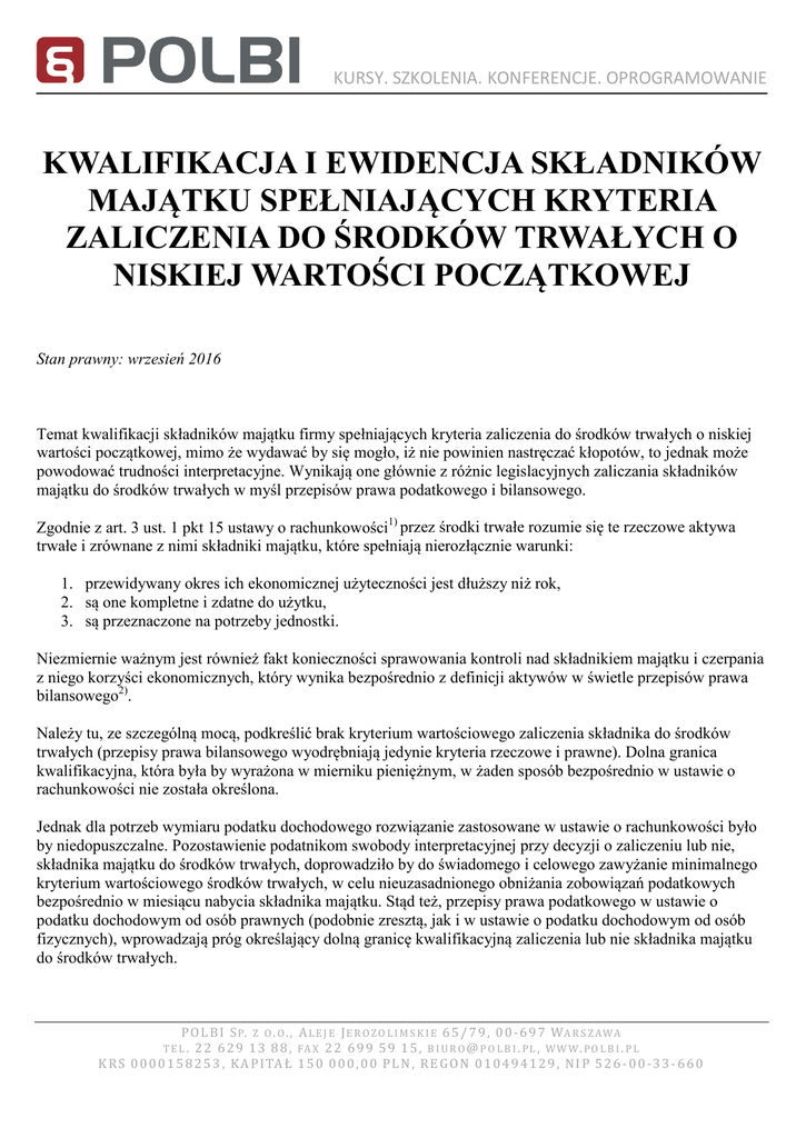 KURSY. SZKOLENIA. KONFERENCJE. OPROGRAMOWANIE KWALIFIKACJA I EWIDENCJA SKŁADNIKÓW MAJĄTKU SPEŁNIAJĄCYCH KRYTERIA ZALICZENIA DO ŚRODKÓW TRWAŁYCH O NISKIEJ WARTOŚCI POCZĄTKOWEJ Stan prawny: wrzesień 2016 Temat kwalifikacji składników majątku firmy spełniających kryteria zaliczenia do środków trwałych o niskiej wartości początkowej, mimo że wydawać by się mogło, iż nie powinien nastręczać kłopotów, to jednak może powodować trudności interpretacyjne. Wynikają one głównie z różnic legislacyjnych zaliczania składników majątku do środków trwałych w myśl przepisów prawa podatkowego i bilansowego. Zgodnie z art. 3 ust. 1 pkt 15 ustawy o rachunkowości1) przez środki trwałe rozumie się te rzeczowe aktywa trwałe i zrównane z nimi składniki majątku, które spełniają nierozłącznie warunki: 1. przewidywany okres ich ekonomicznej użyteczności jest dłuższy niż rok, 2. są one kompletne i zdatne do użytku, 3. są przeznaczone na potrzeby jednostki. Niezmiernie ważnym jest również fakt konieczności sprawowania kontroli nad składnikiem majątku i czerpania z niego korzyści ekonomicznych, który wynika bezpośrednio z definicji aktywów w świetle przepisów prawa bilansowego2). Należy tu, ze szczególną mocą, podkreślić brak kryterium wartościowego zaliczenia składnika do środków trwałych (przepisy prawa bilansowego wyodrębniają jedynie kryteria rzeczowe i prawne). Dolna granica kwalifikacyjna, która była by wyrażona w mierniku pieniężnym, w żaden sposób bezpośrednio w ustawie o rachunkowości nie została określona. Jednak dla potrzeb wymiaru podatku dochodowego rozwiązanie zastosowane w ustawie o rachunkowości było by niedopuszczalne. Pozostawienie podatnikom swobody interpretacyjnej przy decyzji o zaliczeniu lub nie, składnika majątku do środków trwałych, doprowadziło by do świadomego i celowego zawyżanie minimalnego kryterium wartościowego środków trwałych, w celu nieuzasadnionego obniżania zobowiązań podatkowych bezpośrednio w miesiącu nabycia składnika majątku. Stąd też, przepisy prawa podatkowego w ustawie o podatku dochodowym od osób prawnych (podobnie zresztą, jak i w ustawie o podatku dochodowym od osób fizycznych), wprowadzają próg określający dolną granicę kwalifikacyjną zaliczenia lub nie składnika majątku do środków trwałych. P O L B I S P. Z O . O . , A L E J E J E R O Z O L I M S K I E 6 5 / 7 9 , 0 0 - 6 9 7 W A R S Z A WA 2 2 6 2 9 1 3 8 8 , FA X 2 2 6 9 9 5 9 1 5 , B I U R O @ P O L B I . P L , W W W . P O L B I . P L K R S 0 0 0 0 1 5 8 2 5 3 , K A P I TA Ł 1 5 0 0 0 0 , 0 0 P L N , R E G O N 0 1 0 4 9 4 1 2 9 , N I P 5 2 6 - 0 0 - 3 3 - 6 6 0 TEL. KURSY. SZKOLENIA. KONFERENCJE. OPROGRAMOWANIE Artykuł 16d ust. 1 ustawy o podatku dochodowym od osób prawnych3) stanowi, iż podatnicy mogą nie dokonywać odpisów amortyzacyjnych od składników majątku, o których mowa w art. 16a i 16b, których wartość początkowa określona zgodnie z art. 16g nie przekracza 3.500 zł; wydatki poniesione na ich nabycie stanowią wówczas koszty uzyskania przychodów w miesiącu oddania ich do używania. Na marginesie należy tu zwrócić uwagę na fakt wyłączenia z ww. artykułu 16d ust. 1 zapisów określonych artykułem 16c wspomnianej4)ustawy, co oznacza, że: 1. grunty i prawa wieczystego użytkowania gruntów, 2. budynki, lokale, budowle i urządzenia zaliczane do spółdzielczych zasobów mieszkaniowych lub służących działalności społeczno-wychowawczej prowadzonej przez spółdzielnie mieszkaniowe, 3. dzieła sztuki i eksponaty muzealne, 4. wartość firmy, jeżeli wartość ta powstała w inny sposób niż określony w art. 16b ust. 2 pkt 2, 5. składniki majątku, które nie są używane na skutek zawieszenia wykonywania działalności gospodarczej na podstawie przepisów o swobodzie działalności gospodarczej albo zaprzestania działalności, w której te składniki były używane - będą zaliczone do środków trwałych (lub wartości niematerialnych i prawnych) niezależnie od ich wartości początkowej. Ustawy o podatkach dochodowych ustaliły dolny próg kryterium konieczności zaliczenia składników majątku do środków trwałych na kwotę większą niż 3.500 zł. W oparciu o cytowane już artykuły ustawy o podatku dochodowym od osób prawnych można zatem stwierdzić, iż podatnicy, przy zakupie składników majątku wartości nie większej niż 3.500 zł, mogą zastosować jedno z trzech rozwiązań: 1. nie zaliczać tego składnika majątku do środków trwałych, a wydatki poniesione na jego nabycie będą stanowić koszt uzyskania przychodów w dacie poniesienia kosztu, 2. zaliczyć ten składnik do środków trwałych i skorzystać z prawa do jednorazowej amortyzacji5) w miesiącu zakupu lub w miesiącu następnym, 3. zaliczyć ten składnik do środków trwałych i amortyzować go w okresach przyszłych na zasadach zgodnie z art. 16h-16m ustawy o podatku dochodowym od osób prawnych. Podobne rozwiązanie dopuszcza również ustawa o rachunkowości, gdzie niskocenne składniki majątku mogą być: 1. nie wprowadzone do ewidencji bilansowej środków trwałych, a wydatek na ich zakup może być zarachowany w ciężar kosztów operacyjnych w miesiącu zużycia (zakupu, wytworzenia, otrzymania), 2. wprowadzone do ewidencji bilansowej środków trwałych z prawem do jednorazowej amortyzacji w miesiącu oddania do używania (art. 32 ust. 6 ustawy o rachunkowości)6), 3. wprowadzone do ewidencji bilansowej z prawem dokonywania odpisów amortyzacyjnych według zasad ogólnych określonych w art. 32 ustawy o rachunkowości7). Problemem w prawie bilansowym jest jednak, tak jak wspomniano wcześniej, pominięcie (celowe zresztą) kryterium wartościowego przy definicji środka trwałego. Jego całkowity brak oznaczał by jednak, iż każdy składnik majątku spełniający kryterium prawne i rzeczowe, musiał by zostać zaliczony do środków trwały