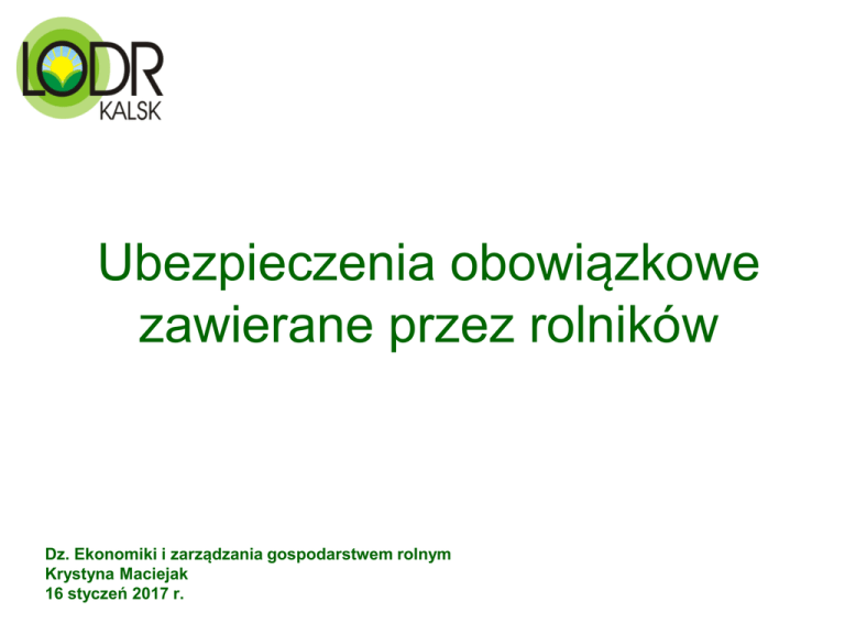 Ubezpieczenia obowiązkowe zawierane przez rolników Dz. Ekonomiki i zarządzania gospodarstwem rolnym Krystyna Maciejak 16 styczeń 2017 r. Ubezpieczenia obowiązkowe W myśl przepisów prawa każda osoba fizyczna zajmująca się działalnością rolniczą, posiadająca areał użytków rolnych przekraczający łącznie 1ha i opłacająca w części lub całości podatek rolny, ma obowiązek zawarcia ubezpieczeń obowiązkowych. Uregulowania prawne: Ustawa z dnia 22 maja 2003 r. o ubezpieczeniach obowiązkowych, Ubezpieczeniowym Funduszu Gwarancyjnym oraz Polskim Biurze Ubezpieczycieli Komunikacyjnych (Dz. U. z 2013 r., poz. 392 z późn. zm.), Ustawa z dnia 7 lipca 2005 r. o ubezpieczeniach upraw rolnych i zwierząt gospodarskich (Dz. U z 2016 r., poz.792 z późn. zm.). Ubezpieczenia obowiązkowe Zgodnie z zapisami Ustawy, Dz. U. z 2013 r., poz. 392, Art. 4., Ubezpieczeniami obowiązkowymi są: 1) ubezpieczenie odpowiedzialności cywilnej posiadaczy pojazdów mechanicznych za szkody powstałe w związku z ruchem tych pojazdów, zwane dalej „ubezpieczeniem OC posiadaczy pojazdów mechanicznych”; 2) ubezpieczenie odpowiedzialności cywilnej rolników z tytułu posiadania gospodarstwa rolnego, zwane dalej „ubezpieczeniem OC rolników”; 3) ubezpieczenie budynków wchodzących w skład gospodarstwa rolnego od ognia i innych zdarzeń losowych, zwane dalej „ubezpieczeniem budynków rolniczych”; 4) ubezpieczenia wynikające z przepisów odrębnych ustaw lub umów międzynarodowych ratyfikowanych przez Rzeczpospolitą Polską, nakładających na określone podmioty obowiązek zawarcia umowy ubezpieczenia.. Ubezpieczenia upraw rolnych i zwierząt gospodarskich 1. Rolnik, który uzyskał płatności bezpośrednie w rozumieniu przepisów o płatnościach w ramach systemu wsparcia bezpośredniego, jest obowiązany zawrzeć umowę ubezpieczenia obowiązkowego upraw, od ryzyka wystąpienia szkód spowodowanych przez powódź, suszę, grad, ujemne skutki przezimowania lub przymrozki wiosenne. 2. Obowiązek ubezpieczenia, uważa się za spełniony, jeżeli od dnia 1 lipca roku następującego po roku, za który rolnik uzyskał płatności bezpośrednie, w okresie 12 miesięcy, ochroną ubezpieczeniową objęte jest co najmniej 50% powierzchni upraw, od co najmniej jednego z wymienionych ryzyk. Ubezpieczenia upraw rolnych i zwierząt gospodarskich Ubezpieczenia upraw rolnych i zwierząt gospodarskich Zgodnie z zapisami ustawy z dnia 7 lipca 2005 r. o ubezpieczeniach upraw rolnych i zwierząt gospodarskich (Dz. U. z 2016 r. poz. 792, z późn. zm.) ze środków budżetu państwa są udzielane dopłaty do składek z tytułu zawarcia umów ubezpieczenia: 1) upraw zbóż, kukurydzy, rzepaku, rzepiku, chmielu, tytoniu, warzyw gruntowych, drzew i krzewów owocowych, truskawek, ziemniaków, buraków cukrowych lub roślin strączkowych, od zasiewu lub wysadzenia do ich zbioru, od ryzyka wystąpienia szkód spowodowanych przez huragan, powódź, deszcz nawalny, grad, piorun, obsunięcie się ziemi, lawinę, suszę, ujemne skutki przezimowania oraz przymrozki wiosenne lub 2) bydła, koni, owiec, kóz, drobiu lub świń od ryzyka wystąpienia szkód spowodowanych przez huragan, powódź, deszcz nawalny, grad, piorun, obsunięcie się ziemi, lawinę oraz w wyniku uboju z konieczności. Ubezpieczenia upraw rolnych i zwierząt gospodarskich Umowa ubezpieczenia uprawy obejmuje uprawy roślin, uprawianych w plonie głównym, przy czym za plon główny uznaje się w przypadku: 1) buraków cukrowych – korzenie buraka; 2) kukurydzy przeznaczonej na paszę – kolby i nadziemne części rośliny; 3) zbóż, rzepaku i rzepiku, kukurydzy przeznaczonej na ziarno – ziarna lub nasiona; 4) ziemniaków – bulwy; 5) warzyw gruntowych – części warzyw gruntowych przeznaczone do konsumpcji; 6) drzew i krzewów owocowych oraz truskawek – owoce lub całe nasadzenia; 7) chmielu – szyszki; 8) tytoniu – liście; 9) roślin strączkowych – nasiona. Ubezpieczenia upraw rolnych i zwierząt gospodarskich Ubezpieczenia upraw rolnych i zwierząt gospodarskich Dopłaty wynoszą (Dz. U 2016 poz.2181 zm. Ustawy ), w przypadku ubezpieczenia upraw albo zwierząt od wszystkich rodzajów ryzyka, 1) do 65% składki z tytułu ubezpieczenia upraw, jeżeli określone przez zakłady ubezpieczeń stawki taryfowe ubezpieczenia od ubezpieczenia upraw od wszystkich rodzajów ryzyka, nie przekraczają 9% sumy ubezpieczenia, a w przypadku: a) upraw prowadzonych na użytkach rolnych klasy V – nie przekraczają 12% sumy ubezpieczenia tych upraw, b) upraw prowadzonych na użytkach rolnych klasy VI – nie przekraczają 15% sumy ubezpieczenia tych upraw; 2) do 65% składki z tytułu ubezpieczenia zwierząt, jeżeli określone przez zakłady ubezpieczeń stawki taryfowe ubezpieczenia od ubezpieczenia zwierząt od wszystkich rodzajów ryzyka, nie przekraczają 0,5% sumy ubezpieczenia. Ubezpieczenia upraw rolnych i zwierząt gospodarskich Zgodnie zapisami Rozporządzenia Rady Ministrów z dnia 24.11.2016 r. (Dz. U. 2016 poz. 1937) w sprawie wysokości dopłat do składek z tytułu ubezpieczenia upraw rolnych i zwierząt gospodarskich w 2017 r. dopłata do składki z tytułu ubezpieczenia dla: 1) upraw zbóż, kukurydzy, rzepaku, rzepiku, chmielu, tytoniu, warzyw gruntowych, drzew i krzewów owocowych, truskawek, ziemniaków, buraków cukrowych lub roślin strączkowych – wynosi 65% składki do 1 ha uprawy; 2) bydła, koni, owiec, kóz, drobiu lub świń – wynosi 65% składki do 1 sztuki. Ubezpieczenia upraw rolnych i zwierząt gospodarskich Sumy ubezpieczenia, odrębnie dla każdej uprawy rolnej i każdego zwierzęcia gospodarskiego, producent rolny ustala z zakładem ubezpieczeń w umowie ubezpieczenia, z tym że nie mogą one przekroczyć maksymalnych sum ubezpieczenia określanych corocznie, w terminie do dnia 30 listopada, przez Ministra Rolnictwa i Rozwoju Wsi w drodze rozporządzenia na kolejny rok. Producent rolny może zawrze