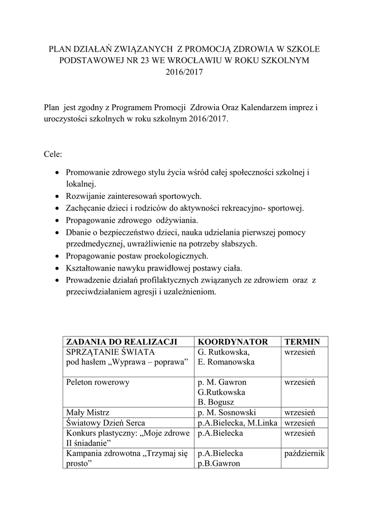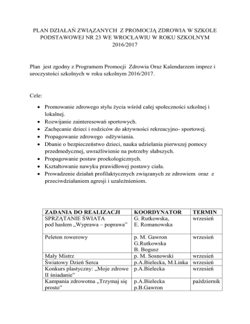 PLAN DZIAŁAŃ ZWIĄZANYCH Z PROMOCJĄ ZDROWIA W SZKOLE PODSTAWOWEJ NR 23 WE WROCŁAWIU W ROKU SZKOLNYM 2016/2017 Plan jest zgodny z Programem Promocji Zdrowia Oraz Kalendarzem imprez i uroczystości szkolnych w roku szkolnym 2016/2017. Cele: Promowanie zdrowego stylu życia wśród całej społeczności szkolnej i lokalnej. Rozwijanie zainteresowań sportowych. Zachęcanie dzieci i rodziców do aktywności rekreacyjno- sportowej. Propagowanie zdrowego odżywiania. Dbanie o bezpieczeństwo dzieci, nauka udzielania pierwszej pomocy przedmedycznej, uwrażliwienie na potrzeby słabszych. Propagowanie postaw proekologicznych. Kształtowanie nawyku prawidłowej postawy ciała. Prowadzenie działań profilaktycznych związanych ze zdrowiem oraz z przeciwdziałaniem agresji i uzależnieniom. ZADANIA DO REALIZACJI SPRZĄTANIE ŚWIATA pod hasłem „Wyprawa – poprawa” Peleton rowerowy KOORDYNATOR G. Rutkowska, E. Romanowska p. M. Gawron G.Rutkowska B. Bogusz Mały Mistrz p. M. Sosnowski Światowy Dzień Serca p.A.Bielecka, M.Linka Konkurs plastyczny: „Moje zdrowe p.A.Bielecka II śniadanie” Kampania zdrowotna „Trzymaj się p.A.Bielecka prosto” p.B.Gawron TERMIN wrzesień wrzesień wrzesień wrzesień wrzesień październik Rozgrywki szkolne w koszykówkę Szkolny Turniej w siatkówkę Szkolne rozgrywki w tenisie Szkolny konkurs „Udzielamy pierwszej pomocy” Konkurs plastyczny: „Sport to moje hobby” Tydzień ,, Stop przemocy” Pierwszy krok szermierczy Kampania zdrowotna: „Wrocławskie dni walki z hałasem” Dzień Ziemi p. M. Sosnowski p. B . Grudzińska p. M. Sosnowski p. B . Grudzińska październik listopad grudzień styczeń p. B . Grudzińska luty p.M.Kowal p. J. Dzikowski p.A.Bielecka A.Bilina D .Kolarzowska, E. Supińska M. Krumin luty luty marzec Turniej piłki nożnej p.B .Grudzińska p.B.Gawron p. J. Dzikowski p.R.Rumianowski A. Wardęga, A. Kurmańska, A. A. Bielecka, A. Rybińska kwiecień Ogólnopolski Turniej Szermierczy „ Galeria” Dzień sportu kl 1-3 Dzień Dziecka ,,Śniadanie na trawie”- projekt edukacyjny p. J. Dzikowski maj A. Wardęga, Rada Rodziców A.Bielecka B.Bogusz czerwiec czerwiec czerwiec Twój piękny uśmiech – program stomatologiczny kl. 5 Pierwsza pomoc kl. 4-6 Fluoryzacja zębów Higiena ciała kl.6 Warsztaty” Joga dla każdego” Zdrowy styl życia – kl 2 Dzień zdrowego śniadania Międzynarodowy dzień walki z otyłością Akcje charytatywne Pielęgniarka szkolna I sem. Pielęgniarka szkolna Pielęgniarka szkolna Pielęgniarka szkolna p.M.Linka Pielęgniarka szkolna M.Bartela Wych. Świetlicy II sem. cały rok II sem. cały rok II sem I sem. marzec Pedagog szkolny, nauczyciele cały rok Egzamin na kartę rowerową Turniej gier planszowych 1-3. Tydzień dla bezpieczeństwa kwiecień maj kwiecień maj Działania profilaktyczne, zdrowy styl życia, agresja, uzależnienia Akcja – Szklanka mleka Akcja – owoce w szkole Wycieczki szkolne, Zielone szkoły Tematyczne koła zainteresowań Pedagog szkolny, psycholodzy, nauczyciele Wychowawcy Wychowawcy Wychowawcy Nauczyciele cały rok cały rok cały rok cały rok cały rok Lider Promocji Zdrowia: Anna Bielecka