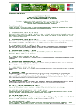 Znak sprawy: DR-240-7/16 OGŁOSZENIE O ZAMÓWIENIU O WARTOŚCI NIE PRZEKRACZAJĄCEJ WYRAŻONEJ W ZŁOTYCH RÓWNOWARTOŚCI KWOTY 30 000 EURO W niniejszym postępowaniu nie stosuje się przepisów ustawy z dnia 29 stycznia 2004 r. Prawo zamówień publicznych (j.t.: Dz. U. z 2013 r., poz. 907 z późn. zm.) – art. 4 pkt. 8. Szacowana wartość zamówienia nie przekracza 30.000 euro. Przedmiot zamówienia: Dostawy do siedziby Instytutu Nafty i Gazu – Państwowego Instytutu Badawczego w Krakowie (ul. Łukasiewicza 1 w Krakowie) upominków firmowych oznakowanych logotypami INIG-PIB, wg poniższego wykazu: 1. SMYCZ REKLAMOWA TAŚMA - Wzór 1, 500 szt. Znakowanie dwustronne, jeden kolor (logotyp + nazwa firmy i adres www.inig.pl), nadruk na wysokiej jakości taśmie satynowej w kolorze zielonym (zbliżonym do PANTONE 349 C) szer. smyczy 15 mm, długość – nie mniej niż 900 mm i nie więcej niż 950 mm, smycz z metalowym karabińczykiem. 2. SMYCZ REKLAMOWA TAŚMA - Wzór 2 – 130 szt. Znakowanie dwustronne, full kolor, logotyp, nazwa konferencji, nadruk na wysokiej jakości taśmie satynowej w kolorze białym) szer. smyczy 15 mm, długość – nie mniej niż 900 mm i nie więcej niż 950 mm, smycz z metalowym karabińczykiem. 3. SMYCZ REKLAMOWA TAŚMA - WZÓR 3 – 50 szt. Znakowanie dwustronne, full kolor, logotyp, nazwa konferencji, nadruk na wysokiej jakości taśmie satynowej w kolorze białym) szer. smyczy 15 mm, długość – nie mniej niż 900 mm i nie więcej niż 950 mm, smycz z metalowym karabińczykiem. 4. DŁUGOPIS COSMO ZIELONY C13 – 300 szt. Długopis cosmo w kolorze zielonym C13 z metalowym klipem i metalowymi zdobieniami. Wkład niebieski. Znakowanie - grawer - logotyp INIG-PIB pod klipem. 5. DŁUGOPIS COSMO NIEBIESKI C11 - 500 szt. Długopis cosmo w kolorze niebieskim C11, z metalowym klipem i metalowymi zdobieniami. Wkład niebieski. Znakowanie - grawer pod klipem. 6. DŁUGOPIS COSMO POMARAŃCZOWY C05 – 150 szt. Długopis cosmo w kolorze pomarańczowym C05 z metalowym klipem i metalowymi zdobieniami. Wkład niebieski. Znakowanie grawer - logotypem konferencji Środki Smarowe pod klipem. 7. DŁUGOPIS COSMO CZARNY C01 – 50 szt. Długopis cosmo w kolorze czarny C01 z metalowym klipem i metalowymi zdobieniami. Wkład niebieski. Znakowanie - grawer pod klipem. 8. POWERBANK – 130 szt. Powerbank w zestawie z kablem USB ze złączem microUSB (długość ok. 25cm), czerwona dioda LED oznacza ładowanie, niebieska dioda LED oznacza działanie urządzenia, przełącznik on/off, moc wejściowa 5V, czas ładowania: ok. 4 godzin, pojemność 2200 mAh, wysokiej jakości akumulator litowo-jonowy, elegancka metalowa obudowa. Wymiary: 10 x 2 x 2 cm, kolor czarny, znakowanie na powerbanku logotypem konferencji Środki Smarowe 9. ZEGAR BIURKOWY – 130 szt. Zegar na biurko ze stacją pogodową, funkcją alarmu, datą, higrometrem, termometrem i podświetlanym ekranem LCD. Materiał: tworzywo sztuczne, kolor czarny Wymiary: 14 x 8 x 1,8 cm. Znakowanie logotypem konferencji Środki Smarowe. 10. BRELOK Z NAKLEJKĄ EPOKSYDOWĄ 3D – 200 szt. Wymiary 2,3*2,3 cm, brelok metalowy dwustronny z naklejkami 3D, projekt naklejki po stronie zamawiającego. 11. KARTECZKI SAMOPRZYLEPNE 100 X 74 MM * 50 SZT – 300 szt. Karteczki samoprzylepne białe typu post-it, wymiar przybliżony 100 mm x 75 mm, po 50 kartek w bloczku, druk 4+0, na białej podkładce kartonowej. Klejone po dłuższym boku. Projekt po stronie zamawiającego 12. PLECAK SKŁADANY – 100 szt. Plecak posiada jedną dużą kieszeń zamykaną na zamek błyskawiczny. Można złożyć go w kulkę o niewielkich rozmiarach. Materiał: poliester. Wymiary: 315 x 310 x 15 mm. Kolor: czarny. Znakowanie logotypem INIG-PIB 13. ZEGAREK SILIKONOWY – 50 szt. Zegarek z wyświetlaczem LED i silikonowym paskiem. Zapakowany w okrągłe przezroczyste plastikowe pudełko PET. 1 bateria pastylkowa dołączona. Materiał: silikon. Wymiary: 24 x 2,7 x 1 cm Kolor: czarny. Znakowanie logotypem INIG-PIB 14. PIÓRO NA WKLADY PARKER IM K. CZARNY CT W PUDEŁKU – 50 szt. Styl klasyczny, kolor czarny. Pakowany w eleganckie pudełko. Nadruk na pudełku: INSTYTUT NAFTY I GAZU - Państwowy Instytut Badawczy. 15. PAMIĘĆ USB 32 GB – 50 szt. Pamięć USB 32 GB, połączenie aluminium i plastiku wymiary ok. 74*18*8, złącze micro usb 2.0, z możliwością podpięcia do telefonu komórkowego, kolor zielony, smyczka do telefonu, pakowany w pudełko, znakowanie na pamięci. Znakowanie logotypem INIG-PIB. 16. PAMIĘĆ USB 8 GB – WZÓR I – 130 szt. Pamięć USB 8 GB, połączenie aluminium i plastiku wymiary ok. 74*18*8, zlacze microusb 2.0, z możliwością podpięcia do telefonu komórkowego, kolor czarny, grawer, smyczka do telefonu, pakowany w pudełko, znakowanie na pamięci logotypem konferencji Środki Smarowe. 17. PAMIĘĆ USB 8 GB – WZÓR II – 50 szt. Pamięć USB 8 GB, połączenie aluminium i plastiku wymiary ok. 74*18*8, zlacze microusb 2.0, z możliwością podpięcia do telefonu komórkowego, kolor srebrny smyczka do telefonu, pakowany w pudełko, znakowanie na pamięci pamięci logotypem konferencji Propelanty.. 18. GŁOŚNIK BLUETOOTH – 100 szt. Głośnik Bluetooth, zasilanie USB, Materiał: tworzywo sztuczne, Wymiary: Ø6 x 7,5 cm, kolor czarny. Znakowanie logotypem INIGPIB. Składanie oferty: Wykonawca wraz z ofertą dostarczy próbkę przedmiotu zamówienia zgodnie z opisem (lub równoważnego), którego wzór będzie oceniany przez Komisję Zamawiającego. Każdy przedmiot powinien być zapakowany w opakowanie jednostkowe białe, srebrne lub czarne. Przedstawiona oferta cenowa powinna uwzględniać koszt przygotowania wizualizacji znakowanego produktu, jego znakowania, pakowania i transportu. Wybrany wzór będzie wiążący po podpisaniu umowy, przy realizacji zamówienia. Wykonawca, po podpisaniu umowy, jest zobowiązany do przedstawienia Zamawiającemu wizualizacji znakowania i uzyskania jego akceptacji przed dostarczeniem przed