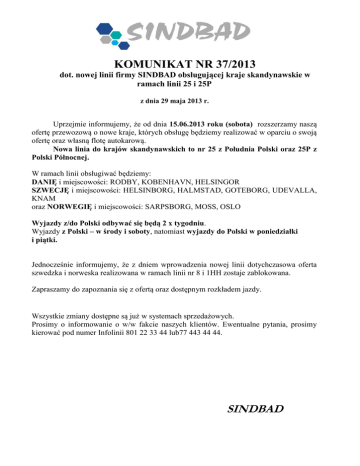 KOMUNIKAT NR 37/2013 dot. nowej linii firmy SINDBAD obsługującej kraje skandynawskie w ramach linii 25 i 25P z dnia 29 maja 2013 r. Uprzejmie informujemy, że od dnia 15.06.2013 roku (sobota) rozszerzamy naszą ofertę przewozową o nowe kraje, których obsługę będziemy realizować w oparciu o swoją ofertę oraz własną flotę autokarową. Nowa linia do krajów skandynawskich to nr 25 z Południa Polski oraz 25P z Polski Północnej. W ramach linii obsługiwać będziemy: DANIĘ i miejscowości: RODBY, KOBENHAVN, HELSINGOR SZWECJĘ i miejscowości: HELSINBORG, HALMSTAD, GOTEBORG, UDEVALLA, KNAM oraz NORWEGIĘ i miejscowości: SARPSBORG, MOSS, OSLO Wyjazdy z/do Polski odbywać się będą 2 x tygodniu. Wyjazdy z Polski – w środy i soboty, natomiast wyjazdy do Polski w poniedziałki i piątki. Jednocześnie informujemy, że z dniem wprowadzenia nowej linii dotychczasowa oferta szwedzka i norweska realizowana w ramach linii nr 8 i 1HH zostaje zablokowana. Zapraszamy do zapoznania się z ofertą oraz dostępnym rozkładem jazdy. Wszystkie zmiany dostępne są już w systemach sprzedażowych. Prosimy o informowanie o w/w fakcie naszych klientów. Ewentualne pytania, prosimy kierować pod numer Infolinii 801 22 33 44 lub77 443 44 44. SINDBAD