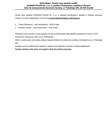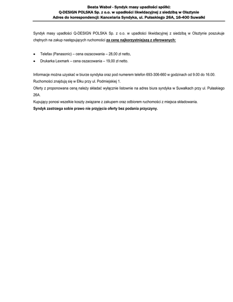 Beata Waboł - Syndyk masy upadłości spółki: Q-DESIGN POLSKA Sp. z o.o. w upadłości likwidacyjnej z siedzibą w Olsztynie Adres do korespondencji: Kancelaria Syndyka, ul. Pułaskiego 26A, 16-400 Suwałki Syndyk masy upadłości Q-DESIGN POLSKA Sp. z o.o. w upadłości likwidacyjnej z siedzibą w Olsztynie poszukuje chętnych na zakup następujących ruchomości za cenę najkorzystniejszą z oferowanych: Telefax (Panasonic) – cena oszacowania – 28,00 zł netto, Drukarka Lexmark – cena oszacowania – 19,00 zł netto. Informacje można uzyskać w biurze syndyka oraz pod numerem telefon 693-306-660 w godzinach od 9.00 do 16.00. Ruchomości znajdują się w Ełku przy ul. Podmiejskiej 1. Oferty z proponowana ceną należy składać wyłącznie listownie na adres biura syndyka w Suwałkach przy ul. Pułaskiego 26A. Kupujący ponosi wszelkie koszty związane z zakupem oraz odbiorem ruchomości z miejsca składowania. Syndyk zastrzega sobie prawo nie przyjęcia oferty bez podania przyczyny.