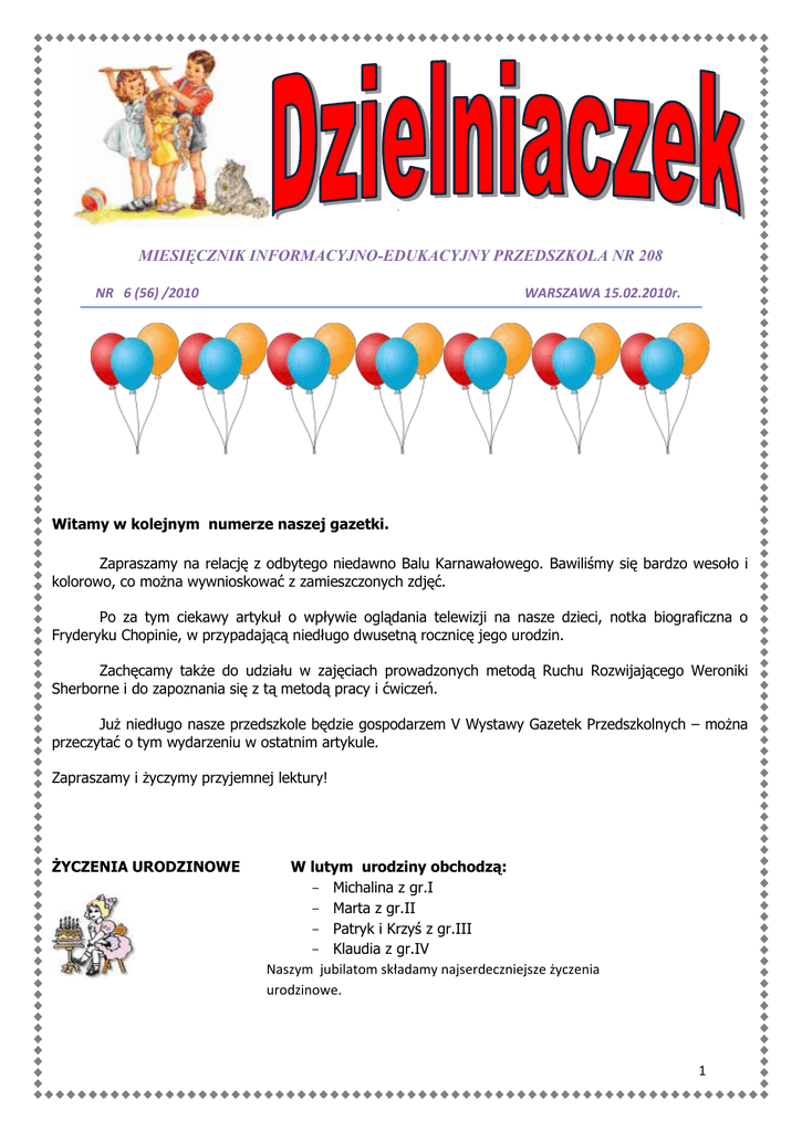 MIESIĘCZNIK INFORMACYJNO-EDUKACYJNY PRZEDSZKOLA NR 208 NR 6 (56) /2010 WARSZAWA 15.02.2010r. Witamy w kolejnym numerze naszej gazetki. Zapraszamy na relację z odbytego niedawno Balu Karnawałowego. Bawiliśmy się bardzo wesoło i kolorowo, co można wywnioskować z zamieszczonych zdjęć. Po za tym ciekawy artykuł o wpływie oglądania telewizji na nasze dzieci, notka biograficzna o Fryderyku Chopinie, w przypadającą niedługo dwusetną rocznicę jego urodzin. Zachęcamy także do udziału w zajęciach prowadzonych metodą Ruchu Rozwijającego Weroniki Sherborne i do zapoznania się z tą metodą pracy i ćwiczeń. Już niedługo nasze przedszkole będzie gospodarzem V Wystawy Gazetek Przedszkolnych – można przeczytać o tym wydarzeniu w ostatnim artykule. Zapraszamy i życzymy przyjemnej lektury! ŻYCZENIA URODZINOWE W lutym urodziny obchodzą: - Michalina z gr.I - Marta z gr.II - Patryk i Krzyś z gr.III - Klaudia z gr.IV Naszym jubilatom składamy najserdeczniejsze życzenia urodzinowe. 1 W KARNAWALE SAME BALE „Bal w przedszkolu” Dziś w przedszkolu wielki bal, Tańczy razem ze sto par, Lalka Barbie, miś Puchatek, W czerwonym kubraczku skrzatek. Trzy księżniczki, bury miś Tańczą walca raz, dwa, trzy. Zorro z Batmanem pomyka, Wesoło dziś gra muzyka. Dnia 16.02.2010 roku odbył się w naszym przedszkolu Bal Karnawałowy. Na zabawę przybyły dzieci ze wszystkich grup w pięknych, kolorowych strojach. Bawili się z nami : Krasnoludki i Sierotka Marysia, Klaun, Batman, Superman, Kopciuszek, Biedronka, Stonoga, Indianin oraz wiele innych, równie bajkowych postaci. Tańczyliśmy w rytm największych przebojów muzyki dziecięcej. Dzieci wzięły udział w licznych konkursach i zabawach przygotowanych przez panie nauczycielki ze wszystkich oddziałów. W świetnym nastroju pożegnaliśmy odchodzący karnawał. Opracowała: mgr Aleksandra Guzińska 2 TELEWIZJA A DZIECKO Środki masowego przekazu oddziałują na współczesne dzieci już od pierwszych miesięcy życia i stopniowo, w miarę rozwoju dziecka, stają się coraz ważniejsze. Telewizja wpływa na rozwój psychiczny i fizyczny dzieci. Nawet gdy dziecko korzysta z niej przy odpowiednim oświetleniu i z zachowaniem odpowiedniej odległości oraz właściwej postawy, nawet przy przestrzeganiu najważniejszych zasad, jej wpływ jest niekorzystny. Dziecko jest bowiem bierne, nieruchome, a im jest młodsze, tym bardziej jest mu potrzebny ruch. Oglądanie filmów ogranicza najczęściej inne zajęcia, przede wszystkim ruchowe i pobyt na powietrzu. Ograniczenie to ma negatywny wpływ na dzieci znajdujące się przecież w okresie intensywnego rozwoju fizycznego. Telewizja dostarcza wielu wrażeń wzrokowych i słuchowych. Ciągłe ich doznawanie obciąża system nerwowy dziecka, zmusza je do nieustannej pracy, a tym samym prowadzi do zmęczenia. Przejawia się to słabszą koncentracją uwagi, niepokojem ruchowym, mniej sprawnym wykonaniem różnych czynności, drażliwością. Dzieci mało odporne są bardziej pobudliwe. Podczas oglądania filmów dzieci angażują swoją uwagę. Jeśli ich czas zostanie wykorzystany przed telewizorem, później występują trudności w skupieniu się na innych zajęciach, np. na lekcjach. W rezultacie telewizja zamiast przyczyniać się do ułatwienia nauki, utrudnia ją. Powoduje natomiast wytworzenie określonych nawyków spędzania czasu wolnego. Długie przesiadywanie przed ekranem telewizora obniża inicjatywę, twórczą wolę, fantazję i odpowiedzialność. Telewizja czasami przyczynia się do integracji rodziny. Często jest to jednak integracja pozorna, zewnętrzna. Zmniejsza się bowiem ilość czasu, jaki rodzice poświęcają dzieciom, zwłaszcza na wspólne działanie. Środki masowego przykazu wpływają na przeżycia dzieci, a tym samym na ich rozwój emocjonalny. Dzieci bardzo żywo reagują na treści prezentowane w filmach. Smucą je przeżycia jednych bohaterów, śmieszą innych, a przerażają jeszcze innych. Oglądając sceny budzące emocje negatywne, przede wszystkim lękowe, dzieci są skłonne do reakcji lękowych w innych sytuacjach. Działa tu bowiem utrwalone wspomnienie oraz wyobraźnia. Często dochodzi do tego, że dzieci boją się zostać same w domu lub wyjść na klatkę schodową czy wejść do ciemnego pokoju. Nie u wszystkich jednak dzieci pod wpływem drastycznych scen rośnie lękliwość. Czasem w wyniku oglądania programów tego rodzaju następuje oswojenie z agresją i grozą. Telewizja wywiera także wpływ na kształtowanie się postaw, dostarcza wzorów, modeli postępowania. Podczas oglądania filmów dzieci identyfikują się z bohaterem, nawet z przestępcą. Ekrany telewizyjne bardzo często wypełniają filmy, w których dominują przemoc i agresja. Dzieci naśladują takie zachowania. Oddziaływanie scen przemocy i destrukcji jest tym silniejsze, im bardziej programy są nimi nasycone. Dzieci, obserwując agresję w filmie, często odtwarzają ją w reakcjach z kolegami. Agresywne dźwięki, migotający ekran powodują rozstrój systemu nerwowego i silnie zaburzają prawidłowy rozwój młodych widzów. Drastyczne treści programów telewizyjnych wzmagają napięcie nerwowe zaburzające poczucie bezpieczeństwa. Bierna obserwacja potęguje ten stan, nieprawidłowo dojrzewają uczucia społeczne. Oglądanie przez dzieci agresji na ekranie telewizji jest jakby jej aprobowaniem. Zachęca je do wyładowania agresji, którą tłumią, Gdy dzieci bardzo silnie się identyfikują z jakąś postacią, która jest agresywna, to ich agresja się nasila. Dziecko dowiaduje się, w jaki sposób można kogoś zabić, jaki cios jest najbardziej skuteczny. Bohaterowie filmów dla. młodych widzów są często uosobieniem różnych sił w walce dobra ze złem. Środkiem do osiągnięcia zwycięstwa jest często przemoc fizyczna, szybkość i sprawność reakcji. Badania dowiodły, że im więcej scen przemocy się ogląda, tym większe jest prawdo
