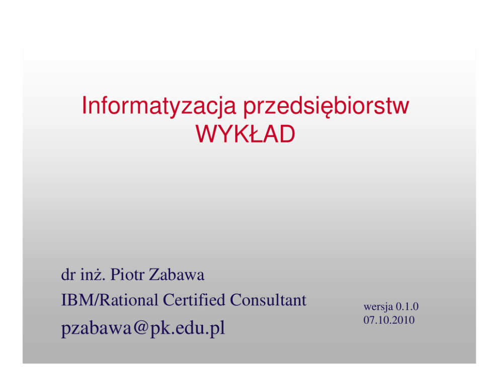 Informatyzacja przedsiębiorstw WYKŁAD dr inż. Piotr Zabawa IBM/Rational Certified Consultant [email protected] wersja 0.1.0 07.10.2010 Wykład 3 Modelowanie procesów biznesowych z wykorzystaniem BPMN w środowisku Jboss Drools Przykłady reguł biznesowych Zostaną tutaj zaprezentowane niewielkie, ale za to posiadające namacalną postać (działające oprogramowanie), przykłady prostych reguł biznesowych o różnych zastosowaniach: • Walidacja danych • Transformacja danych • Monitorowanie danych – uzupełnić i dodać eventy Na tle tych przykładów zaprezentowany zostanie podstawowy sposób pracy nad developmentem reguł biznesowych polegający na ich unit-testowaniu. Przykład reguł biznesowych Kontekst biznesowy zostanie dokładniej opisany przy każdej regule. Tutaj podany zostanie fragment analitycznego dziedzinowego modelu (Domain-Specific Model) biznesowego dla bankowości. Źródło przykładów Przykłady te zostały zaczerpnięte z literatury: • Bali M., Drools JBoss Rules 5.0. Developers Guide, Packt Publishing 2009. • Kod źródłowy przykładów dostępny jest ze strony wydawnictwa: https://www.packtpub.com/support?nid=4009 • Aktualna wersja przykładu znajdująca się pod kontrolą wersji dostępna jest spod: uzupełnić !!! Jest to rozwiązanie tymczasowe – znacznie uproszczony przykład zostanie udostępniony wkrótce. Język reguł biznesowych - walidacja Reguły tej kategorii mogą służyć do weryfikacji poprawności, spójności lub kompletności danych wymaganych na danym etapie procesu biznesowego. Przykładem takich reguł jest walidacja danych klienta zgłaszającego przez aplikację internetową podanie o założenie rachunku bankowego. Aby klient został zapisany w bazie danych systemu bankowego musi np. określić swoje dane kontaktowe (adres e-mail). Jednak nie musi od razu podawać swoich wszystkich danych – może je uzupełnić w czasie kolejnej sesji z systemem bankowym. Powinien zostać powiadomiony od razu o konieczności uzupełnienia tych danych. Język reguł biznesowych - walidacja • Wymagane jest podanie adresu przez nowego klienta – w przeciwnym razie ostrzeżenie rule „addressRequired” when Customer ( address == null ) then warning(kcontext); end Język reguł biznesowych - walidacja • Wymagane jest podanie adresu przez nowego klienta – w przeciwnym razie błąd rule „studentAccountCustomerAgeLessThan” when Customer ( eval (yearsPassedSince(dateOfBirth) >= 27) ) $account : Account ( type == Account.Type.STUDENT) then error(kcontext, $account); end Język reguł biznesowych - walidacja Implementacja i testy JUnit4 w projektach Drools Eclipse. ValidationSample Język reguł biznesowych transformacja Reguły takie mogą zostać wykorzystane do konwersji danych pomiędzy dwoma systemami korporacyjnymi, np. bankowymi. Może to być konwersja związana z przenoszeniem danych ze starego systemu do nowego. Dzięki zastosowaniu reguł biznesowych możemy się skupić na tym co a nie jak należy konwertować. Unikamy konieczności sięgania do wewnętrznych struktur baz danych (dla różnych wersji systemu te struktury mogą się znacząco różnić). Jest to możliwe dzięki korzystaniu tylko z interfejsów programowych (API) wspomnianych systemów. Reguły można zastosować do konwersji tak uzyskanych danych towarzyszącej ich przenoszeniu. Język reguł biznesowych transformacja Przykładem takiej sytuacji jest wymóg aby przejściu ze starego systemu do nowego towarzyszyła zamiana wielu kont każdego z klientów na jedno konto, na którym docelowo można otwierać wiele rachunków. Zastosowanie reguł biznesowych nie jest zapewne najefektywniejszym z możliwych podejść. Jednak ze względu na łatwość jego realizacji może się okazać konkurencyjne w stosunku do efektywnego (ale tylko w czasie wykonania – pomijalnym w stosunku do czasu implementacji) podejścia polegającego na pisaniu skomplikowanych zapytań SQL do baz danych o różnych strukturach z jednoczesną konwersją i skomplikowanym przeliczaniem danych. Język reguł biznesowych transformacja • Wymagana jest redukcja wielu rachunków klienta do jednego rachunku rule „reduceLegacyAccounts” when $accountMap1 : Map( this[„_type_”] == „Account” ) $accountMap2 : Map( this[„_type_”] == „Account”, eval ( $accountMap1 != $accountMap2), this[„customer_id”] == $accountMap1[„customer_id”], this[„currency”] == $accountMap1[„currency”] ) then modify($accountMap1){ put(„balance”, ( (BigDecimal)$accountMap1.get(„balance”)).add( (BigDecimal)$accountMap2.get(„balance”)) ) } retract( $accountMap2 ); end Język reguł biznesowych transformacja Implementacja i testy JUnit4 w projektach Drools Eclipse. TransformationSample