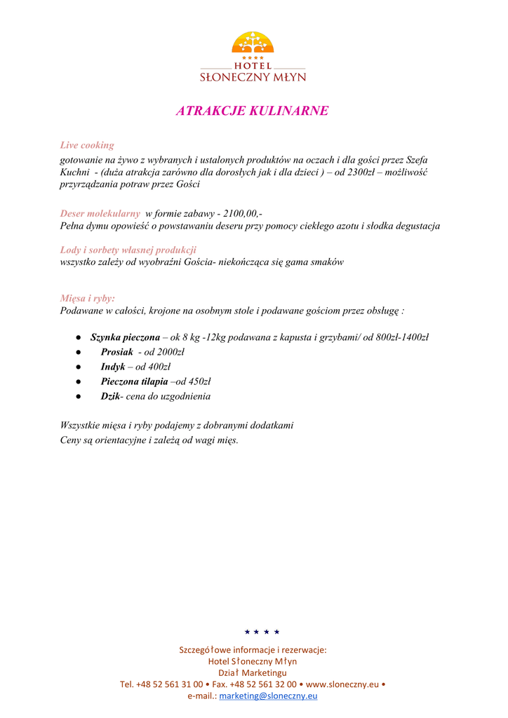 ATRAKCJE KULINARNE Live cooking gotowanie na żywo z wybranych i ustalonych produktów na oczach i dla gości przez Szefa Kuchni (duża atrakcja zarówno dla dorosłych jak i dla dzieci ) – od 2300zł – możliwość przyrządzania potraw przez Gości Deser molekularny w formie zabawy 2100,00, Pełna dymu opowieść o powstawaniu deseru przy pomocy ciekłego azotu i słodka degustacja Lody i sorbety własnej produkcji wszystko zależy od wyobraźni Gościa niekończąca się gama smaków Mięsa i ryby: Podawane w całości, krojone na osobnym stole i podawane gościom przez obsługę : ● Szynka pieczona – ok 8 kg 12kg podawana z kapusta i grzybami/ od 800zł1400zł ● Prosiak od 2000zł ● Indyk – od 400zł ● Pieczona tilapia –od 450zł ● Dzik cena do uzgodnienia Wszystkie mięsa i ryby podajemy z dobranymi dodatkami Ceny są orientacyjne i zależą od wagi mięs. Szczegółowe informacje i rezerwacje: Hotel Słoneczny Młyn Dział Marketingu Tel. +48 52 561 31 00 • Fax. +48 52 561 32 00 • www.sloneczny.eu • e-mail.: [email protected]