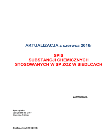 AKTUALIZACJA z czerwca 2016r SPIS SUBSTANCJI CHEMICZNYCH STOSOWANYCH W SP ZOZ W SIEDLCACH ZATWIERDZIŁ Sporządziła: Specjalista ds. BHP Bogumiła Filipiuk Siedlce, dnia 02.06.2016r SPIS SUBSTANCJI CHEMICZNYCH STOSOWANYCH w ODDZIAŁACH SZPITALNYCH, PRZYCHODNIACH i PORADNIACH SPECJALISTYCZNYCH - przetarg listopad 2015r + aktualizacja z uwzględnieniem nowych kart charakterystyki z 2016r Lp. Nazwa środka chemicznego 1. MANUSAN – XI – produkt drażniący, N – produkt niebezpieczny dla środowiska producent Polfa Łódź 2. ACTICHLOR PLUS – Xi produkt drażniący, O- produkt utleniający, N - produkt niebezpieczny dla środowiska – preparat do dezynfekcji powierzchni producent Ecolab Kraków 3. BRIAL TOP – produkt nie jest sklasyfikowany jako niebezpieczny – preparat do czyszczenia powierzchni producent Ecolab Kraków Działanie na organizm człowieka, Środki ochrony hasło ostrzegawcze, piktogram zagrożenia odzież robocza, H318 Powoduje poważne okulary ochronne, uszkodzenie oczu H400 Działa bardzo toksycznie na rękawice ochronne organizmy wodne Hasło ostrzegawcze: NIEBEZPIECZEŃSTWO H315 Działa drażniąco na skórę. odzież robocza, H318 Powoduje poważne okulary ochronne rękawice ochronne, uszkodzenie oczu. H334 Może powodować objawy alergii lub astmy lub trudności w oddychaniu w następstwie wdychania. H335 Może powodować podrażnienie dróg oddechowych. H410 Działa bardzo toksycznie na organizmy wodne, powodując długotrwałe skutki. Uzupełniające zwroty wskazujące rodzaj zagrożenia: EUH031 W kontakcie z kwasami uwalnia toksyczne gazy Hasło ostrzegawcze: NIEBEZPIECZEŃSTWO może powodować podrażnienia skóry i oczu w przypadku bezpośredniego kontaktu odzież robocza rękawice ochronne 4. INDUR TOP – produkt nie jest sklasyfikowany jako niebezpieczny – preparat czyszczący do podłóg producent Ecolab Kraków 5. NEODISHER MediClean – produkt nie jest klasyfikowany jako niebezpieczny – płynny środek myjący, wyrób medyczny dystrybutor Dr. Weigert Polska Sp. z o.o. Warszawa 6. NEODISHER Septo DN – produkt szkodliwy Xn – R-20/22, R37/38, R41, R 432/43 płynny środek dezynfekcyjny dystrybutor Dr. Weigert Polska Sp. z o.o. Warszawa 7. NEODISHER MediClean forte – produkt nie jest klasyfikowany jako niebezpieczny – płynny środek myjący dystrybutor Dr. Weigert Polska Sp. z o.o. Warszawa 8. MELISEPTOL Foam Pure/Fresh środek dezynfekujący do powierzchni może powodować wystąpienie reakcji alergicznej odzież robocza, rękawice ochronne brak określeń niebezpieczeństwa, przestrzegać ogólnych zasad bhp, podczas pracy nie jeść, nie pić, nie palić. Unikać zanieczyszczenia oczu i skóry odzież robocza, rękawice ochronne, okulary ochronne w przypadku ryzyka zanieczyszczenia oczu H315- działa drażniąco na skórę H317 – może powodować reakcję alergiczną skóry, H318 – powoduje poważne uszkodzenie oczu, H332 – działa szkodliwie w następstwie wdychania, H334 –może powodować objawy alergii lub astmy lub trudności w oddychaniu w następstwie wdychania, H335 – może powodować podrażnienie dróg oddechowych, H341 –podejrzewa się, że powoduje wady genetyczne Hasło ostrzegawcze: NIEBEZPIECZEŃSTWO odzież robocza, rękawice ochronne, okulary ochronne brak określeń niebezpieczeństwa, przestrzegać ogólnych zasad bhp, podczas pracy nie jeść, nie pić, nie palić. Unikać zanieczyszczenia oczu i skóry odzież robocza, rękawice ochronne, okulary ochronne w przypadku ryzyka zanieczyszczenia oczu H226 – łatwopalna ciecz i pary, H318 - powoduje poważne uszkodzenie oczu, H336 - może wywoływać uczucie dostawca: AESCULAP CHIFA Sp. z senności lub zawroty głowy o.o. Nowy Tomyśl Hasło ostrzegawcze: NIEBEZPIECZEŃSTWO odzież robocza, rękawice ochronne, okulary ochronne 9. MELISEPTOL wyrób medyczny, preparat do szybkiej dezynfekcji małych powierzchni H226 - łatwopalna ciecz i pary Hasło ostrzegawcze: UWAGA odzież robocza, rękawice ochronne, okulary ochronne dostawca: AESCULAP CHIFA Sp. z o.o. Nowy Tomyśl 10. MELISEPTOL Wipes Sensitive środek dezynfekujący do małych powierzchni H226 - łatwopalna ciecz i pary H318 - powoduje poważne uszkodzenie oczu, H336 - może wywoływać uczucie dostawca: AESCULAP CHIFA Sp. z senności lub zawroty głowy o.o. Nowy Tomyśl Hasło ostrzegawcze: NIEBEZPIECZEŃSTWO odzież robocza, rękawice ochronne, należy unikać zanieczyszczenia skóry rąk i oczu 11. MIKROZID PAA wipes chusteczki H315 Działa drażniąco na skórę. - produkty stosowane jako środki H319 Działa drażniąco na oczy. dezynfekcyjne i biocydy Hasło ostrzegawcze: UWAGA odzież robocza, należy unikać zanieczyszczenia oczu producent Schulke Polska Sp. z o.o. Warszawa 12. OCTENISEPT® preparat nie podlega klasyfikacji jako niebezpieczny dla zdrowia i środowiska – produkt leczniczy preparat do dezynfekcji ran, błon śluzowych i skóry odzież robocza, może powodować podrażnienia oczu w przypadku bezpośredniego należy unikać kontaktu z oczami kontaktu producent Schulke Polska Sp. z o.o. Warszawa 13. PROMANUM Pure - produkt wysoce łatwo palny, preparat do higienicznej i chirurgicznej dezynfekcji rąk dostawca: AESCULAP CHIFA Sp. z o.o. Nowy Tomyśl H225 - wysoce łatwopalna ciecz i pary, H319 - działa drażniąco na oczy Hasło ostrzegawcze: NIEBEZPIECZEŃSTWO odzież robocza, należy unikać kontaktu z oczami 14. PRONTODERM Foam - preparat do dekontaminacji MDRO (Organizm z Odpornością Wielolekową) i mycia pacjenta przed zabiegami chirurgicznymi. Jako wyrób medyczny nie podlega wymogom dotyczącym oznakowania opakowań Przy bezpośrednim dostaniu się produktu do oczu może wystąpić lekkie podrażnienie, zaczerwienienie, łzawienie, pieczenie, ból spojówek. Zawiera monohydrochlorek polimeru składnik, sklasyfikowany jako uczulający, który w niektórych dostawca: AESCULAP CHIFA Sp. z przypadkach (u ludzi szczególnie o.o. Nowy Tomyśl wrażliwych) może powodować wyst