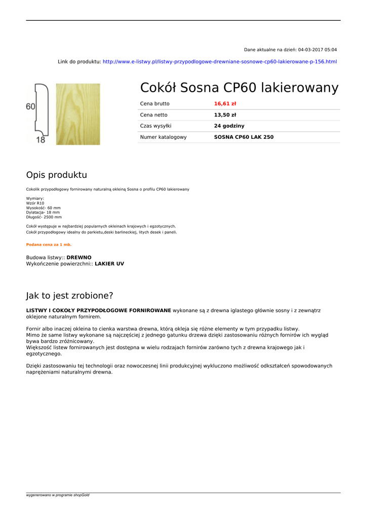 Dane aktualne na dzień: 04-03-2017 05:04 Link do produktu: http://www.e-listwy.pl/listwy-przypodlogowe-drewniane-sosnowe-cp60-lakierowane-p-156.html Cokół Sosna CP60 lakierowany Cena brutto 16,61 zł Cena netto 13,50 zł Czas wysyłki 24 godziny Numer katalogowy SOSNA CP60 LAK 250 Opis produktu Cokolik przypodłogowy fornirowany naturalną okleiną Sosna o profilu CP60 lakierowany Wymiary: Wzór R10 Wysokość- 60 mm Dylatacja- 18 mm Długość- 2500 mm Cokół występuje w najbardziej popularnych okleinach krajowych i egzotycznych. Cokół przypodłogowy idealny do parkietu,deski barlineckiej, litych desek i paneli. Podana cena za 1 mb. Budowa listwy:: DREWNO Wykończenie powierzchni:: LAKIER UV Jak to jest zrobione? LISTWY I COKOŁY PRZYPODŁOGOWE FORNIROWANE wykonane są z drewna iglastego głównie sosny i z zewnątrz oklejone naturalnym fornirem. Fornir albo inaczej okleina to cienka warstwa drewna, którą okleja się różne elementy w tym przypadku listwy. Mimo że same listwy wykonane są najczęściej z jednego gatunku drzewa dzięki zastosowaniu różnych fornirów ich wygląd bywa bardzo zróżnicowany. Większość listew fornirowanych jest dostępna w wielu rodzajach fornirów zarówno tych z drewna krajowego jak i egzotycznego. Dzięki zastosowaniu tej technologii oraz nowoczesnej linii produkcyjnej wykluczono możliwość odkształceń spowodowanych naprężeniami naturalnymi drewna. wygenerowano w programie shopGold Profil listwy wykończeniowej wykonany jest w ten sposób, że po jej zamocowaniu do podłoża uzyskujemy estetyczne wykończenie każdej podłogi (parkiet, panele, deski podłogowe itp.) oraz umożliwia przeprowadzenie różnego rodzaju instalacji (okablowania). Listwy mogą występować jako surowe, czyli takie które wymagają dodatkowego wykończenia (bejcowania, olejowania czy lakierowania), oraz lakierowane. Listwy lakierowane wykańczane są w standardzie bezbarwnym lakierem utwardzanym UV na nowoczesnej linii lakierniczej. Montaż Montaż listwy przypodłogowe. Listwy i cokoły montuje się poprzez przyklejenie do ściany za pomocą kleju montażowego np: Soudal 100a Wszystkie narożniki wewnętrzne oraz zewnętrzne docina się pod kątem, najlepiej wykorzystać do tego celu elektryczną piłę kątową z piłą o jak największej liczbie zębów. Listwy montujemy prosto nie dociskamy jeśli ściany są krzywe, ewentualne szczeliny między listwą a ścianą wypełniamy Akrylem biały , który można pomalować pod kolor ściany jeśli ściany nie są białe. Łączenia listew możemy wypełnić specjalnym kitem dobranym kolorystycznie pod kolor listwy. wygenerowano w programie shopGold Powered by TCPDF (www.tcpdf.org)