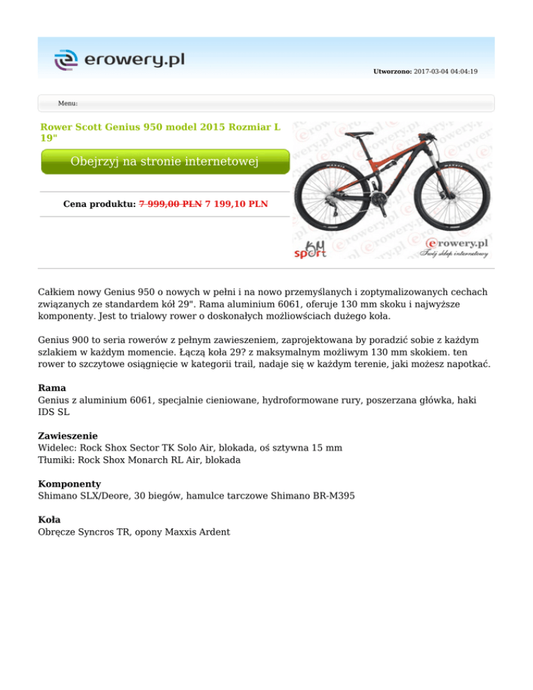 Utworzono: 2017-03-04 04:04:19 Menu: Rower Scott Genius 950 model 2015 Rozmiar L 19" Obejrzyj na stronie internetowej Cena produktu: 7 999,00 PLN 7 199,10 PLN Całkiem nowy Genius 950 o nowych w pełni i na nowo przemyślanych i zoptymalizowanych cechach związanych ze standardem kół 29". Rama aluminium 6061, oferuje 130 mm skoku i najwyższe komponenty. Jest to trialowy rower o doskonałych możliowściach dużego koła. Genius 900 to seria rowerów z pełnym zawieszeniem, zaprojektowana by poradzić sobie z każdym szlakiem w każdym momencie. Łączą koła 29? z maksymalnym możliwym 130 mm skokiem. ten rower to szczytowe osiągnięcie w kategorii trail, nadaje się w każdym terenie, jaki możesz napotkać. Rama Genius z aluminium 6061, specjalnie cieniowane, hydroformowane rury, poszerzana główka, haki IDS SL Zawieszenie Widelec: Rock Shox Sector TK Solo Air, blokada, oś sztywna 15 mm Tłumiki: Rock Shox Monarch RL Air, blokada Komponenty Shimano SLX/Deore, 30 biegów, hamulce tarczowe Shimano BR-M395 Koła Obręcze Syncros TR, opony Maxxis Ardent Rozmiary ram - Klamki hamulców Shimano BL-M396 Disc Hamulce Shimano BR-M615 Disc 180/F and 180/R mm SM-RT64 CL Rotor Mechanizm korbowy Oś korbowodu Prowadzenie łańcucha Shimano FC-M622 2-piece Design 40Ax30Ax22T Shimano SM-BB71-41A / shell 41x92mm - Kierownica Syncros FL2.0 Tbar Alloy 6061 D.B. / T shape Flat / 9° / 720mm Mostek/ Wspornik kierownicy Syncros FL2.0 6061 Alloy / oversize 31.8mm 1 1/8" / -6° Pedały - Sztyca Syncros FL2.5 / 31.6mm Siodło Syncros MTB Trail Przeznaczenie Piasta przód Męski Formula CL71 / 15mm Piasta tył Shimano FH-M4050 Disc CL 135 × 5mm / DT RWS QR Łańcuch KMC X10 Kaseta/ wolnobieg Shimano CS-HG50-10 11-36 T Szprychy Stainless Black 15G / 1.8mm Obręcze Syncros TR / Eyelets / 32H TR69 Opony Maxxis Ardent / 2.25 60TPI Kevlar Bead Wyposażenie dodatkowe Typ roweru Górski Waga 13,7kg Tylny amortyzator /Damper Rozmiar kół Sezon Rodzina Rock Shox Monarch RL Air / HVI Lockout / reb. Adj. 29" 2015 - Rama Genius Alloy 6061 custom butted Hydroformed tubes / tapered Headtube BB92 / IDS SL dropout for 135 × 5mm U-Mono Link / rear 180PM BB height adj. Widelec/amortyzator Rock Shox Sector TK Solo Air 15mm QR axle / Tapered steerer Lockout / reb. Adj. Stery Syncros / VP-A41AC1 / 1.5" 1 1/8" semi integ. OD 50/61mm / ID 44/55mm Przerzutka przód Shimano Deore FD-M610-E / DM Przerzutka tył Shimano SLX RD-M670 SGS Shadow Type / 30 Speed Manetki Shimano Deore SL-M610-I Rapidfire Plus / 2 way release Mimo dołożenia wszelkich starań nie gwarantujemy, że publikowane opisy i specyfikacje techniczne niezawierają uchybień lub błędów, które nie mogą jednak być podstawą do roszczeń. W przypadku jakichkolwiek wątpliwości, przed podjęciem decyzji prosimy o kontakt. Adres: www.erowery.pl Telefon: 605 515 185, 34 361 16 71 Email: [email protected]