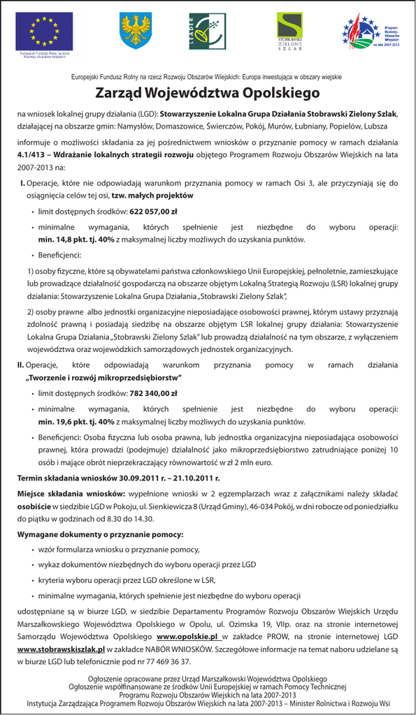 Europejski Fundusz Rolny na rzecz Rozwoju Obszarów Wiejskich: Europa inwestująca w obszary wiejskie Zarząd Województwa Opolskiego na wniosek lokalnej grupy działania (LGD): Stowarzyszenie Lokalna Grupa Działania Stobrawski Zielony Szlak, działającej na obszarze gmin: Namysłów, Domaszowice, Świerczów, Pokój, Murów, Łubniany, Popielów, Lubsza informuje o możliwości składania za jej pośrednictwem wniosków o przyznanie pomocy w ramach działania 4.1/413 – Wdrażanie lokalnych strategii rozwoju objętego Programem Rozwoju Obszarów Wiejskich na lata 2007-2013 na: I. O peracje, które nie odpowiadają warunkom przyznania pomocy w ramach Osi 3, ale przyczyniają się do osiągnięcia celów tej osi, tzw. małych projektów • limit dostępnych środków: 622 057,00 zł • minimalne wymagania, których spełnienie jest niezbędne do wyboru operacji: min. 14,8 pkt. tj. 40% z maksymalnej liczby możliwych do uzyskania punktów. • Beneficjenci: 1) osoby fizyczne, które są obywatelami państwa członkowskiego Unii Europejskiej, pełnoletnie, zamieszkujące lub prowadzące działalność gospodarczą na obszarze objętym Lokalną Strategią Rozwoju (LSR) lokalnej grupy działania: Stowarzyszenie Lokalna Grupa Działania „Stobrawski Zielony Szlak”, 2) osoby prawne albo jednostki organizacyjne nieposiadające osobowości prawnej, którym ustawy przyznają zdolność prawną i posiadają siedzibę na obszarze objętym LSR lokalnej grupy działania: Stowarzyszenie Lokalna Grupa Działania „Stobrawski Zielony Szlak” lub prowadzą działalność na tym obszarze, z wyłączeniem województwa oraz wojewódzkich samorządowych jednostek organizacyjnych. II. O peracje, które odpowiadają warunkom przyznania pomocy w ramach działania niezbędne do wyboru operacji: „Tworzenie i rozwój mikroprzedsiębiorstw” • limit dostępnych środków: 782 340,00 zł • minimalne wymagania, których spełnienie jest min. 19,6 pkt. tj. 40% z maksymalnej liczby możliwych do uzyskania punktów. • Beneficjenci: Osoba fizyczna lub osoba prawna, lub jednostka organizacyjna nieposiadająca osobowości prawnej, która prowadzi (podejmuje) działalność jako mikroprzedsiębiorstwo zatrudniające poniżej 10 osób i mające obrót nieprzekraczający równowartość w zł 2 mln euro. Termin składania wniosków 30.09.2011 r. – 21.10.2011 r. Miejsce składania wniosków: wypełnione wnioski w 2 egzemplarzach wraz z załącznikami należy składać osobiście w siedzibie LGD w Pokoju, ul. Sienkiewicza 8 (Urząd Gminy), 46-034 Pokój, w dni robocze od poniedziałku do piątku w godzinach od 8.30 do 14.30. Wymagane dokumenty o przyznanie pomocy: • wzór formularza wniosku o przyznanie pomocy, • wykaz dokumentów niezbędnych do wyboru operacji przez LGD • kryteria wyboru operacji przez LGD określone w LSR, • minimalne wymagania, których spełnienie jest niezbędne do wyboru operacji udostępniane są w biurze LGD, w siedzibie Departamentu Programów Rozwoju Obszarów Wiejskich Urzędu Marszałkowskiego Województwa Opolskiego w Opolu, ul. Ozimska 19, VIIp. oraz na stronie internetowej Samorządu Województwa Opolskiego www.opolskie.pl w zakładce PROW, na stronie internetowej LGD www.stobrawskiszlak.pl w zakładce NABÓR WNIOSKÓW. Szczegółowe informacje na temat naboru udzielane są w biurze LGD lub telefonicznie pod nr 77 469 36 37. Ogłoszenie opracowane przez Urząd Marszałkowski Województwa Opolskiego Ogłoszenie współfinansowane ze środków Unii Europejskiej w ramach Pomocy Technicznej Programu Rozwoju Obszarów Wiejskich na lata 2007-2013 Instytucja Zarządzająca Programem Rozwoju Obszarów Wiejskich na lata 2007-2013 – Minister Rolnictwa i Rozwoju Wsi