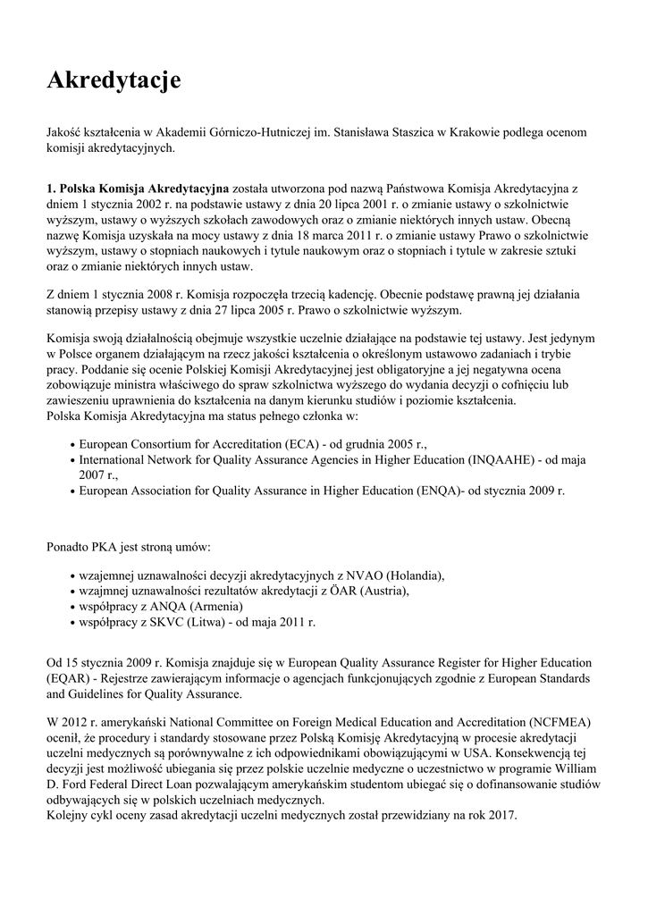 Akredytacje Jakość kształcenia w Akademii Górniczo-Hutniczej im. Stanisława Staszica w Krakowie podlega ocenom komisji akredytacyjnych. 1. Polska Komisja Akredytacyjna została utworzona pod nazwą Państwowa Komisja Akredytacyjna z dniem 1 stycznia 2002 r. na podstawie ustawy z dnia 20 lipca 2001 r. o zmianie ustawy o szkolnictwie wyższym, ustawy o wyższych szkołach zawodowych oraz o zmianie niektórych innych ustaw. Obecną nazwę Komisja uzyskała na mocy ustawy z dnia 18 marca 2011 r. o zmianie ustawy Prawo o szkolnictwie wyższym, ustawy o stopniach naukowych i tytule naukowym oraz o stopniach i tytule w zakresie sztuki oraz o zmianie niektórych innych ustaw. Z dniem 1 stycznia 2008 r. Komisja rozpoczęła trzecią kadencję. Obecnie podstawę prawną jej działania stanowią przepisy ustawy z dnia 27 lipca 2005 r. Prawo o szkolnictwie wyższym. Komisja swoją działalnością obejmuje wszystkie uczelnie działające na podstawie tej ustawy. Jest jedynym w Polsce organem działającym na rzecz jakości kształcenia o określonym ustawowo zadaniach i trybie pracy. Poddanie się ocenie Polskiej Komisji Akredytacyjnej jest obligatoryjne a jej negatywna ocena zobowiązuje ministra właściwego do spraw szkolnictwa wyższego do wydania decyzji o cofnięciu lub zawieszeniu uprawnienia do kształcenia na danym kierunku studiów i poziomie kształcenia. Polska Komisja Akredytacyjna ma status pełnego członka w: European Consortium for Accreditation (ECA) - od grudnia 2005 r., International Network for Quality Assurance Agencies in Higher Education (INQAAHE) - od maja 2007 r., European Association for Quality Assurance in Higher Education (ENQA)- od stycznia 2009 r. Ponadto PKA jest stroną umów: wzajemnej uznawalności decyzji akredytacyjnych z NVAO (Holandia), wzajmnej uznawalności rezultatów akredytacji z ÖAR (Austria), współpracy z ANQA (Armenia) współpracy z SKVC (Litwa) - od maja 2011 r. Od 15 stycznia 2009 r. Komisja znajduje się w European Quality Assurance Register for Higher Education (EQAR) - Rejestrze zawierającym informacje o agencjach funkcjonujących zgodnie z European Standards and Guidelines for Quality Assurance. W 2012 r. amerykański National Committee on Foreign Medical Education and Accreditation (NCFMEA) ocenił, że procedury i standardy stosowane przez Polską Komisję Akredytacyjną w procesie akredytacji uczelni medycznych są porównywalne z ich odpowiednikami obowiązującymi w USA. Konsekwencją tej decyzji jest możliwość ubiegania się przez polskie uczelnie medyczne o uczestnictwo w programie William D. Ford Federal Direct Loan pozwalającym amerykańskim studentom ubiegać się o dofinansowanie studiów odbywających się w polskich uczelniach medycznych. Kolejny cykl oceny zasad akredytacji uczelni medycznych został przewidziany na rok 2017. Szczegółowe informacje na stronie Polskiej Komisji Akredytacyjnej Oprócz PKA działają branżowe (środowiskowe) komisje akredytacyjne m.in.: Komisja Akredytacyjna Uczelni Technicznych oraz Uniwersytecka Komisja Akredytacyjna. 2. Komisja Akredytacyjna Uczelni Technicznych (KAUT) została powołana przez Konferencję Rektorów Polskich Uczelni Technicznych 17 lutego 2001 roku w Opolu, jako agenda akredytacyjna, do dokonywania akredytacji kierunków wyższych uczelni technicznych. Na podstawie informacji zebranych w procesie akredytacji KAUT podejmuje decyzję o: udzieleniu akredytacji na dwa albo na pięć lat odroczeniu akredytacji do czasu spełnienia określonych warunków odmowie akredytacji. Kierunki, które uzyskały akredytację są honorowane certyfikatem KAUT. Szczegółowe informacje na stronie Komisji Akredytacyjnej Uczelni Technicznych 3. Uniwersytecka Komisja Akredytacyjna (UKA) powołana została w styczniu 1998 roku na Konferencji Rektorów Uniwersytetów Polskich w celu czuwania nad jakością kształcenia, przede wszystkim na kierunkach uniwersyteckich. O akredytacji UKA świadczy przyznanie Certyfikatu Wysokiej Jakości Kształcenia, na okres dwóch lub pięciu lat, po którym ponownie przeprowadzana jest ocena jakości kształcenia. Dotychczas wydano prawie 300 certyfikatów dla 40 kierunków studiów w uczelniach całej Polski. Szczegółowe informacje na stronie Uniwersyteckiej Komisji Akredytacyjnej 4. European Network for Accreditation of Engineering Education (ENAEE) to sieć zrzeszająca europejskie ośrodki zajmujące się kształceniem inżynierów. Jednym z działań ENAEE jest program akredytacji EUR-ACE® (European Accredited Engineer) nadający najlepszym programom kształcenia certyfikat potwierdzający ich wysoki poziom kształcenia, a także zgodność z przyjętymi w Europie normami i zasadami edukacji inżynierskiej. Znak EUR-ACE® jest rozpoznawalny we wszystkich krajach europejskich, ponieważ oparty jest o spójne ramy standardów mierzących efektywność programów studiów technicznych. Standardy Ramowe EUR-ACE® (EAFS) określają cele programów inżynierskich, tj. wiedzę, umiejętności i kompetencje społeczne, jakich wymaga się od absolwentów z tytułem inżyniera i magistra inżyniera. Znak EUR-ACE® odrębnie stosuje się do każdego z tych stopni studiów - EUR-ACE® Bachelors i EUR-ACE® Masters. Standardy EAFS uwzględniają różnorodność programów inżynierskich, które są niezbędne w procesie przygotowywania studentów do pracy w przemyśle europejskim. Ze względu na sposób w jaki są one zbudowane, promują innowacyjne metody nauczania, a także zachęcają do promocji dobrych praktyk. Mogą również obejmować rozwój nowych dziedzin techniki. Ważną częścią roli ENAEE jest nieustanne dbanie o to, żeby znak EUR-ACE® uwzględniał nie tylko poglądy i punkt widzenia przemysłu i instytucji szkolnictwa wyższego, ale również odpowiednie zmiany w technologii inżynieryjnej. Tak więc ENAEE promuje edukację inżynierską, a znak EUR-ACE® gwarantuje jej jakość. Wyróżnienie to przyznawane jest przy współpracy z KAUT 