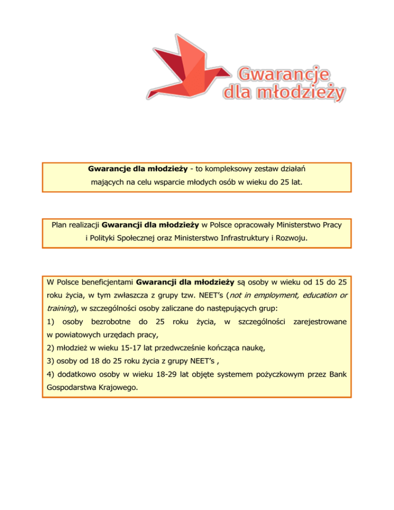 Gwarancje dla młodzieży - to kompleksowy zestaw działań mających na celu wsparcie młodych osób w wieku do 25 lat. Plan realizacji Gwarancji dla młodzieży w Polsce opracowały Ministerstwo Pracy i Polityki Społecznej oraz Ministerstwo Infrastruktury i Rozwoju. W Polsce beneficjentami Gwarancji dla młodzieży są osoby w wieku od 15 do 25 roku życia, w tym zwłaszcza z grupy tzw. NEET’s (not in employment, education or training), w szczególności osoby zaliczane do następujących grup: 1) osoby bezrobotne do 25 roku życia, w szczególności zarejestrowane w powiatowych urzędach pracy, 2) młodzież w wieku 15-17 lat przedwcześnie kończąca naukę, 3) osoby od 18 do 25 roku życia z grupy NEET’s , 4) dodatkowo osoby w wieku 18-29 lat objęte systemem pożyczkowym przez Bank Gospodarstwa Krajowego. Przykładowe instrumenty wsparcia w ramach Gwarancji dla młodzieży szkolenia staże dofinansowanie studiów podyplomowych przygotowanie zawodowe dofinansowanie kosztów egzaminów stypendium na kontynuowanie nauki bony szkoleniowe, stażowe, zatrudnieniowe i na zasiedlenie Realizatorzy Gwarancji dla młodzieży szczebel centralny Ministerstwo Pracy i Polityki Społecznej (MPiPS) Ministerstwo Infrastruktury i Rozwoju (MIiR) Komenda Główna Ochotniczych Hufców Pracy (KG OHP) Bank Gospodarstwa Krajowego (BGK) Adres głównej strony internetowej Programu gdm.praca.gov.pl szczebel regionalny/lokalny Wojewódzkie Urzędy Pracy (WUP) Powiatowe Urzędy Pracy (PUP) struktury organizacyjne Ochotniczych Hufców Pracy (OHP) Bank Gospodarstwa Krajowego (BGK) za pośrednictwem pośrednika finansowego partnerzy rynku pracy, w tym partnerzy społeczni, agencje zatrudnienia, organizacje pozarządowe, podmioty ekonomii społecznej, instytucje szkoleniowe, instytucje dialogu społecznego, gminy i pracodawcy wyłonieni do realizacji Gwarancji dla młodzieży Gwarancje dla młodzieży są realizowane zarówno ze środków krajowych, jak również przy udziale środków pochodzących z budżetu Unii Europejskiej w ramach Europejskiego Funduszu Społecznego oraz Inicjatywy na rzecz zatrudnienia ludzi młodych. Szansa dla młodych na wielkopolskim rynku pracy Gwarancje dla młodzieży to program ułatwiający start. Ta nowa inicjatywa na rzecz zwalczania bezrobocia realizowana jest m.in. w ramach Programu Operacyjnego Wiedza Edukacja Rozwój 2014-2020. Powiatowe Urzędy Pracy z terenu województwa wielkopolskiego przystąpiły do Osi priorytetowej I Osoby młode na rynku pracy PO WER, Działania 1.1 Wsparcie osób młodych pozostających bez pracy na regionalnym rynku pracy – projekty pozakonkursowe, Poddziałania 1.1.1 Wsparcie udzielane z Europejskiego Funduszu Społecznego. Wykaz powiatów oraz informacje o projektach dostępne są na stronie WUP w Poznaniu. Zapraszamy http://www.efs.wup.poznan.pl/aktualnosci Wojewódzki Urząd Pracy w Poznaniu zlecił opracowanie przygotowujące do organizacji konkursów regionalnych, których celem będzie aktywizacja młodzieży na rynku pracy w ramach Planu realizacji GdM w Polsce. Raport Diagnoza zjawiska wykluczenia społecznego i zawodowego osób młodych w województwie wielkopolskim dostępny jest na stronie WUP w Poznaniu http://wuppoznan.praca.gov.pl/rynek-pracy/publikacje urzedu/opracowania i analizy Wojewódzki Urząd Pracy w Poznaniu informuje, że Bank Gospodarstwa Krajowego (BGK) jest operatorem rządowego programu na rzecz rozwoju przedsiębiorczości i tworzenia warunków dla powstania nowych miejsc pracy „Wsparcie w starcie”. Program skierowany jest do: – absolwentów szkół i uczelni wyższych do 4 lat od dnia ukończenia szkoły lub uzyskania tytułu zawodowego, – studentów ostatniego roku studiów wyższych (studiów I i II stopnia, jednolitych studiów magisterskich), –zarejestrowanych bezrobotnych. Szczegółowe informacje na stronie internetowej Resortu Pracy www.mpips.gov.pl/wsparciewstarcie Powiatowe Urzędy Pracy województwa wielkopolskiego aktywizują młodzież stosując ustawowe instrumenty rynku pracy wspierane środkami z rezerwy Funduszu Pracy w ramach programów dedykowanych tej grupie odbiorców. Szczegółowe informacje na stronie WUP w Poznaniu http://wuppoznan.praca.gov.pl/rynek-pracy/programy-aktywizacyjne-i-projekty