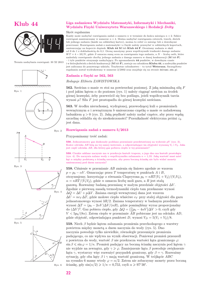 Klub 44 Liga zadaniowa Wydziału Matematyki, Informatyki i Mechaniki, Wydziału Fizyki Uniwersytetu Warszawskiego i Redakcji Delty Skrót regulaminu Termin nadsyłania rozwiązań: 30 XI 2013 Każdy może nadsyłać rozwiązania zadań z numeru n w terminie do końca miesiąca n + 2. Szkice rozwiązań zamieszczamy w numerze n + 4. Można nadsyłać rozwiązania czterech, trzech, dwóch lub jednego zadania (każde na oddzielnej kartce), można to robić co miesiąc lub z dowolnymi przerwami. Rozwiązania zadań z matematyki i z fizyki należy przesyłać w oddzielnych kopertach, umieszczając na kopercie dopisek: Klub 44 M lub Klub 44 F. Oceniamy zadania w skali od 0 do 1 z dokładnością do 0,1. Ocenę mnożymy przez współczynnik trudności danego zadania: W T = 4 − 3S/N , gdzie S oznacza sumę ocen za rozwiązania tego zadania, a N – liczbę osób, które nadesłały rozwiązanie choćby jednego zadania z danego numeru w danej konkurencji (M lub F) – i tyle punktów otrzymuje nadsyłający. Po zgromadzeniu 44 punktów, w dowolnym czasie i w którejkolwiek z dwóch konkurencji (M lub F), zostaje on członkiem Klubu 44, a nadwyżka punktów jest zaliczana do ponownego udziału. Trzykrotne członkostwo – to tytuł Weterana. Szczegółowy regulamin został wydrukowany w numerze 2/2002 oraz znajduje się na stronie deltami.edu.pl Zadania z f izyki nr 562, 563 Redaguje Elżbieta ZAWISTOWSKA 562. Sześcian o masie m stoi na powierzchni poziomej. Z jaką minimalną siłą F i pod jakim kątem α do poziomu (rys. 1) należy ciągnąć sześcian za środek górnej krawędzi, żeby przewrócił się bez poślizgu, jeżeli współczynnik tarcia wynosi µ? Siła F jest prostopadła do górnej krawędzi sześcianu. Rys. 1 563. W środku nieruchomej, wydrążonej, przewodzącej kuli o promieniach wewnętrznym a i zewnętrznym b umieszczono cząstkę o masie m naładowaną ładunkiem q > 0 (rys. 2). Jaką prędkość należy nadać cząstce, aby przez wąską szczelinę oddaliła się do nieskończoności? Przenikalność elektryczna próżni ε0 jest dana. Rys. 2 Rozwiązania zadań z numeru 5/2013 Przypominamy treść zadań: 558. Jednoatomowy gaz doskonały poddano przemianie przedstawionej na wykresie pV (rys. 3). Końce odcinka AB leżą na tej samej izotermie, a odpowiadające im objętości wynoszą V1 i V2 . Jaka jest część odcinka AB, dla której gaz pobiera ciepło w tej przemianie? 559. Cienkie szklane naczynie ma w przekroju kształt trapezu, a jego dno ma kształt prostokąta (rys. 4). Do naczynia nalano wody o współczynniku załamania n = 1,33. Jaką wartość musi mieć kąt α między podstawą a ścianką naczynia, aby przez boczną ściankę nie było widać monety umieszczonej pod dnem naczynia? Rys. 3 Rys. 4 Rys. 5 Rys. 6 558. Ciśnienie w przemianie AB zmienia się liniowo zgodnie ze wzorem p = p0 − αV . Oznaczając przez T temperaturę w punktach A i B, otrzymujemy, korzystając z równania Clapeyrona p0 = nRT (V1 + V2 )/(V1 V2 ), α = nRT /(V1 V2 ), gdzie n oznacza liczbę moli gazu, a R jest stałą gazową. Rozważmy badaną przemianę w małym przedziale objętości ∆V . Zgodnie z pierwszą zasadą termodynamiki ciepło tam przekazane wynosi ∆Q = ∆U + p∆V . Zmiana energii wewnętrznej dana jest wzorem ∆U = ncV ∆T , gdzie molowe ciepło właściwe cV przy stałej objętości dla gazu jednoatomowego wynosi 3R/2. Zmiana temperatury w badanym przedziale wynosi ∆T = (p0 − 2αV )∆V /(nR), gdzie pominęliśmywyraz proporcjonalny do (∆V )2 . Gaz pobiera ciepło, gdy ∆Q = 52 p0 − 4αV ∆V > 0, czyli gdy V < 5p0 /(8α). Zatem ciepło w przemianie AB pobierane jest na odcinku AD, gdzie objętość, odpowiadająca punktowi D, wynosi VD = 5(V1 + V2 )/8. 559. Niech β będzie kątem załamania promienia przechodzącego z warstwy powietrza między monetą a dnem naczynia do wody (rys. 5). Dno naczynia powoduje tylko niewielkie, równoległe przesunięcie promienia padającego, co nie wpływa na wynik obserwacji. Ponieważ promień przeszedł z powietrza do wody, wartość β nie przekracza wartości kąta granicznego ϕ: sin β ¬ sin ϕ = 1/n. Promień padający na boczną ściankę naczynia pod kątem γ nie wyjdzie na zewnątrz, gdy γ ϕ. Zmniejszenie kąta β powoduje zwiększenie kąta γ, wystarczy więc rozważyć przypadek graniczny, gdy β = γ. Rozważmy sytuację, gdy oba kąty β i γ mają wartość graniczną. W trójkącie ABC na rysunku 6 mamy wtedy ϕ = α/2. Zatem nie zobaczymy monety przez boczną ściankę, gdy sin(α/2) 1/n = 0,752, czyli α 97◦ 30′ . 22