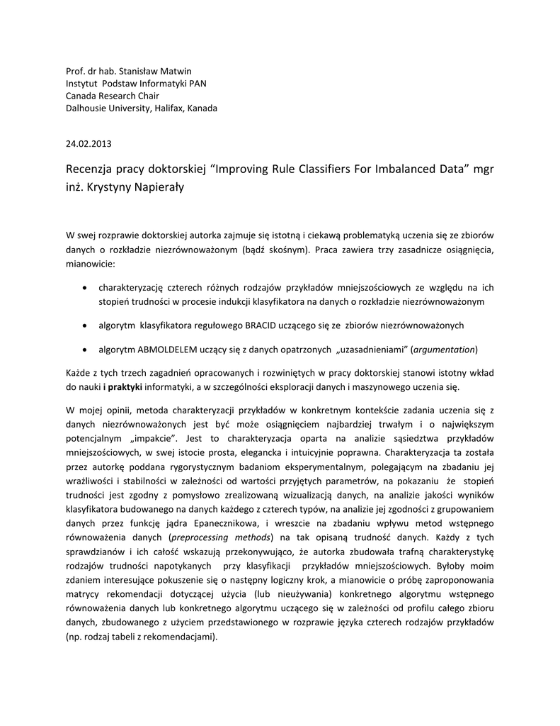 Prof. dr hab. Stanisław Matwin Instytut Podstaw Informatyki PAN Canada Research Chair Dalhousie University, Halifax, Kanada 24.02.2013 Recenzja pracy doktorskiej “Improving Rule Classifiers For Imbalanced Data” mgr inż. Krystyny Napierały W swej rozprawie doktorskiej autorka zajmuje się istotną i ciekawą problematyką uczenia się ze zbiorów danych o rozkładzie niezrównoważonym (bądź skośnym). Praca zawiera trzy zasadnicze osiągnięcia, mianowicie: charakteryzację czterech różnych rodzajów przykładów mniejszościowych ze względu na ich stopień trudności w procesie indukcji klasyfikatora na danych o rozkładzie niezrównoważonym algorytm klasyfikatora regułowego BRACID uczącego się ze zbiorów niezrównoważonych algorytm ABMOLDELEM uczący się z danych opatrzonych „uzasadnieniami” (argumentation) Każde z tych trzech zagadnień opracowanych i rozwiniętych w pracy doktorskiej stanowi istotny wkład do nauki i praktyki informatyki, a w szczególności eksploracji danych i maszynowego uczenia się. W mojej opinii, metoda charakteryzacji przykładów w konkretnym kontekście zadania uczenia się z danych niezrównoważonych jest być może osiągnięciem najbardziej trwałym i o największym potencjalnym „impakcie”. Jest to charakteryzacja oparta na analizie sąsiedztwa przykładów mniejszościowych, w swej istocie prosta, elegancka i intuicyjnie poprawna. Charakteryzacja ta została przez autorkę poddana rygorystycznym badaniom eksperymentalnym, polegającym na zbadaniu jej wrażliwości i stabilności w zależności od wartości przyjętych parametrów, na pokazaniu że stopień trudności jest zgodny z pomysłowo zrealizowaną wizualizacją danych, na analizie jakości wyników klasyfikatora budowanego na danych każdego z czterech typów, na analizie jej zgodności z grupowaniem danych przez funkcję jądra Epanecznikowa, i wreszcie na zbadaniu wpływu metod wstępnego równoważenia danych (preprocessing methods) na tak opisaną trudność danych. Każdy z tych sprawdzianów i ich całość wskazują przekonywująco, że autorka zbudowała trafną charakterystykę rodzajów trudności napotykanych przy klasyfikacji przykładów mniejszościowych. Byłoby moim zdaniem interesujące pokuszenie się o następny logiczny krok, a mianowicie o próbę zaproponowania matrycy rekomendacji dotyczącej użycia (lub nieużywania) konkretnego algorytmu wstępnego równoważenia danych lub konkretnego algorytmu uczącego się w zależności od profilu całego zbioru danych, zbudowanego z użyciem przedstawionego w rozprawie języka czterech rodzajów przykładów (np. rodzaj tabeli z rekomendacjami). Mam też na myśli pewną kwestię, na temat której ciekaw bym był poznać opinię doktorantki. Chodzi mi możliwy związek charakterystyki stopnia trudności przykładów w oparciu o własności ich sąsiedztw z teorią uczenia się, a konkretnie z Wapnikowskim pojęciem wymiaru VC i "rozbijalnością" (shattering) zbioru danych. Ogólnie bowiem trudność ta będzie zależała też od konkretnego klasyfikatora, jego "geometrii" czy też "skłonności" (bias). Krótka dyskusja możliwości tego związku, lub też jego braku, w wersji końcowej pracy, byłaby nie tylko ciekawa, lecz dowiązywałaby pracę do teorii uczenia się. Następnym ciekawym osiągnięciem jest oryginalne użycie przez autorkę metody "indukcji z uzasadnieniem” (argumentation‐based learning) zaproponowanej przez prof. I. Bratko do zadania uczenia się z danych niezrównoważonych. Ta ciekawa metoda, moim zdaniem niedoceniona przez środowisko, istotnie świetnie pasuje do zadania autorki. W procesie jej użycia został rozwiązany szereg nietrywialnych problemów technicznych, np. miara odległości między regułą a przykładem. Oprócz tego nowością jest też zaproponowana w pracy metoda wyboru przykładów wymagających uzasadnienia. Eksperymenty przedstawione w pracy pokazują, że dla danych niezrównoważonych ABMOLDELEM daje wyniki lepsze niż metody uczenia się reguł bez uzasadnienia. Naturalne byłoby empiryczne porównanie ABMODELEM z BRACID, ale o ile się nie mylę w pracy brak takiego eksperymentu ‐ zamieszczona jest jedynie ogólna dyskusja na str. 105. Bardzo ciekawym pomysłem autorki, o którym też myślałem w trakcie lektury rozprawy, jest użycie w ABMODELEM metody generacji próbek danych, zapożyczonej z aktywnego uczenia się (active learning). Być może inne techniki używane w aktywnym uczeniu się też mogłyby być przydatne w ewentualnej kontynuacji tych badań. Trzecim osiągnięciem pracy jest oryginalna metoda uczenia się reguł na danych o rozkładzie niezrównoważonym, nazwana BRACID. Algorytm BRACID używa oryginalnego podejścia do wstępującego (bottom‐up) uogólnienia danych. Wydaje się, że można się doszukiwać podobieństwa między wprowadzonym w pracy pojęciem najkonkretniejszego uogólnienia (most specific generalization), a pojęciem least general generalization wprowdzonym przez Plotkina i opartym na znanej i dobrze zbadanej w logice strukturze kraty. W pracy przedstawione i omówione są wyniki dogłębnych eksperymentów na dużej liczbie zbiorów danych, wykazujących że BRACID działa lepiej niż konkurencyjne algorytmy, a także lepiej niż znane metody wstępnego równoważenia danych. Jest to niewątpliwie znaczący, oryginalny wynik autorki. Praca odznacza się bardzo dobrą znajomością metodologii badań w dziedzinie algorytmów uczących się, od krytycznego wyboru miar oceny klasyfikatorów do wyjątkowo skrupulatnej analizy istotności statystycznej wyników. Mam tu na myśli kompetentne użycie testów Friedmana, Nemenyi a także Wilcoxona, podczas gdy w literaturze autorzy najczęściej ograniczają się do niekoniecznie poprawnej analizy t‐testu Studenta. Ponadto dyskusje rozwiązań i wyników są bardzo dojrzałe i wykazują że autorka ma dobrze ukształtowane i głębokie intuicje dotyczące zagad