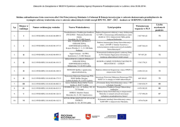 Załacznik do Zarządzenia nr 99/2014 Dyrektora Lubelskiej Agencji Wspierania Przedsiębiorczości w Lublinie z dnia 30.06.2014r. Siódma zaktualizowana Lista rezerwowa dla I Osi Priorytetowej, Działania 1.4 Schemat B Dotacje inwestycyjne w zakresie dostosowania przedsiębiorstw do wymogów ochrony środowiska oraz w zakresie odnawialnych źródeł energii RPO WL 2007 - 2013 - konkurs nr 10/RPOWL/1.4B/2012 Lp Miejsce w rankingu Numer ewidencyjny wniosku 1. I 10.12-WND-RPLU.01.04.02-06-009/13 2. I 10.12-WND-RPLU.01.04.02-06-147/13 3. II 10.12-WND-RPLU.01.04.02-06-093/13 4. II 10.12-WND-RPLU.01.04.02-06-101/13 5. II 10.12-WND-RPLU.01.04.02-06-108/13 6. II 10.12-WND-RPLU.01.04.02-06-173/13 7. III 10.12-WND-RPLU.01.04.02-06-082/13 8. IV 10.12-WND-RPLU.01.04.02-06-015/13 9. V 10.12-WND-RPLU.01.04.02-06-126/13 10. VI 10.12-WND-RPLU.01.04.02-06-162/13 Nazwa Wnioskodawcy Tytuł projektu Przedsiębiorstwo Produkcyjno-handlowe Budowa biogazowni rolniczej o mocy elektrycznej EWAGNES - Piekarnia Kozłowski 0,5 MW z towarzyszącą infrastrukturą na części Antoni, działki nr 124 w miejscowości Dęby gmina Szwedzka 26, 22-400 Zamość Lubycza Królewska SOL TYSZOWCE SPÓŁKA Z Budowa innowacyjnej farmy fotowoltaicznej o OGRANICZONĄ mocy 1,50 MW w Gminie Tyszowce z ODPOWIEDZIALNOŚCIĄ, wykorzystaniem cienkowarstwowych modułów Księcia Witolda 21 / I, 21-500 Biała fotowoltaicznych.” Podlaska Wzmocnienie konkurencyjności rynkowej firmy Sagan Grażyna - AS PRO, As Pro Grażyna Sagan przez inwestycję w Karminowa 3, 21-002 Marysin instalację odnawialnych źródeł energii MEGATEM EC-LUBLIN SPÓŁKA Z BUDOWA FARMY FOTOWOLTAICZNEJ W OGRANICZONĄ MEGATEM EC – LUBLIN ODPOWIEDZIALNOŚCIĄ, Mełgiewska 7-9, 20-952 Lublin BIOMASS Spółka z ograniczoną odpowiedzialnością, Budowa elektrowni biogazowej o mocy 499kW w miejscowości Sielec. Wytwórnia Makaronu Domowego POLInwestycja Wytwórni Makaronu Domowego POLMAK Spółka Akcyjna, MAK S.A w energię ze źródeł odnawialnych Ludwin Kolonia 58, 21-075 Ludwin Jarosz-Zielińska Beata Delfin-Travel, „Utworzenie farmy fotowoltaicznej o mocy 1 MV Krótka 4, 20-077 Lublin w Kolonii Trawniki ” CENERGO Sp. z o.o., ul. Garbary 102, 61- Przemysłowa Produkcja Energii Odnawialnej 757 Poznań Andrzejów Budowa farmy fotowoltaicznej w miejscowości SOREX1 Sokołów Daniel, Mościska w ramach nowych inwestycji i Mościska 44, 21-302 Kąkolewnica rozbudowy przedsiębiorstwa Sorex1 SZYDŁOWSKI KRZYSZTOF KWAZAR Wykonanie instalacji fotowoltaicznej o mocy ENERGY, 0,600 MW w miejscowości Marianka. Jutrzenki 16 / 65, 20-538 Lublin Wnioskowane wsparcie w PLN Liczba uzyskanych punktów 3 027 965,42 73 4 407 564,10 73 707 857,20 72 3 543 370,21 72 4 694 223,34 72 669 369,43 72 3 505 038,79 69 4 478 502,92 68 1 727 498,50 67 1 874 676,00 65 Załacznik do Zarządzenia nr 99/2014 Dyrektora Lubelskiej Agencji Wspierania Przedsiębiorczości w Lublinie z dnia 30.06.2014r. 11. VII 10.12-WND-RPLU.01.04.02-06-061/13 12. VIII 10.12-WND-RPLU.01.04.02-06-055/13 13. IX 10.12-WND-RPLU.01.04.02-06-004/13 14. IX 10.12-WND-RPLU.01.04.02-06-078/13 15. X 10.12-WND-RPLU.01.04.02-06-169/13 16. X 10.12-WND-RPLU.01.04.02-06-170/13 17. XI 10.12-WND-RPLU.01.04.02-06-085/13 18. XII 10.12-WND-RPLU.01.04.02-06-022/13 19. XIII 10.12-WND-RPLU.01.04.02-06-157/13 20. XIV 10.12-WND-RPLU.01.04.02-06-023/13 Dom Misjonarzy Oblatów Maryi Zwiększenie konkurencyjności Domu Pielgrzyma Niepokalanej w Kodniu Dom Pielgrzyma w Kodniu poprzez budowę elektrowni w Kodniu, fotowoltaicznej Rynek 1, 21-509 Kodeń Zieliński Janusz Restauracja ARKADIA, Dywersyfikacja działalności firmy Zieliński Kolonia Łaszczówka 79, 20-600 Janusz Restauracja ARKADIA poprzez utworzenie farmy fotowoltaicznej Tomaszów Lubelski PRZEDSIEBIORSTWO WIELOBRANŻOWE BISTAR K. Dywersyfikacja działalności spółki Bistar poprzez BURAK I S-KA SPÓŁKA inwestycję w innowacyjną elektrownię KOMANDYTOWA, fotowoltaiczną. NOWOSIELSKA 2A, 15-617 BIAŁYSTOK Budowa farmy fotowoltaicznej przez PRZEDSIĘBIORSTWO METALOWE Przedsiębiorstwo Metalowe WISBERG SP. Z O. WISBERG SP Z O O, O. szansą na wzrost konkurencyjności Suszno 12, 22-200 Suszno przedsiębiorstwa INTER PGA sp. z o.o., Budowa Farmy Fotowoltaicznej w miejscowości Sidorska 59, 21-500 Biała Podlaska Brzeźno GREENSON sp. z o.o., GREENSON Sp. z o.o. producentem słonecznej Tęczowa 159 E, 20-517 Lublin energii FIRMA SŁAWEX Sławiński Zbigniew, Poprawa konkurencyjności Firmy SŁAWEX Łaszczowiecka 14, 22-600 Tomaszów poprzez inwestycję w fotowoltaikę Lubelski MEGAZ Michał Lato, Budowa elektrowni słonecznej Zamołodycze Kolonia Łucka 81 A, 21-100 Lubartów Podniesienie efektywności energetycznej Protechnika Grzegorz Kowalczyk, przedsiębiorstwa PROTECHNIKA Grzegorz Żelechowska 67, 21-400 Łuków Kowalczyk MEWA s.c. Agnieszka Lato Monika Zalewska, Kolonia Łucka 81 A, 21-100 Lubartów 494 518,81 64 290 683,74 63 3 291 860,93 61 3 345 994,90 61 2 395 850,00 60 1 617 180,00 60 718 948,51 59 364 680,76 58 509 694,99 53 Mała Elektrownia Wodna na rzece Bystrzyca Duża km 0+450 322 411,39 52 RAZEM: 41 987 889,94
