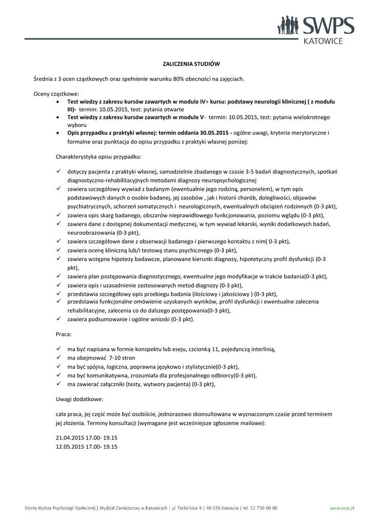 ZALICZENIA STUDIÓW Średnia z 3 ocen cząstkowych oraz spełnienie warunku 80% obecności na zajęciach. Oceny cząstkowe: Test wiedzy z zakresu kursów zawartych w module IV+ kursu: podstawy neurologii klinicznej ( z modułu III)- termin: 10.05.2015, test: pytania otwarte Test wiedzy z zakresu kursów zawartych w module V- termin: 10.05.2015, test: pytania wielokrotnego wyboru Opis przypadku z praktyki własnej: termin oddania 30.05.2015 - ogólne uwagi, kryteria merytoryczne i formalne oraz punktacja do opisu przypadku z praktyki własnej poniżej: Charakterystyka opisu przypadku: dotyczy pacjenta z praktyki własnej, samodzielnie zbadanego w czasie 3-5 badań diagnostycznych, spotkań diagnostyczno-rehabilitacyjnych metodami diagnozy neuropsychologicznej zawiera szczegółowy wywiad z badanym (ewentualnie jego rodziną, personelem), w tym opis podstawowych danych o osobie badanej, jej zasobów , jak i historii chorób, dolegliwości, objawów psychiatrycznych, schorzeń somatycznych i neurologicznych, ewentualnych obciążeń rodzinnych (0-3 pkt), zawiera opis skarg badanego, obszarów nieprawidłowego funkcjonowania, poziomu wglądu (0-3 pkt), zawiera dane z dostępnej dokumentacji medycznej, w tym wywiad lekarski, wyniki dodatkowych badań, neuroobrazowania (0-3 pkt), zawiera szczegółowe dane z obserwacji badanego i pierwszego kontaktu z nim( 0-3 pkt), zawiera ocenę kliniczną lub/i testową stanu psychicznego (0-3 pkt), zawiera wstępne hipotezy badawcze, planowane kierunki diagnozy, hipotetyczny profil dysfunkcji (0-3 pkt), zawiera plan postępowania diagnostycznego, ewentualne jego modyfikacje w trakcie badania(0-3 pkt), zawiera opis i uzasadnienie zastosowanych metod diagnozy (0-3 pkt), przedstawia szczegółowy opis przebiegu badania (ilościowy i jakościowy ) (0-3 pkt), przedstawia funkcjonalne omówienie uzyskanych wyników, profil dysfunkcji i ewentualne zalecenia rehabilitacyjne, zalecenia co do dalszego postępowania(0-3 pkt), zawiera podsumowanie i ogólne wnioski (0-3 pkt). Praca: ma być napisana w formie konspektu lub eseju, czcionką 11, pojedynczą interlinią, ma obejmować 7-10 stron ma być spójna, logiczna, poprawna językowo i stylistycznie(0-3 pkt), ma być komunikatywna, zrozumiała dla profesjonalnego odbiorcy(0-3 pkt), ma zawierać załączniki (testy, wytwory pacjenta) (0-3 pkt), Uwagi dodatkowe: cała praca, jej część może być osobiście, jednorazowo skonsultowana w wyznaczonym czasie przed terminem jej złożenia. Terminy konsultacji (wymagane jest wcześniejsze zgłoszenie mailowe): 21.04.2015 17.00- 19.15 12.05.2015 17.00- 19.15 PROGRAM STUDIÓW NAZWA MODUŁU PRZEDMIOT Ocena neuropsychologiczna w warunkach praktyki klinicznej - WYKŁAD INAUGURACYJNY MODUŁ I WPROWADZENIE DO NEUROPSYCHOLOGII KLINICZNEJ MODUŁ II WSPÓŁCZESNA NEUROPSYCHOLOGIA KLINICZNA MODUŁ III STRUKTURA, FUNKCJA, MECHANIZMY PATOLOGII UKŁDU NERWOWEGO Poglądy na temat związku mózg- zachowanie i podstawy mózgowej organizacji funkcji psychicznych. Mózgowe mechanizmy zachowania z perspektywy neuroobrazowania- procesy emocjonalne, plastyczność mózgowa Mózgowe mechanizmy zachowania z perspektywy neuroobrazowania - asymetria funkcjonalna, mózgowe podłoże uwagi, pamięci, funkcji wykonawczych Mózgowe mechanizmy zachowania, na przykładzie funkcji językowych i komunikacyjnych, z perspektywy historycznej i neuroobrazowania Anatomia i fizjologia układu nerwowego- podstawowe pojęcia dla praktyki neuropsychologicznej. Elementy neuropsychiatrii z perspektywy psychiatrii wieku rozwojowego- podstawy psychiatrii dzieci i młodzieży ILOŚĆ GODZIN 2 12 10 10 5 11 19 Podstawy neurologii klinicznej Zaburzenia samoświadomości z perspektywy neuropsychologii klinicznej 20 1 Zaburzenia funkcji językowych. Apraksja 4 2 MODUŁ IV NEUROPSYCHOLOGICZNE Agnozja NASTĘPSTWA USZKODZEŃ Dysfunkcje poznawcze. Zaburzenia mnestyczne. MÓZGU I WYBRANE Zaburzenia procesów uwagi. SYNDROMY Zaburzenie funkcji wykonawczych. 3 6 2 6 Omówienie deficytów neuropsychologicznych w wybranych chorobach naczyniowych mózgu Zespół zaniedbywania stronnego 4 3 Metody przesiewowe i badanie w nurcie eksperymentalno- klinicznym. MODUŁ V METODY DIAGNOZY Metody badania pamięci NEUROPSYCHOLOGICZNEJ Badanie funkcji wykonawczych. Profil deficytów neuropsychologicznych w wybranych schorzeniach oun. Analizy przypadków MODUŁ VI Problem diagnozy stanów pourazowych. PROBLEM DIAGNOZY Problem diagnozy osób w wieku podeszłym. NEUROPSYCHOLOGICZNEJ I Dysfunkcje sfery wykonawczej z perspektywy neurorehabilitacji. NEUROREHABILITACJI Diagnoza neuropsychologiczna- od teorii do praktyki. 10 8 Seminarium superwizyjne SUMA GODZIN 10 10 10 10 3 10 5 196