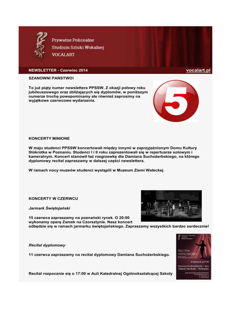 NEWSLETTER - Czerwiec 2014 vocalart.pl SZANOWNI PAŃSTWO! To już piąty numer newslettera PPSSW. Z okazji połowy roku jubileuszowego oraz zbliżających się dyplomów, w poniższym numerze trochę powspominamy ale również zaprosimy na wyjątkowe czerwcowe wydarzenia. KONCERTY MINIONE W maju studenci PPSSW koncertowali między innymi w zaprzyjaźnionym Domu Kultury Stokrotka w Poznaniu. Studenci I i II roku zaprezentowali się w repertuarze solowym i kameralnym. Koncert stanowił też rozgrzewkę dla Damiana Suchożerbskiego, na którego dyplomowy recital zapraszamy w dalszej części newslettera. W ramach nocy muzeów studenci wystąpili w Muzeum Ziemi Wałeckej. KONCERTY W CZERWCU Jarmark Świętojański 15 czerwca zapraszamy na poznański rynek. O 20:00 wykonamy operę Zamek na Czorsztynie. Nasz koncert odbędzie się w ramach jarmarku świętojańskiego. Zapraszamy wszystkich bardzo serdecznie! Recital dyplomowy 11 czerwca zapraszamy na recital dyplomowy Damiana Suchożerbskiego. Recital rozpocznie się o 17:00 w Auli Katedralnej Ogólnokształcącej Szkoły Muzycznej przy ulicy Filipińskiej 5 w Poznaniu. FELIETON PANI PROFESOR Wspomnienia i – nie tylko! Minął rok od niezwykle ważnej dla mnie Uroczystości, którą była „Gala Jubileuszowa“ zorganizowana przez moich Wychowanków. Główne i pierwsze „skrzypce“ zagrała w tej organizacji moja Wspaniała Córka Barbara. Wymyśliła i przeprowadziła całą logistykę prezentacji, koncertu i mojego spotkania z przeszłością. Mocnym wsparciem dla niej był jej brat, a mój syn - Szymon i niezwykły młody człowiek, który kiedyś miał w sobie pokorę uczenia się w mojej klasie wokalnej - wspaniały artysta, reżyser i choreograf –Mateusz Polit. Ogromnym zaskoczeniem była dla mnie wielka frekwencja znajomych, przyjaciół a przede wszystkim moich byłych i obecnych uczniów i studentów.Nie spodziewałam się, że tak wiele osób znajdzie się tego wieczoru na Sali Koncertowej „Aula Nova“ Akademii Muzycznej w Poznaniu. Przyjazne twarze, uśmiechy, brawa.....Wielkie wzruszenie, wspólne łzy! Zrozumiałam wtedy, że PRZESZŁOŚĆ może być TERAŹNIEJSZOŚCIĄ. Zrozumiałam, że WARTOŚCI, którymi żyłam i które wpoili mi moi rodzice - opierające się o konsekwencje dążeń do wiedzy, dobra, do piękna i zrozumienia człowieka - SĄ WIECZNE. One nie mijają! Tak! To była dla mnie wielka lekcja historii mojej i Was Wszystkich Tych, którzy byliście ze mną ze mną w ten JEDYNY dla mnieWIECZÓR! Niedawno też, bardzo zresztą przypadkowo, obejrzałam stary film o harcerstwie pt.: „Czarne Stopy“. Sercem moim targnęła wielka tęsknota za tymi latami, gdy z moimi „Niebieskimi Chustami“ wyśpiewywałam „Idziemy w jasną, z błękitów utkaną dal“, „Harcereską dolę“, „Płonie ognisko i szumią knieje“ i wiele innych, cudownych młodzieżowych, harcerskich i zuchowych pieśni. Myślę, że w swojej „jesieni życia“ powrócę do „GAWĘD“, do tych opowiadań, i zachowań, które przekazywały dobro, szlachetność, poświęcenie, odwagę i rozumienie drugiego człowieka. W latach sześćdziesiątych do osiemdziesiątych ubiegłego stulecia, niewygodnych dla ludzi pragnących prawdy, gdyż ograniczonych komunistycznym systemem, udało się gromadzić młodzież kochającą piękno, działającą dla szlachetnych celów i wspaniałą artystycznie. Moje młode życie, to zespoły harcerskie, młodzieżowe i studenckie, które przerodziły się w Towarzystwo Muzyczne i wreszcie, w pierwszą po Wyzwoleniu prywatną szkołę śpiewu – Prywatne, Policealne Studium Sztuki Wokalnej. Moja młodzież towarzyszyła mi też na wielu salach koncertowych, gdy jako solistka śpiewałam oratoria i recitale wokalne. Ale – czy na tym ma się skończyć ta permanenta działalność dla sztuki śpiewania? Otóż nie! Jest już Was tyle - moich wspaniałych artystów, że możemy pokusić się o tworzenie jeszcze ciągle innych, oryginalnych i wartościowych placówek kulturalnych. A może zawalczymy o najprawdziwszą OPERĘ MŁODYCH? Scenę dla młodych, realizowaną i pisaną przez młodych. Taką zwyczajną, bez udziwnień i „silenia się“ na panujące mody propagujące wulgaryzm i szarzyznę, której często nie spotyka się nawet w życiu codziennym. Jest wiele do zrobienia! A więc – trzeba działać MOJA MŁODZIEŻY! HISTORIA SZKOŁY Szanowni Państwo! Przy okazji przygotowywania się do kolejnego naboru nowych studentów PPSSW wpadliśmy na pomysł, aby odświeżyć w skrócie założenia edukacyjne naszej placówki. Prezentujemy też plakat, który posłuży nam do promowania szkoły w czasie rekrutacji. Poniżej przypominamy o naszych priorytetach, słowem, dlaczego warto u nas studiować? PPSSW było pierwszą w Polsce niepubliczną artystyczną szkołą policealną, kształcącą w zawodzie muzyk o specjalności wokalista. Współpracując z instytucjami muzycznymi Poznania i kraju nasza placówka daje ona możliwość szerokiej, artystycznej prezentacji swoich studentów i absolwentów. Ci z kolei - otoczeni indywidualną opieką pedagogów Studium, rozwijają swój talent zgodnie z przesłankami natury własnej osobowości. Takie warunki i możliwości stwarza autorska metoda dyrektorki - prof. Jadwigi Gałęskiej-Tritt, uwzględniająca w pracy nad techniką wokalną indywidualne cechy psychofizjologii emocjonalnej i psychoakustyki każdego z adeptów sztuki śpiewania. Wyzwalanie osobowości artystycznych odbywa się także poprzez liczne i różnorodne projekty artystyczne i programy koncertowe. Ponadto słuchacze mają możliwość współpracy z bardzo dobrymi zespołami instrumentalnymi, znakomitymi pianistami i młodymi kompozytorami, które to kontakty stanowią o wykształceniu muzyka o szerokich, artystycznych horyzontach. Nauka w Studium trwa trzy lata. W trakcie jej trwania studenci mają możliwość dojścia do własnej prawdy osobowościowo - artystycznej. W dobie