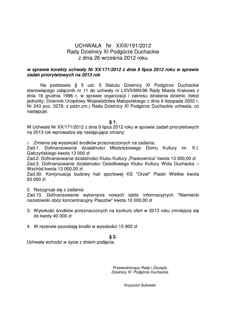 UCHWAŁA Nr XXIII/191/2012 Rady Dzielnicy XI Podgórze Duchackie z dnia 26 września 2012 roku w sprawie korekty uchwały Nr XX/171/2012 z dnia 9 lipca 2012 roku w sprawie zadań priorytetowych na 2013 rok Na podstawie § 5 ust. 5 Statutu Dzielnicy XI Podgórze Duchackie stanowiącego załącznik nr 11 do uchwały nr LXVII/660/96 Rady Miasta Krakowa z dnia 18 grudnia 1996 r. w sprawie organizacji i zakresu działania dzielnic (tekst jednolity: Dziennik Urzędowy Województwa Małopolskiego z dnia 6 listopada 2002 r. Nr 243 poz. 3278, z późn.zm.) Rada Dzielnicy XI Podgórze Duchackie uchwala, co następuje: § 1. W Uchwale Nr XX/171/2012 z dnia 9 lipca 2012 roku w sprawie zadań priorytetowych na 2013 rok wprowadza się następujące zmiany: Zmienia się wysokość środków przeznaczonych na zadania: Zad.1. Dofinansowanie działalności Młodzieżowego Domu Kultury im. K.I. Gałczyńskiego kwota 13 000 zł Zad.2. Dofinansowanie działalności Klubu Kultury „Piaskownica” kwota 13 000,00 zł Zad.3. Dofinansowanie działalności Osiedlowego Klubu Kultury Wola Duchacka – Wschód kwota 13 000,00 zł Zad.30. Kontynuacja budowy hali sportowej KS "Orzeł" Piaski Wielkie kwota 93 000 zł 1. 2. Rezygnuje się z zadania: Zad.10. Dofinansowanie wykonania nowych tablic informacyjnych "Niemiecki nazistowski obóz koncentracyjny Płaszów" kwota 10 000,00 zł 3. Wysokość środków przeznaczonych na konkurs ofert w 2013 roku zmniejsza się do kwoty 40 000 zł 4. W rezerwie pozostają środki w wysokości 15 900 zł § 2. Uchwała wchodzi w życie z dniem podjęcia. Przewodniczący Rady i Zarządu Dzielnicy XI Podgórze Duchackie Krzysztof Sułowski