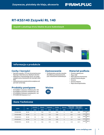 Zszywacze, pistolety do kleju, akcesoria RT-KSS140 Zszywki RL 140 Zszywki z płaskiego drutu idealne do prac budowlanych Informacja o produkcie Cechy i korzyści Zastosowanie Materiał podłoża • Szeroka zszywka 1,25 mm nie przecina przy bijanego materiału przy idealnym docisku • Wykonana z hartowanego drutu nie ulega wygięciu przy stosowaniu do twardych pod łoży • Galwanizowana powierzchnia zwiększa od porność na korozję • Profesjonalna szeroka zszywka dla dekarzy przeznaczona do prac remontowo budowlanych • • • • • • • Produkty powiązane Ważne • • • • Drewno egzotyczne Płyta OSB Płyta gipsowo-kartonowa Drewno konstrukcyjne Drewno Drewno klejone Płyta drewnopochodna RT-KGR0011 Zszywacz młotkowy RL 140 RT-KGR0014 Zszywacz metalowy RL 140 RT-KGR0024 Zszywacz metalowy RL 140 RT-KGR0160 Zszywacz 6 w 1 Dane Techniczne Indeks Waga opako Waga opako wania jed wania zbior Wysokość Długość Głębokość Pudełko Zbiorcze [mm] [mm] [mm] [szt] [szt] kg kg Typ RT-KSS14006 RL140 6 10,5 1.25 1250 6 0.82 9.82 RT-KSS14008 RL140 8 10,5 1.25 1250 6 0.94 11.33 RT-KSS14010 RL140 10 10,5 1.25 1250 6 1.07 12.83 RT-KSS14012 RL140 12 10,5 1.25 1250 6 1.21 14.54 RT-KSS14014 RL140 14 10,5 1.25 1250 6 1.34 16.11 EAN 53915128215 79 53915128215 86 53915128215 93 53915128216 09 53915128216 16 www.rawlplug.com 1