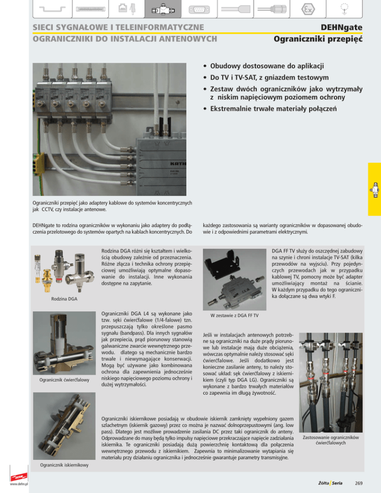 1 2 3 4 5 6 7 8 9 0 Sieci SyGnałOwe i teleinFOrmatyczne OGraniczniKi dO inStalacji antenOwych dehngate Ograniczniki przepięć • Obudowy dostosowane do aplikacji • Do TV i TV-SAT, z gniazdem testowym • Zestaw dwóch ograniczników jako wytrzymały z niskim napięciowym poziomem ochrony • Ekstremalnie trwałe materiały połączeń Ograniczniki przepięć jako adaptery kablowe do systemów koncentrycznych jak CCTV, czy instalacje antenowe. DEHNgate to rodzina ograniczników w wykonaniu jako adaptery do podłączenia przelotowego do systemów opartych na kablach koncentrycznych. Do każdego zastosowania są warianty ograniczników w dopasowanej obudowie i z odpowiednimi parametrami elektrycznymi. Rodzina DGA różni się kształtem i wielkością obudowy zależnie od przeznaczenia. Różne złącza i technika ochrony przepięciowej umożliwiają optymalne dopasowanie do instalacji. Inne wykonania dostępne na zapytanie. DGA FF TV służy do oszczędnej zabudowy na szynie i chroni instalacje TV-SAT (kilka przewodów na wyjsciu). Przy pojedynczych przewodach jak w przypadku kablowej TV, pomocny może być adapter umożliwiający montaż na ścianie. W każdym przypadku do tego ogranicznika dołączane są dwa wtyki F. Rodzina DGA Ogranicznik ćwierćfalowy Ograniczniki DGA L4 są wykonane jako tzw. sęki ćwierćfalowe (1/4-falowe) tzn. przepuszczają tylko określone pasmo sygnału (bandpass). Dla innych sygnałów jak przepiecia, prąd piorunowy stanowią galwaniczne zwarcie wewnętrznego przewodu. dlatego są mechanicznie bardzo trwałe i niewymagające konserwacji. Mogą być używane jako kombinowana ochrona dla zapewnienia jednocześnie niskiego napięciowego poziomu ochrony i dużej wytrzymałości. W zestawie z DGA FF TV Jeśli w instalacjach antenowych potrzebne są ograniczniki na duże prądy piorunowe lub instalacje mają duże obciążenia, wówczas optymalnie należy stosować sęki ćwierćfalowe. Jeśli dodatkowo jest konieczne zasilanie anteny, to należy stosować układ: sęk ćwierćfalowy z iskiernikiem (czyli typ DGA LG). Ograniczniki są wykonane z bardzo trwałych materiałów co zapewnia im długą żywotność. Ograniczniki iskiernikowe posiadają w obudowie iskiernik zamknięty wypełniony gazem szlachetnym (iskiernik gazowy) przez co można je nazwać dolnoprzepustowymi (ang. low pass). Dlatego jest możliwe prowadzenie zasilania DC przez taki ogranicznik do anteny. Odprowadzane do masy będą tylko impulsy napięciowe przekraczające napięcie zadziałania iskiernika. Te ograniczniki posiadają dużą powierzchnię kontaktową dla połączenia wewnętrznego przewodu z iskiernikiem. Zapewnia to minimalizowanie wytapiania się materiału przy działaniu ogranicznika i jednocześnie gwarantuje parametry transmisyjne. Zastosowanie ograniczników ćwierćfalowych Ogranicznik iskiernikowy www.dehn.pl 1 2 3 4 5 6 7 8 9 0 dehngate Ograniczniki przepięć Sieci SyGnałOwe i teleinFOrmatyczne OGraniczniKi dO inStalacji antenOwych sprawdzanie sygnału Signal-Test 1 C DGA DEHNga te SPD FF TV No. 909 I N 703 U 24 V 2A HF Test-Signal Test HF sygnału o.k. OK TP 5-2400 MHz 5-3000 MHz -20 dB Messung odczyt protected DEHNgate TP =- gniazdo Testpunktdo testów DGA FF TV KLASSE SPD No. 909 703 IN 2A UC 24 V 2 A DGA DEHNga te HF Test-Signal Test HF sygnału SPD FF TV No. 909 I N 703 U C24 V 2A CLASS Messung odczyt TP 5-2400 MHz 5-3000 MHz sprawdzić System instalację überprüfen -20 dB protected DEHNgate DGA FF TV KLASSE Eingang wejście SPD No. 909 703 IN 2A UC 24 V A wyjście chronione Geschützter Ausgang CLASS DGA FF TV jako pierwszy ogranicznik przepięć posiada zabudowane gniazdo do testowania sygnału z instalacji antenowej. Ułatwia to prace serwisowe, aby testować instalację minimalnym nakładem. C DGA DEHNga te SPD FF TV No. 909 I N 703 U 24 V 2A 3 TP 5-2400 MHz 5-3000 MHz -20 dB protected DEHNgate DGA FF TV KLASSE SPD No. 909 703 IN 2A UC 24 V A CLASS Sprawdzanie sygnału na ograniczniku DGA FF TV Wykonanie uziemienia ograniczników zależy od wymiarów i ich budowy. Szczegóły na ten temat zawarto w danych technicznych. długość przewodu maks. 0,5 m, 1 mm. Uziemienie DGA AG N i DGA L ... 0 www.dehn.pl 1 2 3 4 5 6 7 8 9 0 Sieci SyGnałOwe i teleinFOrmatyczne OGraniczniKi dO inStalacji antenOwych Rysunek wymiarowy DGA F Z układem diodowym o niskiej pojemności własnej dla umożliwenia szybkiej transmisji. Szybki ogranicznik przepięć do interfejsu G.03. Uziemienie przez obudowę. Złącze 1./5.. dehngate dGa F • Łatwe podłączenie • Do szybkiej transmisji • Do stosowania zgodnie ze Strefową Koncepcją Ochrony Odgromowej jako przejście pomiędzy strefami 1 – 2 i wyżej DGA F 1.6 5.6 Klasa ogranicznika Napięcie znamionowe UN Największe napięcie trwałej pracy DC UC Prąd znamionowy IL C2 Znamionowy prąd wyładowczy (8/20) In Napięciowy poziom ochrony przy In C2 UP Napięciowy poziom ochrony przy 1 kV/µs C3 UP Zakres częstotliwości pracy Tłumienność wtrąceniowa Impedancja falowa Z Pojemność własna linia-ekran C Zakres temperatur pracy Stopień ochrony Podłączenie wejście / wyjście Uziemienie przez Materiał obudowy Kolor Spełnia wymagania normy Certyfikaty dodatkowe Dane potrzebne do zamówienia Typ Numer katalogowy Opakowanie jednostkowe www.dehn.pl W 5V V 0,5 A 0,3 kA ≤ 30 V ≤ 1 V DC - 80 MHz ≤ 0, dB 5 Ohm 50 pF -40°C...+80°C IP 0 wtyk 1./5. / gniazdo 1./5. podłączenie obudowy lub ekranu metal naturalny PN-EN 143-1 GOST DGA F 1. 5. 929 040 1 szt. 3