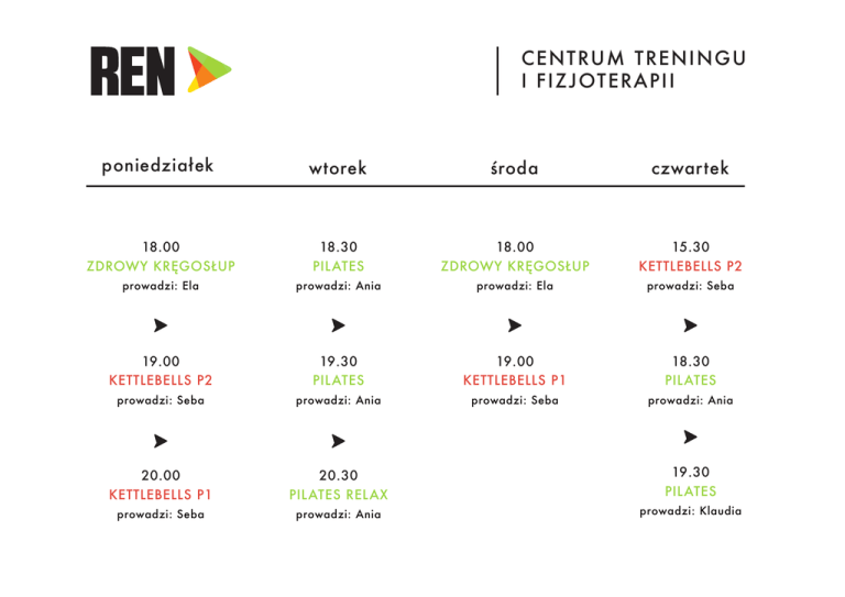C ENTRUM TRENIN GU I FIZJOTERAPII poniedziałek wtorek środa czwartek 18.00 ZDROWY KRĘGOSŁUP 18.30 PILATES 18.00 ZDROWY KRĘGOSŁUP 15.30 KETTLEBELLS P2 prowadzi: Ela prowadzi: Ania prowadzi: Ela prowadzi: Seba - - - - 19.00 KETTLEBELLS P2 19.30 PILATES 19.00 KETTLEBELLS P1 18.30 PILATES prowadzi: Seba prowadzi: Ania prowadzi: Seba prowadzi: Ania - - - 20.00 KETTLEBELLS P1 20.30 PILATES RELAX 19.30 PILATES prowadzi: Seba prowadzi: Ania prowadzi: Klaudia PILATES - znana i lubiana forma ćwiczeń stworzona przez Josepha Pilatesa. Ćwiczymy na boso, w rytmie swojego oddechu wzmacniając centrum (core), uelastyczniając ciało i mobilizując kręgosłup. Często dla urozmaicenia korzystamy z przyborów: dużych piłek, ovo ball, piłeczek redondo, magic circle, pasków, gum i rollera. PILATES RELAX - zajęcia przeznaczona dla osób chcących się zrelaksować w ruchu. Bazujemy na ćwiczeniach mobilizacyjnych i oddechowych w bardzo spokojnym tempie ZDROWY KRĘGOSŁUP – trening przeznaczony dla osób chcących zadbać o zdrowie kręgosłupa. Bazuje na wzmacnianiu mięśni stabilizacyjnych, doskonaleniu równowagi i ruchach funkcjonalnych. Nie zabraknie też rozciągania, automasażu i pracy z oddechem. HARD STYLE KETTLEBELLS P1 - trening na poziomie początkującym z wykorzystaniem odważników kulowych oraz masy ciężaru własnego ciała. Skoncentrowany na budowaniu siły, wytrzymałości i ogólnej sprawności. Doskonały wybór dla każdego kto chce zbudować formę i kondycję – po prostu chce być lepszym. HARD STYLE KETTLEBELLS P2 - trening na poziomie zaawansowanym.