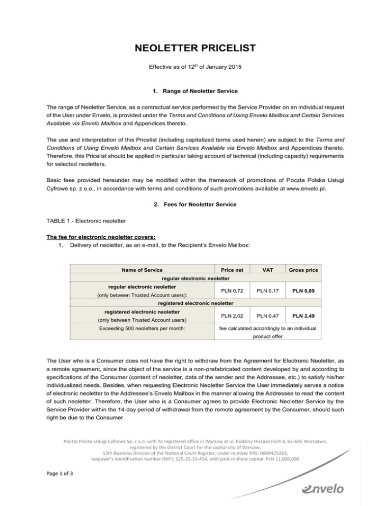 NEOLETTER PRICELIST Effective as of 12th of January 2015 1. Range of Neoletter Service The range of Neoletter Service, as a contractual service performed by the Service Provider on an individual request of the User under Envelo, is provided under the Terms and Conditions of Using Envelo Mailbox and Certain Services Available via Envelo Mailbox and Appendices thereto. The use and interpretation of this Pricelist (including capitalized terms used herein) are subject to the Terms and Conditions of Using Envelo Mailbox and Certain Services Available via Envelo Mailbox and Appendices thereto. Therefore, this Pricelist should be applied in particular taking account of technical (including capacity) requirements for selected neoletters. Basic fees provided hereunder may be modified within the framework of promotions of Poczta Polska Usługi Cyfrowe sp. z o.o., in accordance with terms and conditions of such promotions available at www.envelo.pl. 2. Fees for Neoletter Service TABLE 1 - Electronic neoletter The fee for electronic neoletter covers: 1. Delivery of neoletter, as an e-mail, to the Recipient’s Envelo Mailbox: Name of Service Price net VAT Gross price PLN 0,17 PLN 0,89 PLN 0,47 PLN 2,49 regular electronic neoletter regular electronic neoletter (only between Trusted Account users): PLN 0,72 registered electronic neoletter registered electronic neoletter (only between Trusted Account users) Exceeding 500 neoletters per month: PLN 2,02 fee calculated accordingly to an individual product offer The User who is a Consumer does not have the right to withdraw from the Agreement for Electronic Neoletter, as a remote agreement, since the object of the service is a non-prefabricated content developed by and according to specifications of the Consumer (content of neoletter, data of the sender and the Addressee, etc.) to satisfy his/her individualized needs. Besides, when requesting Electronic Neoletter Service the User immediately serves a notice of electronic neoletter to the Addressee’s Envelo Mailbox in the manner allowing the Addressee to read the content of such neoletter. Therefore, the User who is a Consumer agrees to provide Electronic Neoletter Service by the Service Provider within the 14-day period of withdrawal from the remote agreement by the Consumer, should such right be due to the Consumer. Poczta Polska Usługi Cyfrowe Sp. z o.o. with its registered office in Warsaw at ul. Rodziny Hiszpańskich 8, 02-685 Warszawa, registered by the District Court for the capital city of Warsaw, 13th Business Division of the National Court Register, under number KRS: 0000425263, taxpayer’s identification number (NIP): 525-25-33-454, with paid-in share capital: PLN 11,000,000 Page 1 of 3 TABLES 2 – Printed neoletter The fee for domestic economy printed neoletter covers: 1. 2. Generation of one message with neoletter under Envelo Mailbox, Printout of neoletter on one sheet of paper, one-sided or duplex print, 3. Dispatch to the Postal Operator**, as a domestic economy letter: Table 2A: Name of Service 4. Price net VAT Gross price printed neoletter, black-and-white print PLN 1.54 PLN 0.35 PLN 1.89 printed neoletter, color print PLN 1.94 PLN 0.45 PLN 2.39 VAT Gross price The following options are available at extra charge: Table 2B: printed neoletter - additional options at extra charge on Price top of fees in Table 2A net domestic priority neoletter PLN 1.63 PLN 0.37 PLN 2.00 international economy neoletter PLN 4.47 PLN 1.03 PLN 5.50 international priority neoletter PLN 6.10 PLN 1.40 PLN 7.50 PLN 0.12 PLN 0.03 PLN 0.15 PLN 0.53 PLN 0.12 PLN 0.65 Each additional sheet, black-and-white, one-sided or duplex print, up to 5 additional sheets Each additional sheet, color, one-sided or duplex print, up to 5 additional sheets The fee for domestic registered printed neoletter covers: 1. 2. Generation of one message with neoletter under Envelo Mailbox, Printout of neoletter on one sheet of paper, one-sided or duplex print, 3. Dispatch to the Postal Operator**, as a domestic registered economy letter: Table 1C: 4. Name of Service Net price VAT Gross price domestic registered printed neoletter, black-and-white print: PLN 4.23 PLN 0.97 PLN 5.20 domestic registered printed neoletter, color print: PLN 4.76 PLN 1.09 PLN 5.85 Net price VAT Gross price PLN 3.09 PLN 0.71 PLN 3.80 Return receipt for domestic mail PLN 1.54 PLN 0.36 PLN 1.90 International priority letter* PLN 16.10 PLN 3.70 PLN 19.80 The following options are available at extra charge: Table 2D: registered printed neoletter - additional options at extra charge on top of fees in Table 2C Domestic priority letter Poczta Polska Usługi Cyfrowe Sp. z o.o. with its registered office in Warsaw at ul. Rodziny Hiszpańskich 8, 02-685 Warszawa, registered by the District Court for the capital city of Warsaw, 13th Business Division of the National Court Register, under number KRS: 0000425263, taxpayer’s identification number (NIP): 525-25-33-454, with paid-in share capital: PLN 11,000,000 Page 2 of 3 Return receipt for international mail Each additional sheet, black-and-white, one-sided or duplex print, up to 5 additional sheets Each additional sheet, color, one-sided or duplex print, up to 5 additional sheets Confirmation of dispatch of registered printed neoletter, delivered to the sender in the traditional form PLN 3.25 PLN 0.75 PLN 4.00 PLN 0.12 PLN 0.03 PLN 0.15 PLN 0.53 PLN 0.12 PLN 0.65 PLN 4.07 PLN 0.93 PLN 5.00 *No economy option for registered international mail, priority mail only. **The Postal Operator is Poczta Polska S.A. The User who is a Consumer does not have the right to withdraw from the Agreement for Printed Neoletter, as a remote agreement, since the object of the service is a non-prefabricated thing produced according to specifications of the Consumer (content of neoletter, data of the sender and the Addressee, etc.) to satisfy his/her individualized needs. Besides, the User to request Printed Neoletter Service uses an automatic date 