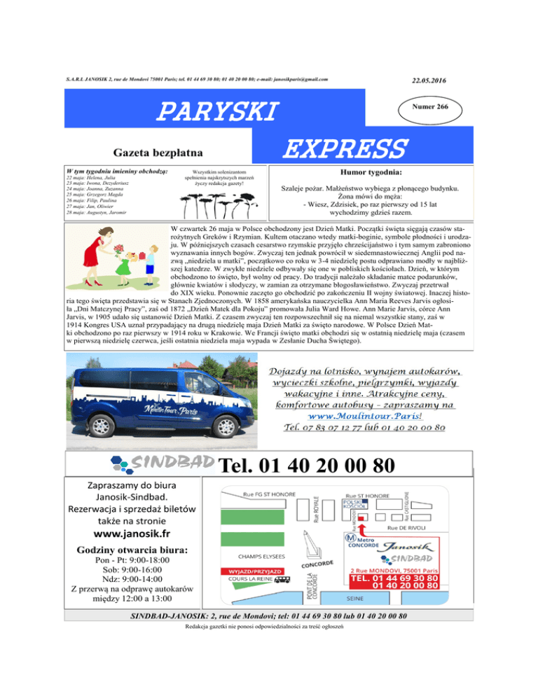 S.A.R.L JANOSIK 2, rue de Mondovi 75001 Paris; tel. 01 44 69 30 80; 01 40 20 00 80; e-mail: [email protected] 22.05.2016 PARYSKI EXPRESS Gazeta bezpłatna W tym tygodniu imieniny obchodzą: 22 maja: Helena, Julia 23 maja: Iwona, Dezyderiusz 24 maja: Joanna, Zuzanna 25 maja: Grzegorz Magda 26 maja: Filip, Paulina 27 maja: Jan, Oliwier 28 maja: Augustyn, Jaromir Numer 266 Wszystkim solenizantom spełnienia najskrytszych marzeń życzy redakcja gazety! Humor tygodnia: Szaleje pożar. Małżeństwo wybiega z płonącego budynku. Żona mówi do męża: - Wiesz, Zdzisiek, po raz pierwszy od 15 lat wychodzimy gdzieś razem. W czwartek 26 maja w Polsce obchodzony jest Dzień Matki. Początki święta sięgają czasów starożytnych Greków i Rzymian. Kultem otaczano wtedy matki-boginie, symbole płodności i urodzaju. W późniejszych czasach cesarstwo rzymskie przyjęło chrześcijaństwo i tym samym zabroniono wyznawania innych bogów. Zwyczaj ten jednak powrócił w siedemnastowiecznej Anglii pod nazwą „niedziela u matki”, początkowo co roku w 3-4 niedzielę postu odprawiano modły w najbliższej katedrze. W zwykłe niedziele odbywały się one w pobliskich kościołach. Dzień, w którym obchodzono to święto, był wolny od pracy. Do tradycji należało składanie matce podarunków, głównie kwiatów i słodyczy, w zamian za otrzymane błogosławieństwo. Zwyczaj przetrwał do XIX wieku. Ponownie zaczęto go obchodzić po zakończeniu II wojny światowej. Inaczej historia tego święta przedstawia się w Stanach Zjednoczonych. W 1858 amerykańska nauczycielka Ann Maria Reeves Jarvis ogłosiła „Dni Matczynej Pracy”, zaś od 1872 „Dzień Matek dla Pokoju” promowała Julia Ward Howe. Ann Marie Jarvis, córce Ann Jarvis, w 1905 udało się ustanowić Dzień Matki. Z czasem zwyczaj ten rozpowszechnił się na niemal wszystkie stany, zaś w 1914 Kongres USA uznał przypadający na drugą niedzielę maja Dzień Matki za święto narodowe. W Polsce Dzień Matki obchodzono po raz pierwszy w 1914 roku w Krakowie. We Francji święto matki obchodzi się w ostatnią niedzielę maja (czasem w pierwszą niedzielę czerwca, jeśli ostatnia niedziela maja wypada w Zesłanie Ducha Świętego). Tel. 01 40 20 00 80 Zapraszamy do biura Janosik-Sindbad. Rezerwacja i sprzedaż biletów także na stronie www.janosik.fr Godziny otwarcia biura: Pon - Pt: 9:00-18:00 Sob: 9:00-16:00 Ndz: 9:00-14:00 Z przerwą na odprawę autokarów między 12:00 a 13:00 SINDBAD-JANOSIK: 2, rue de Mondovi; tel: 01 44 69 30 80 lub 01 40 20 00 80 Redakcja gazetki nie ponosi odpowiedzialności za treść ogłoszeń PRACA : Do hotelu na sezon letni Handlowiec/opiekun klienta. Lyon Poszukujemy osoby do pracy w hotelu (Hautes Alpes, departament 05) na sezon letni – lipiec i sierpień, na pół etatu, ok. 600-700€ netto na miesiąc, praca legalna, wymagana komunikatywna znajomość j. francuskiego, osoby chętne proszę o kontakt mailowy na adres: [email protected]. Firma poszukuje osoby do prowadzenia biura handlowego oraz do opieki nad klientami. Wymagania: bardzo dobra lub dobra znajomość języka francuskiego, prawo jazdy kat. B, kreatywność, otwartość na kontakty z innymi ludźmi, zaangażowanie do pracy. Telefon: 0048 881 026 046. Poszukiwani kucharze. Grenoble Kierowców na sezon letni Rekrutujemy osoby chętne do pracy we Francji (okolice Grenoble) na stanowisku kucharz. Wymagane: doświadczenie min. 3 lata, wysokie umiejętności zawodowe, komunikatywna znajomość jęz. angielskiego, mile widziana znajomość jęz. francuskiego, gotowość do pracy we Francji na minimum 3 miesiące (możliwa stała współpraca), wysoka kultura osobista, samodzielność, dokładność, dobra organizacja pracy. Zainteresowane osoby prosimy o przesyłanie CV wraz ze zdjęciem z dopiskiem „Kucharz – Francja” na adres: [email protected]. Rekrutujemy osoby chętne do pracy we Francji w sezonie turystycznym na stanowiskach: kierowca kat. D+E. Wymagania: doświadczenie w pracy jako kierowca D+E min. 1 rok, uprawnienia na przewóz osób, komunikatywna znajomość jęz. angielskiego, mile widziana znajomość jęz. francuskiego, gotowość do pracy we Francji na minimum 2 miesiące w sezonie letnim, wysoka kultura osobista, odpowiedzialność, sumienność. Zainteresowane osoby prosimy o przesyłanie CV wraz ze zdjęciem z dopiskiem „Kierowca D+E – Francja” na adres: [email protected]. Jeżeli chcesz zorganizować pielgrzymkę, wycieczkę lub inną imprezę – zapraszamy do nas! Wynajem autokarów, organizacja wyjazdów, atrakcyjne ceny. 01 44 69 30 80 MIESZKANIE — USŁUGI — NAUKA — INNE : Makijażystka MARGOT Polsko-francuski salon usług kosmetyczno-fryzjerskich. Wykonuję profesjonalne makijaże na każdą okazję m.in. dzienny, wieczorowy, ślubny, do sesji zdjęciowych. Niezależnie od tego czy potrzebują Panie subtelnego makijażu na dzień czy ekstrawaganckiej wersji na wieczór, u mnie znajda Panie dokładnie to czego poszukują. Tel. 06 87 00 81 29 Email: [email protected] RENATA, fryzjerka: strzyżenie damsko -męskie, modelowanie, baleyage, pasemka, fryzury okolicznościowe, koloryzacja, keratynowe prostowanie włosów. Tel. 06 83 60 47 93 EDYTA, kosmetyczka: kosmetyka twarzy, pielęgnacja dłoni i stóp, przedłużanie paznokci, masaż ciała, depilacja ciała, makijaże, opalanie UV. Tel. 06 16 86 31 57 59 avenue du Capitaine Glarner 93400 Saint-Ouen Otwarte od wtorku do soboty 10h00-19h00 Przejazdy na lotnisko Firma zleci wykonanie renowacji mieszkania około 100 m kw. Oferta dla przedsiębiorców. E-mail: [email protected] Mieszkanie wakacyjne Mechanik samochodowy Do wynajęcia mieszkanie na wakacje. Hiszpania, w pięknej okolicy nad morzem, wszystko na miejscu. Costa Blanca, w pobliżu Alicante. Telefon: 06 44 99 40 24 Pilnie nawiążemy współpracę z mechanikiem samochodowym (auto-entrepreneur). Telefon: 06 22 83 58 24 Oferujemy przejazdy 8-osobowym busem na lotniska Beauvais, Orly i CDG. Odbi