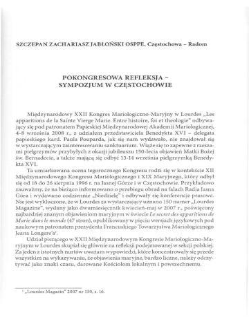 SZCZEPAN ZACHARIASZ JABŁOŃSKI OSPPE, Częstochowa – Radom POKONGRESOWA REFLEKSJA – SYMPOZJUM W CZĘSTOCHOWIE Międzynarodowy X X II Kongres Mariologiczno-Maryjny w Lourdes „Les apparitions de la Sainte Vierge Marie. Entre histoire, foi et theologie” odbywa jący się pod patronatem Papieskiej Międzynarodowej Akademii Mariologicznej, 4-8 września 2008 r., z udziałem przedstawiciela Benedykta X V I – delegata papieskiego kard. Paula Pouparda, jak się nam wydawało, nie znajdował się w wystarczającym zainteresowaniu sanktuarium. Wiąże się to zapewne z rzesza mi pielgrzymów przybyłych z okazji jubileuszu 150-lecia objawień Matki Bożej św. Bernadecie, a także mającą się odbyć 13-14 września pielgrzymką Benedy kta XVI. Ta umiarkowana ocena tegorocznego Kongresu rodzi się w kontekście XII Międzynarodowego Kongresu Mariologicznego i X IX Maryjnego, który odbył się od 18 do 26 sierpnia 1996 r. na Jasnej Górze i w Częstochowie. Przykładowo zauważmy, że na bieżąco informowano o przebiegu obrad na falach Radia Jasna Góra i wydawano codziennie „Niedzielę” i odbywały się konferencje prasowe. Nie jest wykluczone, że w Lourdes za wystarczający uznano 150 numer „Lourdes Magazine”, wydany jako dwumiesięcznik kwiecień-maj w 2007 r., poświęcony najbardziej znanym objawieniom maryjnym w świecie Le secret des apparitions de M arie dans le m onde (47 stron), opublikowany wpięciu wersjach językowych pod naukowym patronatem prezydenta Francuskiego Towarzystwa Mariologicznego Jeana Longere'a 1. Udział piszącego w X X II Międzynarodowym Kongresie Mariologiczno-Ma ryjnym w Lourdes skupiał się głównie na refleksji podejmowanej w sekcji polskiej. Za jeden z istotnych nurtów uważam wypowiedzi, które koncentrowały się przede wszystkim na wykazywaniu, że objawienia maryjne, bardzo liczne, należy odczy tywać jako znaki czasu, darowane Kościołom lokalnym i powszechnemu. 1 „Lourdes M agazin” 2007 nr 150, s. 16. 144 Z A C H A RIA SZ JA BŁO Ń SK I OSPPE Wyjątkowo znaczący był referat-komunikat Karola Klauzy M ariofan ie w ikonie kanonicznej2. Ta pogłębiona teologicznie refleksja, uzasadniająca per manentne objawianie się Boga poprzez ikony Bogarodzicy, zdaniem pastoralisty wymaga języka bardziej komunikatywnego dla ogółu wiernych. Z ciekawością i wielką uwagą uczestniczyłem w spotkaniu z ks. prof. René Laurentinem, wybitnym mariologiem, prezentującym niemalkompletny, obszerny zestaw objawień maryjnych, jakie miały miejsce w dziejach chrześcijaństwa3. Przy ustaleniu kryteriów, jakim i należy się kierować w rozpoznawaniu prywatnych objawień maryjnych, uderza wysiłek autora w odczytywaniu sensu objawień, noszących znamiona nieortodoksyjnych, a nawet wręcz fałszywych. Niech będzie wolno w tym kontekście przytoczyć wypowiedź prof. Lauren tina przy okazji udziału w XII Międzynarodowym Kongresie Mariologicznym w Częstochowie i na Jasnej Górze odnośnie do Obrazu Matki Bożej Jasnogór skiej: Ten obraz, czy też ikona – jest jakby objawieniem mówiącym jednocześnie o m a cierzyństwie M aryi Matki Boga i naszej i o Jej cierpieniu znaczonym bliznami, które ma wypisane na Obliczu. Jakże przejmujące są te blizny na Ikonie Jasnogórskiej. A ciemny kolor twarzy M aryi wyraża próby tego świata przeżywane w nocy duchowej. Dla mnie jest to objawienie niesłychanie wymowne. I choć jestem intelektualistą, bardziej jednak wierzę w intuicję i kontemplację, w przenikanie znaków niż ich wyjaśnienie w sposób werbalny czy abstrakcyjny. Jako teolog składam broń i poddaję się działaniu światła pły nącego przez M aryję z Jasnej Góry4. Mając na uwadze fakt zapowiedzianej publikacji wygłoszonych referatów, więcej uwagi poświęciłem celebracjom w sanktuarium, uczestnicząc w głównych Mszach świętych koncelebrowanych, jak również w wieczornych procesjach ró żańcowych. Nie wątpię, że procesja eucharystyczna służy uczestnikom do pogłę bienia postawy adoracji Najświętszego Sakramentu, a tym samym pogłębienia wiary w rzeczywistą obecność Chrystusa w Eucharystii. Z radością przeżywałem powszechność Kościoła, uczestnicząc w centralnej Eucharystii w niedzielę, 7 wrze śnia, której przewodniczył kard. Crescenzio Sepe z Neapolu w bazylice św. Piu sa X, wypełnionej ok. 20 tys. wiernych. Zdziwienie wywołało pominięcie homilii. Nie jest wykluczone, że uważano, iż w jakim ś stopniu zastępuje ją rozbudowana Modlitwa Jubileuszu 150-lecia Lourdes, wypowiedziana po procesji zakończonej przy Skale Massabielskiej u stóp figury Matki Bożej Niepokalanej. 2 Les a p p arition s d e la b ien h eu reu se vierge M arie. E ntre historie, f o i et theologie, Lourdes 4 -8 septembre 2008, C ittà del Vaticano 2008, s. 30. 3 R. Laurentin, P. Sbalchiero, D ictionnaire des „apparitions" d e la Vierge M arie – I nven taire des origines à n o s jou rs. M éthodologie, bilan in terdisciplinaire, prospective, Fayard 2008 (1428 stron). 4 R. Laurentin, K. Mroczek, P rzypatrując się „m aryjn ości”Ja n a P aw ła II, „Jasna Góra” 14 (1996) nr 12, s. 10. POKO N G RESO W A R EFLEK SJA – SY M P O Z JU M W C Z ĘSTO C H O W IE 145 Jakkolwiek celebracje liturgiczne i pozaliturgiczne dostarczają niewątpliwie specyficznych przeżyć, także wywołanych scenerią lurdzkiego sanktuarium, to jednak wydaje się, że wymagają one ewangelizacyjnego dopełnienia. Mając na uwadze fakt, że współcześni, zwłaszcza młodzi ludzie, bywają poszukiwaczami i kolekcjonerami przeżyć bez większego odniesienia do życia. Liczny udział przedstawicieli różnych narodów dostarcza niewątpliwie prze życia powszechności Kościoła, co ma wyjątkowe, jak się wydaje, znaczenie dla katolików żyjących w diasporach. Z radosnym zdziwieniem przyjąłem informację o 200 tys. wolontariuszy po sługujących w ciągu roku w Lourdes, nie tylko chorym, których liczbę ocenia się na 8