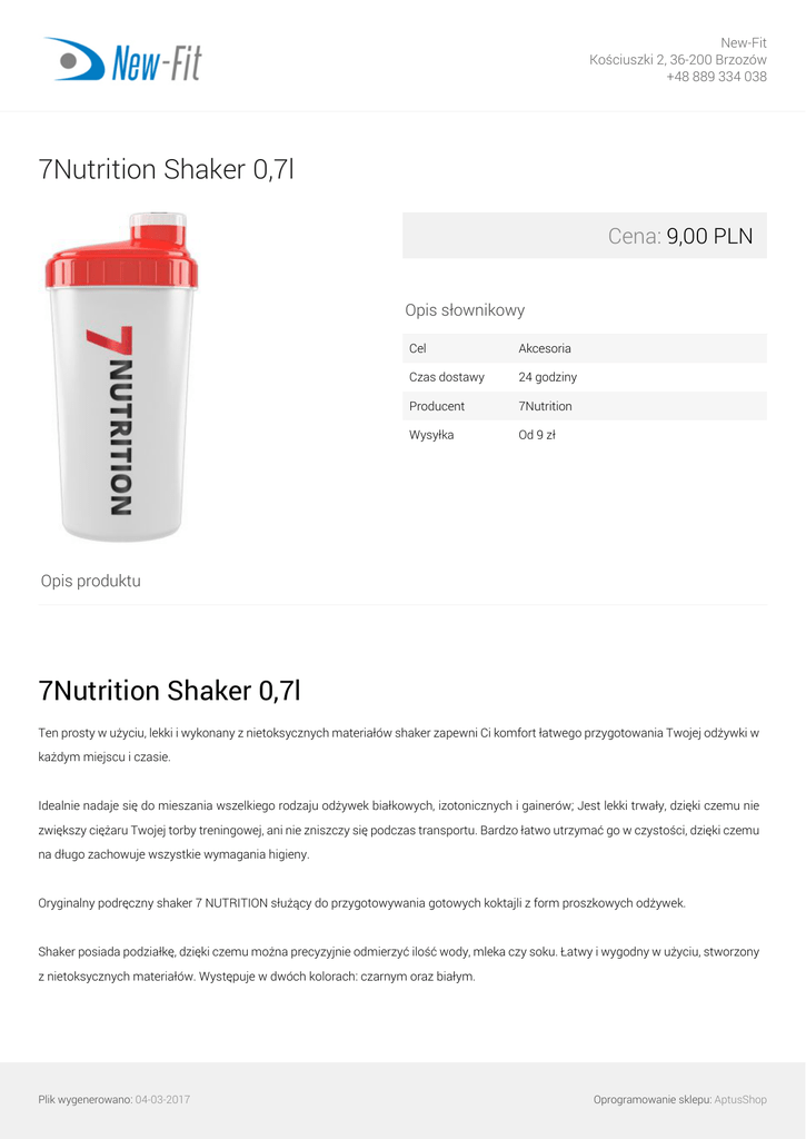 New-Fit Kościuszki 2, 36-200 Brzozów +48 889 334 038 7Nutrition Shaker 0,7l Cena: 9,00 PLN Opis słownikowy Cel Akcesoria Czas dostawy 24 godziny Producent 7Nutrition Wysyłka Od 9 zł Opis produktu 7Nutrition Shaker 0,7l Ten prosty w użyciu, lekki i wykonany z nietoksycznych materiałów shaker zapewni Ci komfort łatwego przygotowania Twojej odżywki w każdym miejscu i czasie. Idealnie nadaje się do mieszania wszelkiego rodzaju odżywek białkowych, izotonicznych i gainerów; Jest lekki trwały, dzięki czemu nie zwiększy ciężaru Twojej torby treningowej, ani nie zniszczy się podczas transportu. Bardzo łatwo utrzymać go w czystości, dzięki czemu na długo zachowuje wszystkie wymagania higieny. Oryginalny podręczny shaker 7 NUTRITION służący do przygotowywania gotowych koktajli z form proszkowych odżywek. Shaker posiada podziałkę, dzięki czemu można precyzyjnie odmierzyć ilość wody, mleka czy soku. Łatwy i wygodny w użyciu, stworzony z nietoksycznych materiałów. Występuje w dwóch kolorach: czarnym oraz białym. Plik wygenerowano: 04-03-2017 Oprogramowanie sklepu: AptusShop New-Fit Kościuszki 2, 36-200 Brzozów +48 889 334 038 Parametry Kolor Plik wygenerowano: 04-03-2017 Powered by TCPDF (www.tcpdf.org) Czarny, Biały Oprogramowanie sklepu: AptusShop